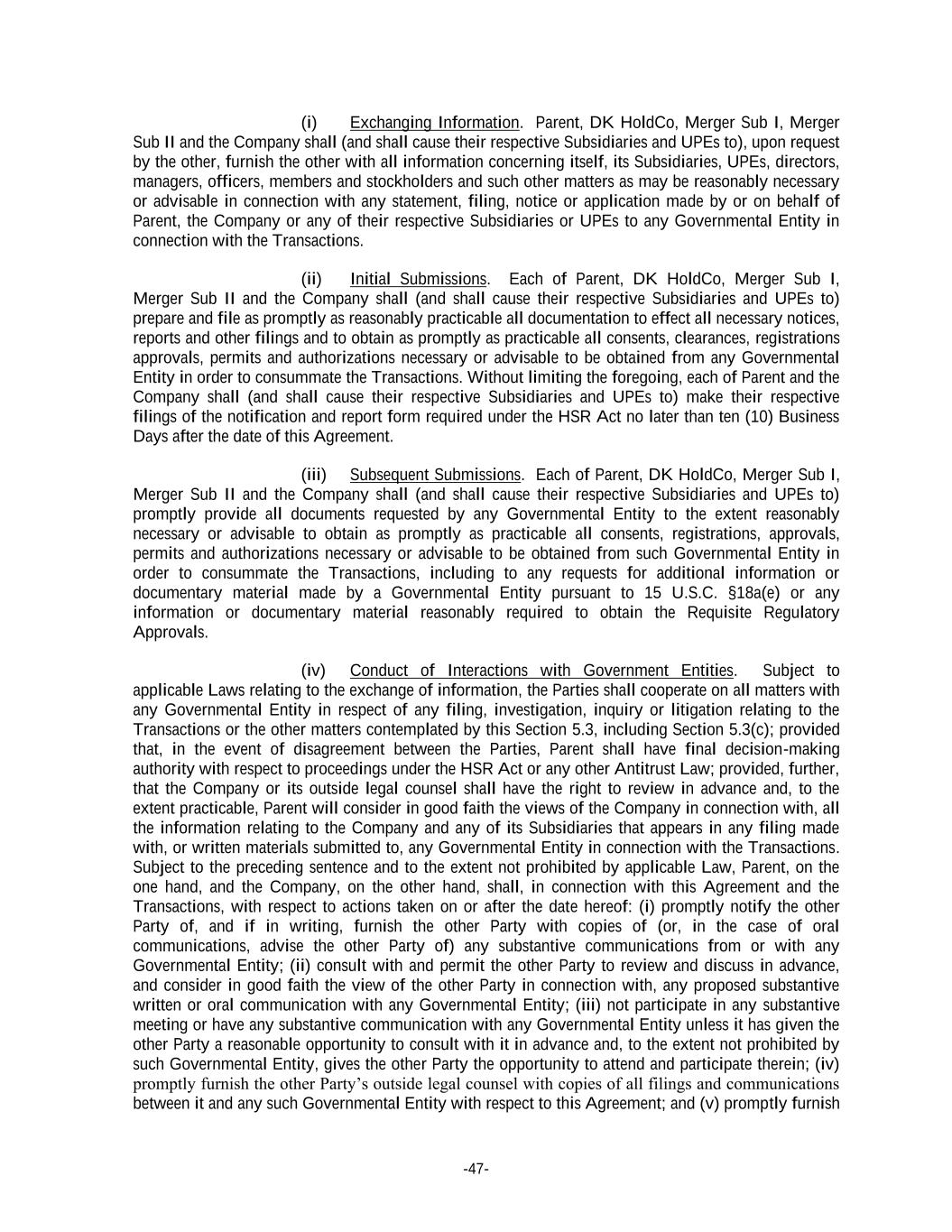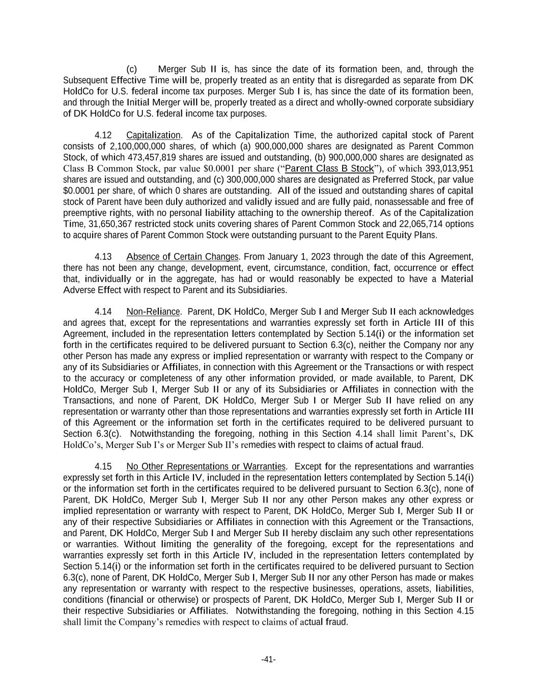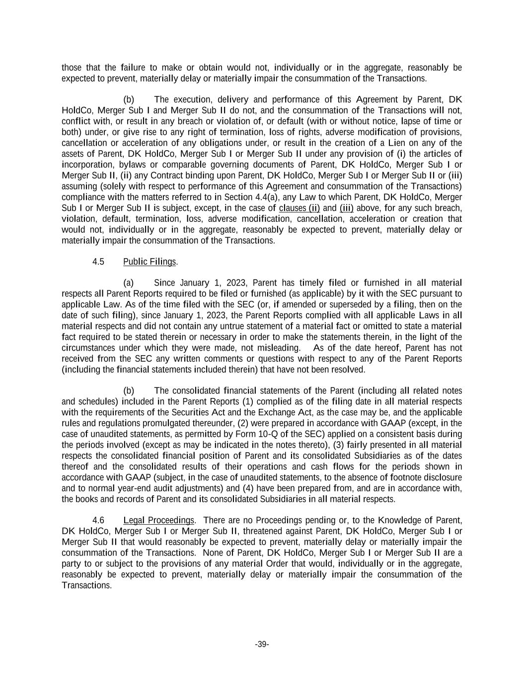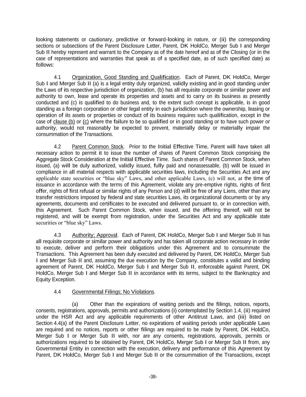 -3- and sufficiency of which are hereby acknowledged, accepted and agreed to, the Parties, intending to be legally bound, hereby agree as follows: ARTICLE I THE MERGERS; CLOSING; INITIAL EFFECTIVE TIME; SUBSEQUENT EFFECTIVE TIME; PAYMENTS AT CLOSING 1.1 The Initial Merger; Effects of the Initial Merger. On the terms and subject to the conditions set forth in this Agreement and the applicable provisions of the DGCL, (a) at the Initial Effective Time, Merger Sub I will be merged with and into the Company in accordance with the DGCL and the separate corporate existence of the Merger Sub I shall thereupon cease, (b) the Company will be the Initial Surviving Company in the Initial Merger and, from and after the Initial Effective Time, will be a direct wholly-owned subsidiary of DK HoldCo, which, in turn, will, from and after Initial Effective Time and until the Subsequent Effective Time, be a direct wholly-owned subsidiary of Parent, and the separate corporate existence of the Company with all of its rights, privileges, immunities, powers and franchises will continue unaffected by the Initial Merger as provided in the DGCL, and (c) from and after the Initial Effective Time, the Initial Merger shall have such other effects set forth in this Agreement and the applicable provisions of the DGCL. 1.2 The Subsequent Merger; Effects of the Subsequent Merger. On the terms and subject to the conditions set forth in this Agreement and the applicable provisions of the DGCL and the DLLCA, (a) immediately following the effectiveness of the Initial Merger, the Initial Surviving Company will be merged with and into Merger Sub II in accordance with the DGCL and the DLLCA and the separate corporate existence of Initial Surviving Company will thereupon cease, (b) Merger Sub II will be the Subsequent Surviving Company in the Subsequent Merger and, from and after the Subsequent Effective Time, will be a direct wholly-owned limited liability company subsidiary of DK HoldCo, which, in turn, will, from and after Subsequent Effective Time, be a direct wholly-owned subsidiary of Parent and the separate existence of Merger Sub II with all of its rights, privileges, immunities, powers and franchises will continue unaffected by the Subsequent Merger, as provided in the DGCL and the DLLCA, and (c) from and after the Subsequent Effective Time, the Subsequent Merger will have the effects set forth in this Agreement and the applicable provisions of the DGCL and the DLLCA. 1.3 Closing. The closing of the Initial Merger (the “Closing”) shall take place by remote communication and by the exchange of signatures by electronic transmission and to the extent a physical location is required or exchange by electronic transmission is not practicable, at the offices of Sullivan & Cromwell LLP, 125 Broad Street, New York, New York 10004, at 9:00 a.m. prevailing Eastern Time on the third (3rd) Business Day following the day on which the last to be satisfied or waived of the conditions set forth in Article VI (other than those conditions that by their nature are to be satisfied or waived at the Closing, but subject to the satisfaction or waiver of those conditions) have been satisfied or waived in accordance with this Agreement or at such other date, time or place (including by means of remote communication) as the Parties may mutually agree in writing (the date on which the Closing actually occurs, the “Closing Date”). 1.4 Initial Merger Effective Time and Subsequent Merger Effective Time. On the date of the Closing, the Company and DK HoldCo shall (a) cause the certificate of merger relating to the Initial Merger (the “Certificate of Initial Merger”) to be executed and filed with the Secretary of State of the State of Delaware as provided in Section 251 of the DGCL and (b) deliver and tender, or cause to be delivered or tendered, as applicable, any Taxes and fees and make all other filings or recordings required under the DGCL in connection with such filing of the Certificate of Initial Merger and the consummation of the Initial Merger, which shall become effective at the date and time when the Certificate of Initial
