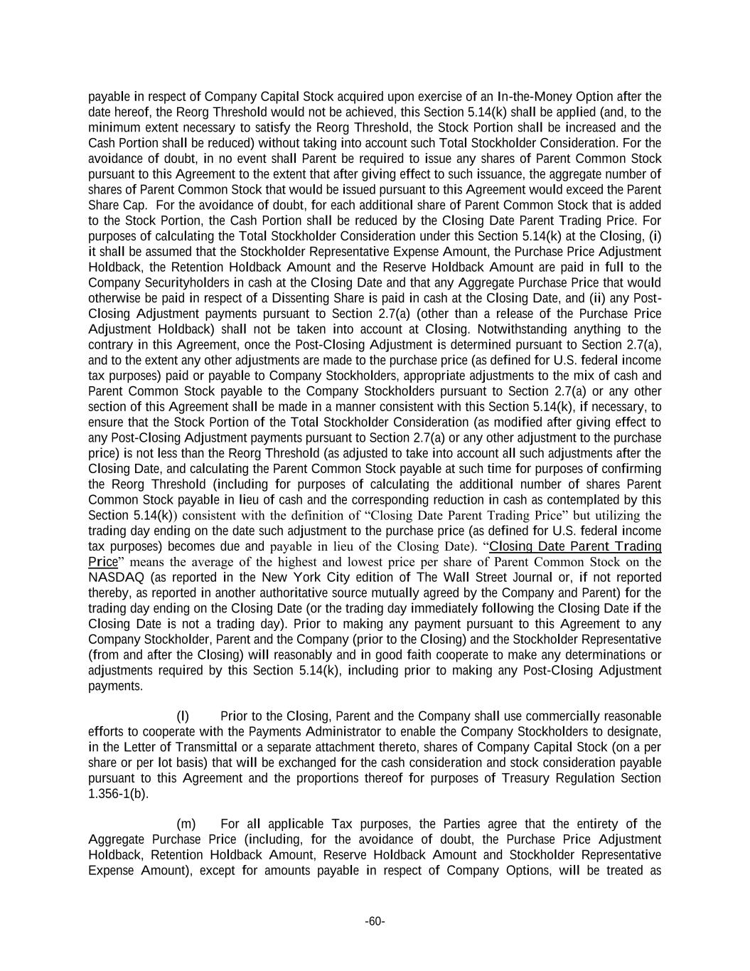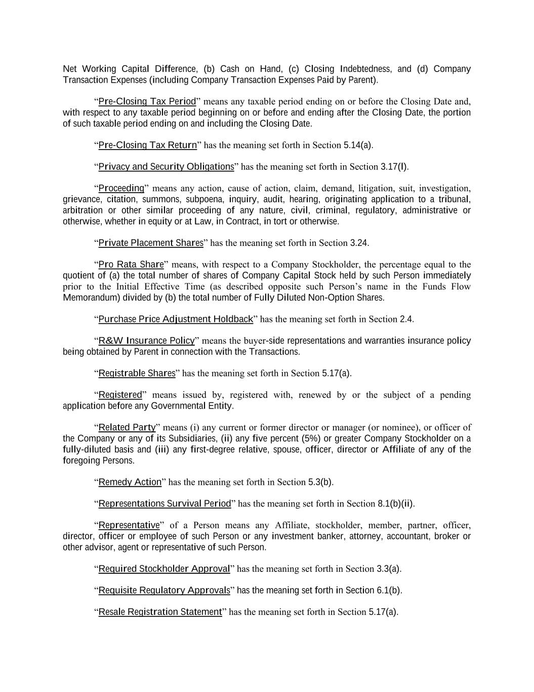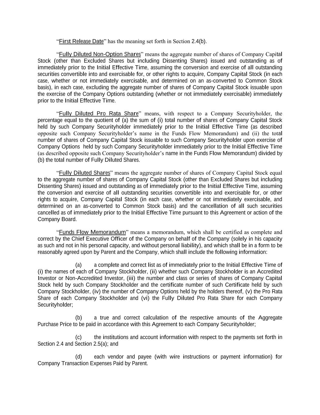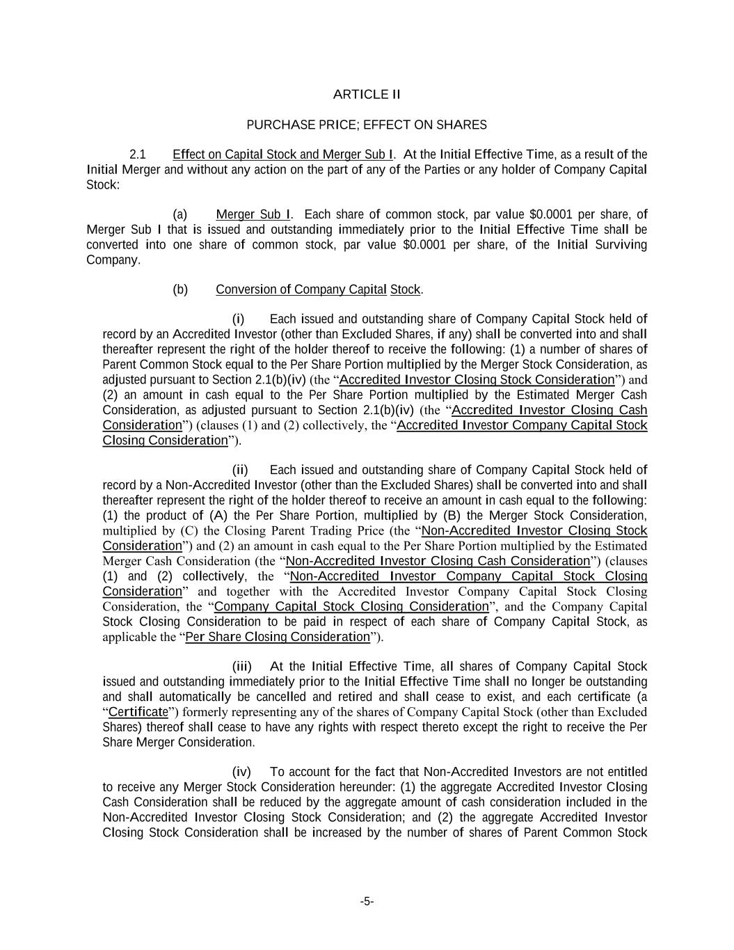 -5- ARTICLE II PURCHASE PRICE; EFFECT ON SHARES 2.1 Effect on Capital Stock and Merger Sub I. At the Initial Effective Time, as a result of the Initial Merger and without any action on the part of any of the Parties or any holder of Company Capital Stock: (a) Merger Sub I. Each share of common stock, par value $0.0001 per share, of Merger Sub I that is issued and outstanding immediately prior to the Initial Effective Time shall be converted into one share of common stock, par value $0.0001 per share, of the Initial Surviving Company. (b) Conversion of Company Capital Stock. (i) Each issued and outstanding share of Company Capital Stock held of record by an Accredited Investor (other than Excluded Shares, if any) shall be converted into and shall thereafter represent the right of the holder thereof to receive the following: (1) a number of shares of Parent Common Stock equal to the Per Share Portion multiplied by the Merger Stock Consideration, as adjusted pursuant to Section 2.1(b)(iv) (the “Accredited Investor Closing Stock Consideration”) and (2) an amount in cash equal to the Per Share Portion multiplied by the Estimated Merger Cash Consideration, as adjusted pursuant to Section 2.1(b)(iv) (the “Accredited Investor Closing Cash Consideration”) (clauses (1) and (2) collectively, the “Accredited Investor Company Capital Stock Closing Consideration”). (ii) Each issued and outstanding share of Company Capital Stock held of record by a Non-Accredited Investor (other than the Excluded Shares) shall be converted into and shall thereafter represent the right of the holder thereof to receive an amount in cash equal to the following: (1) the product of (A) the Per Share Portion, multiplied by (B) the Merger Stock Consideration, multiplied by (C) the Closing Parent Trading Price (the “Non-Accredited Investor Closing Stock Consideration”) and (2) an amount in cash equal to the Per Share Portion multiplied by the Estimated Merger Cash Consideration (the “Non-Accredited Investor Closing Cash Consideration”) (clauses (1) and (2) collectively, the “Non-Accredited Investor Company Capital Stock Closing Consideration” and together with the Accredited Investor Company Capital Stock Closing Consideration, the “Company Capital Stock Closing Consideration”, and the Company Capital Stock Closing Consideration to be paid in respect of each share of Company Capital Stock, as applicable the “Per Share Closing Consideration”). (iii) At the Initial Effective Time, all shares of Company Capital Stock issued and outstanding immediately prior to the Initial Effective Time shall no longer be outstanding and shall automatically be cancelled and retired and shall cease to exist, and each certificate (a “Certificate”) formerly representing any of the shares of Company Capital Stock (other than Excluded Shares) thereof shall cease to have any rights with respect thereto except the right to receive the Per Share Merger Consideration. (iv) To account for the fact that Non-Accredited Investors are not entitled to receive any Merger Stock Consideration hereunder: (1) the aggregate Accredited Investor Closing Cash Consideration shall be reduced by the aggregate amount of cash consideration included in the Non-Accredited Investor Closing Stock Consideration; and (2) the aggregate Accredited Investor Closing Stock Consideration shall be increased by the number of shares of Parent Common Stock