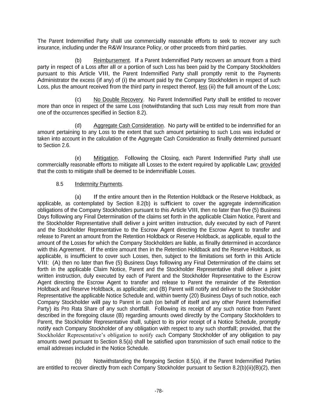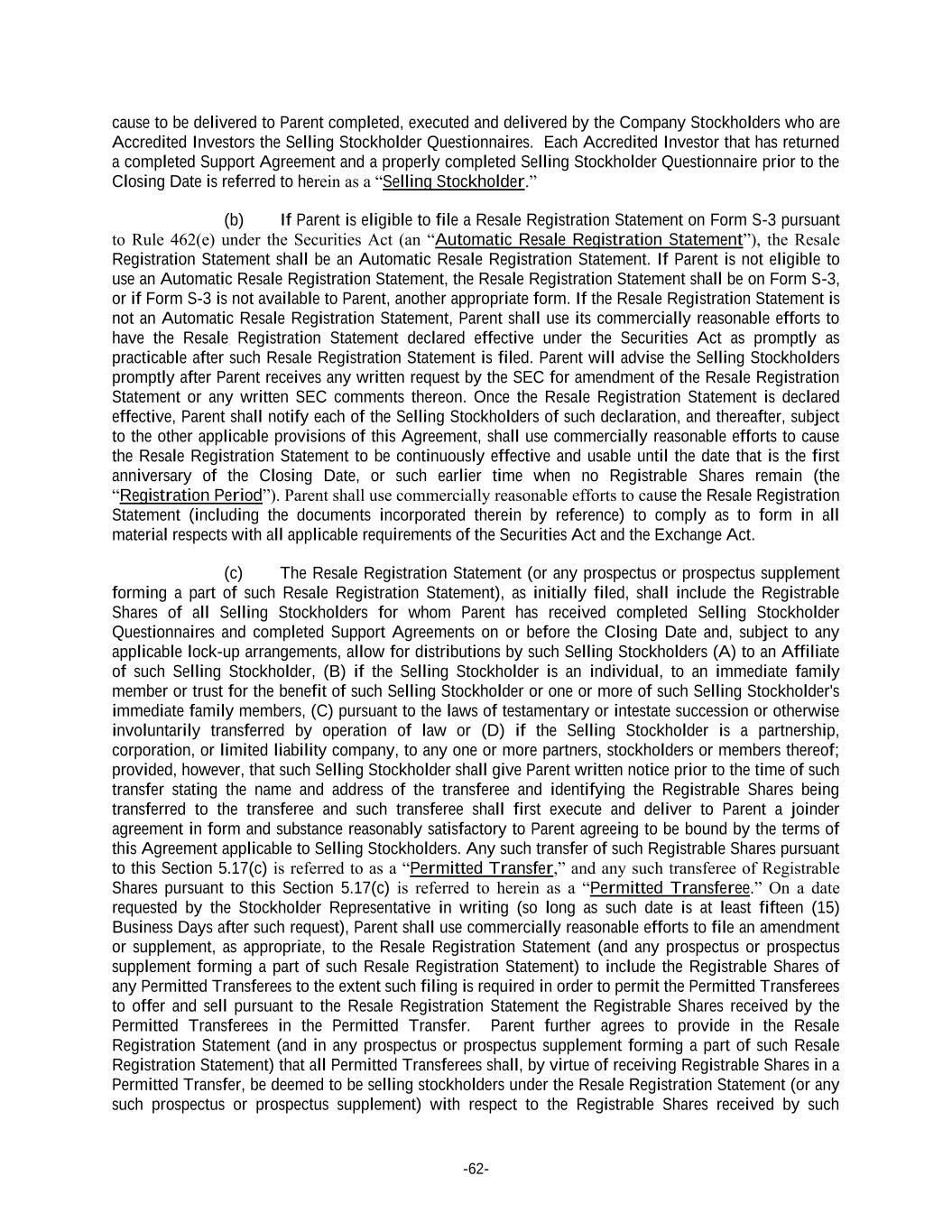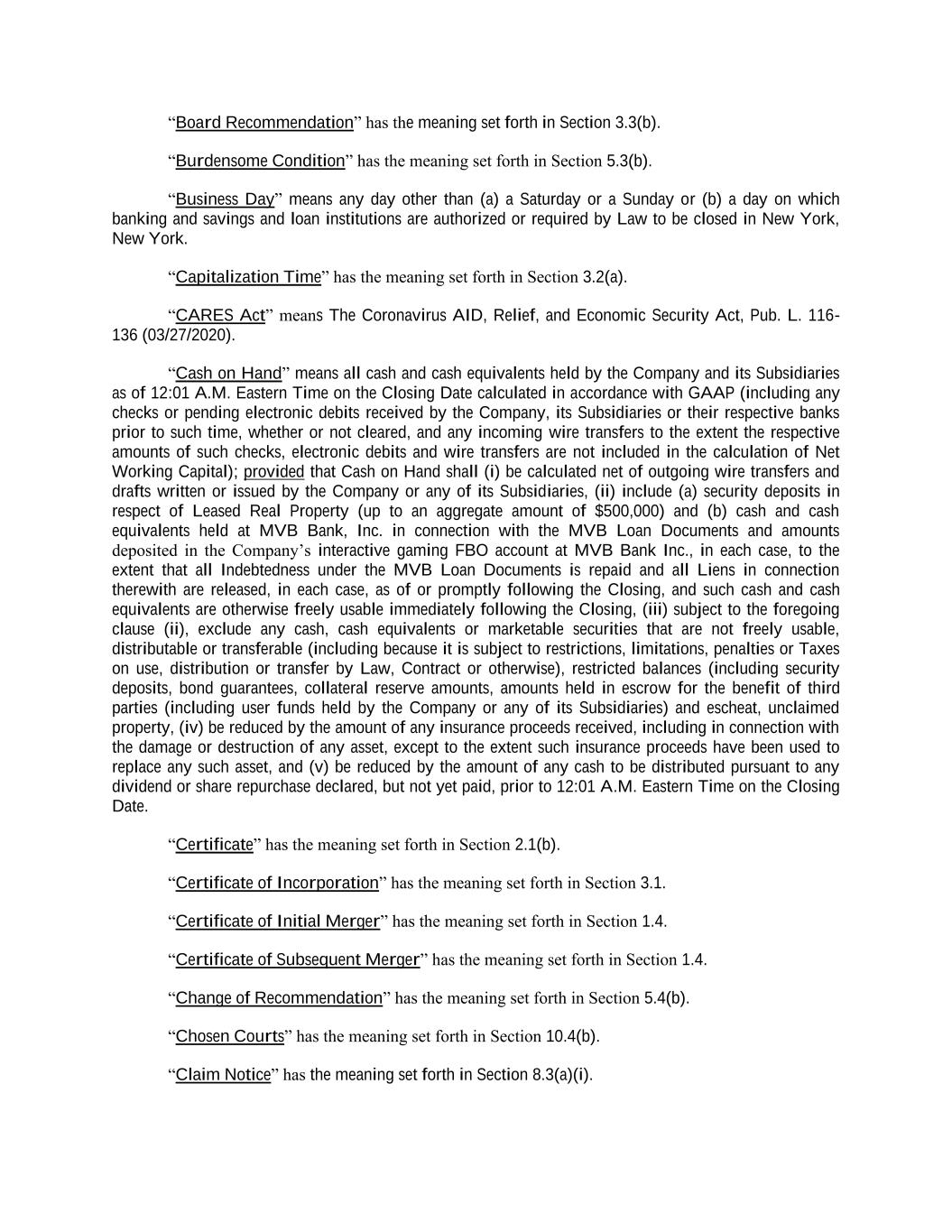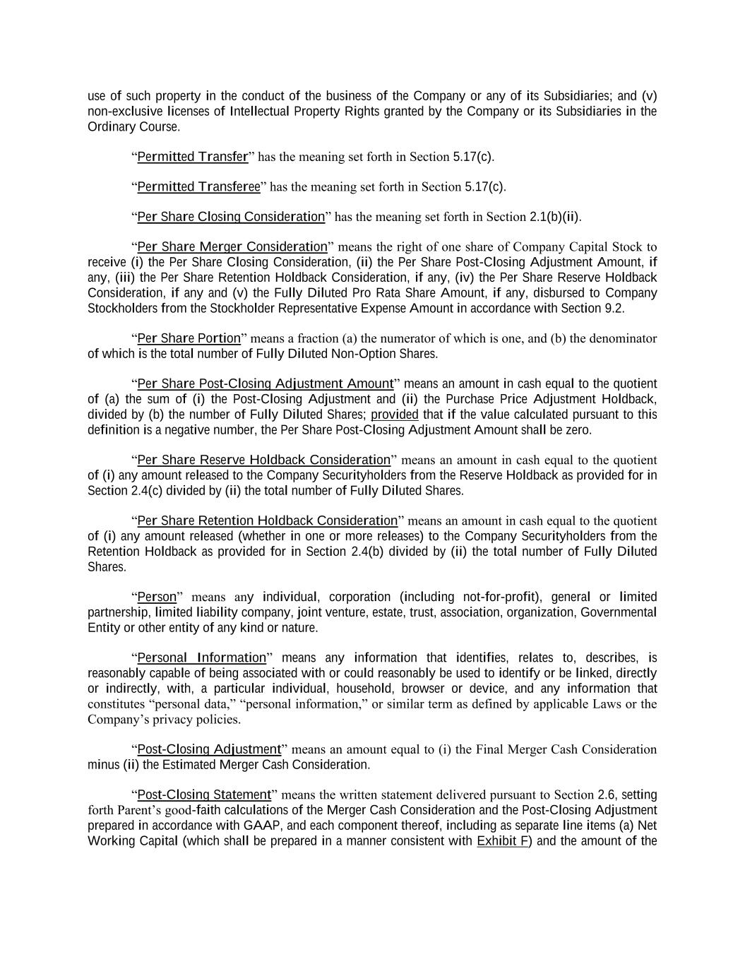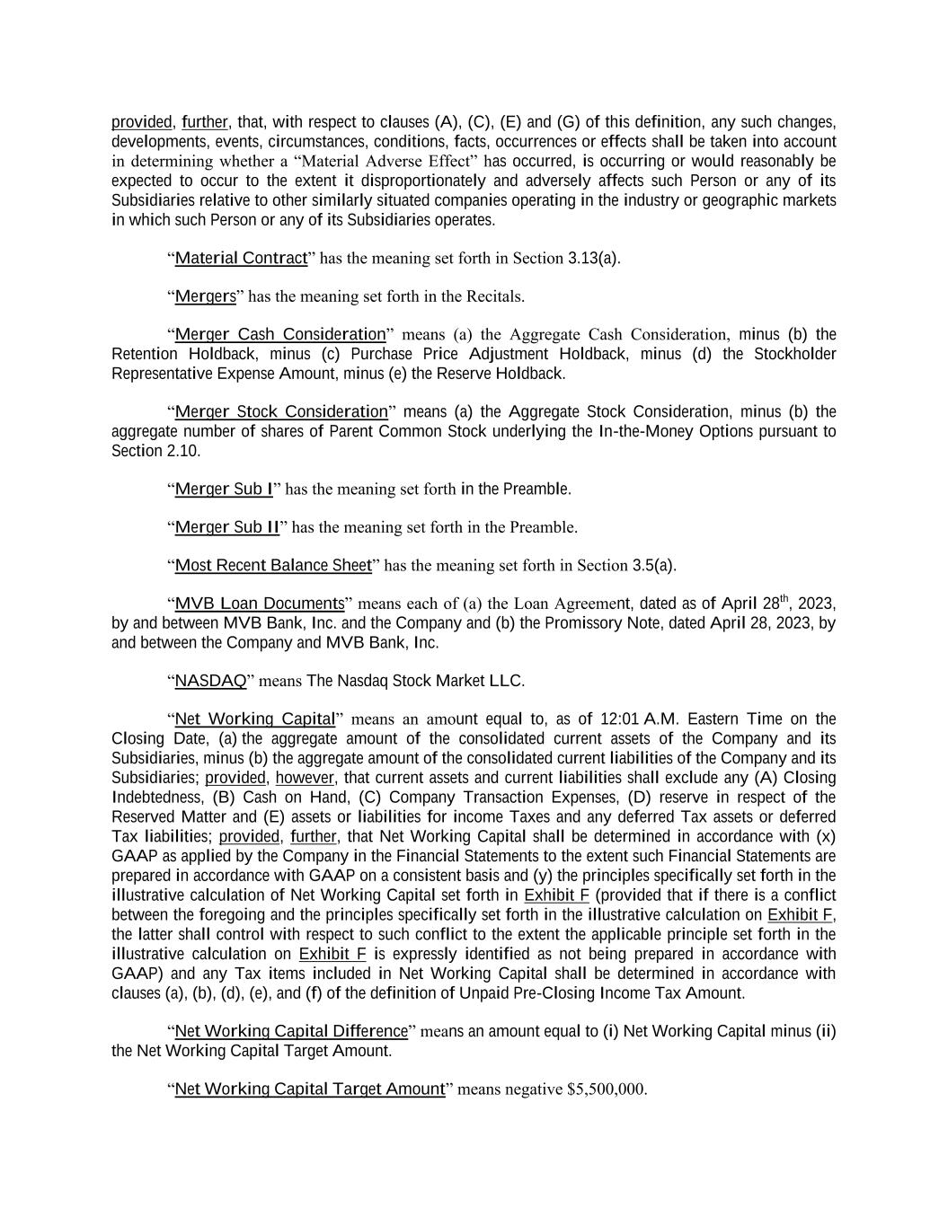 -5- ARTICLE II PURCHASE PRICE; EFFECT ON SHARES 2.1 Effect on Capital Stock and Merger Sub I. At the Initial Effective Time, as a result of the Initial Merger and without any action on the part of any of the Parties or any holder of Company Capital Stock: (a) Merger Sub I. Each share of common stock, par value $0.0001 per share, of Merger Sub I that is issued and outstanding immediately prior to the Initial Effective Time shall be converted into one share of common stock, par value $0.0001 per share, of the Initial Surviving Company. (b) Conversion of Company Capital Stock. (i) Each issued and outstanding share of Company Capital Stock held of record by an Accredited Investor (other than Excluded Shares, if any) shall be converted into and shall thereafter represent the right of the holder thereof to receive the following: (1) a number of shares of Parent Common Stock equal to the Per Share Portion multiplied by the Merger Stock Consideration, as adjusted pursuant to Section 2.1(b)(iv) (the “Accredited Investor Closing Stock Consideration”) and (2) an amount in cash equal to the Per Share Portion multiplied by the Estimated Merger Cash Consideration, as adjusted pursuant to Section 2.1(b)(iv) (the “Accredited Investor Closing Cash Consideration”) (clauses (1) and (2) collectively, the “Accredited Investor Company Capital Stock Closing Consideration”). (ii) Each issued and outstanding share of Company Capital Stock held of record by a Non-Accredited Investor (other than the Excluded Shares) shall be converted into and shall thereafter represent the right of the holder thereof to receive an amount in cash equal to the following: (1) the product of (A) the Per Share Portion, multiplied by (B) the Merger Stock Consideration, multiplied by (C) the Closing Parent Trading Price (the “Non-Accredited Investor Closing Stock Consideration”) and (2) an amount in cash equal to the Per Share Portion multiplied by the Estimated Merger Cash Consideration (the “Non-Accredited Investor Closing Cash Consideration”) (clauses (1) and (2) collectively, the “Non-Accredited Investor Company Capital Stock Closing Consideration” and together with the Accredited Investor Company Capital Stock Closing Consideration, the “Company Capital Stock Closing Consideration”, and the Company Capital Stock Closing Consideration to be paid in respect of each share of Company Capital Stock, as applicable the “Per Share Closing Consideration”). (iii) At the Initial Effective Time, all shares of Company Capital Stock issued and outstanding immediately prior to the Initial Effective Time shall no longer be outstanding and shall automatically be cancelled and retired and shall cease to exist, and each certificate (a “Certificate”) formerly representing any of the shares of Company Capital Stock (other than Excluded Shares) thereof shall cease to have any rights with respect thereto except the right to receive the Per Share Merger Consideration. (iv) To account for the fact that Non-Accredited Investors are not entitled to receive any Merger Stock Consideration hereunder: (1) the aggregate Accredited Investor Closing Cash Consideration shall be reduced by the aggregate amount of cash consideration included in the Non-Accredited Investor Closing Stock Consideration; and (2) the aggregate Accredited Investor Closing Stock Consideration shall be increased by the number of shares of Parent Common Stock