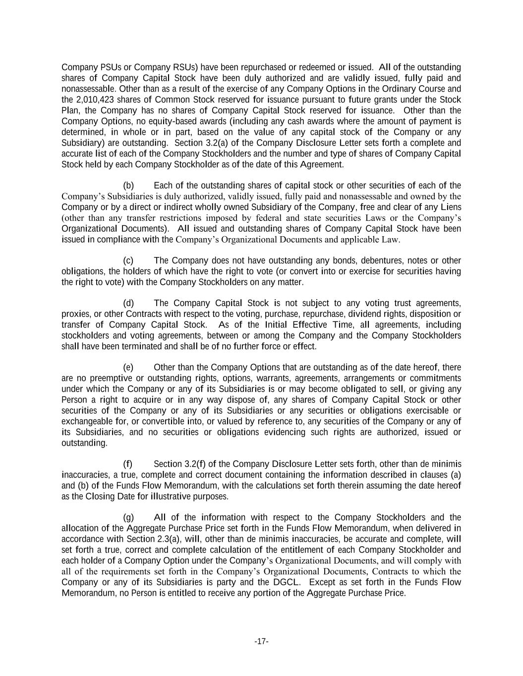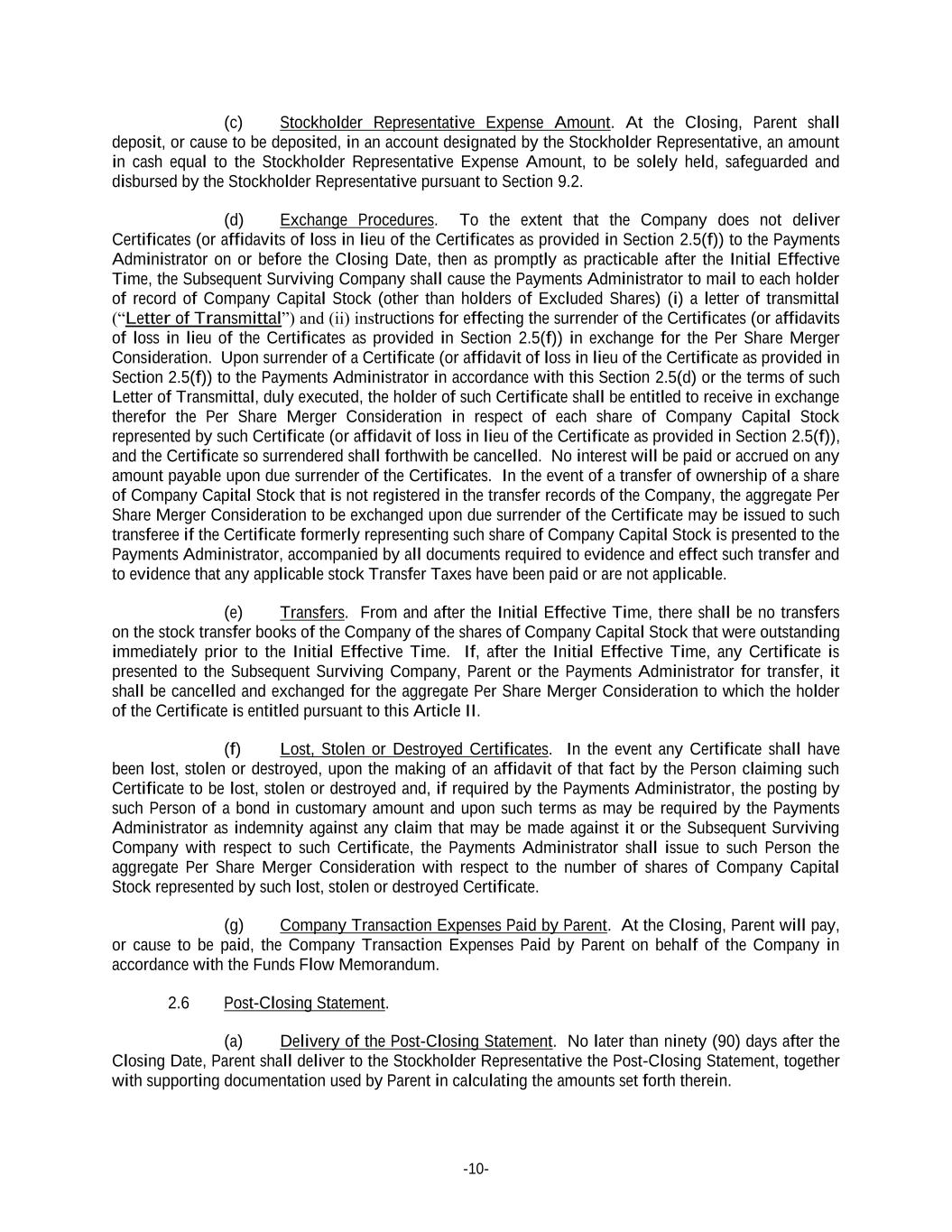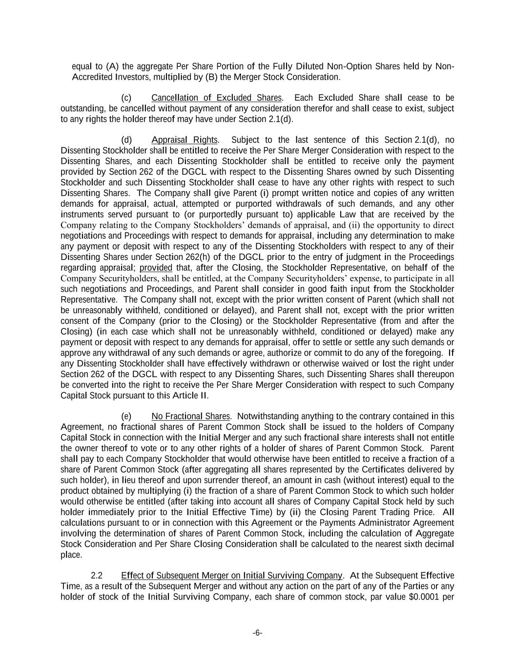 -6- equal to (A) the aggregate Per Share Portion of the Fully Diluted Non-Option Shares held by Non- Accredited Investors, multiplied by (B) the Merger Stock Consideration. (c) Cancellation of Excluded Shares. Each Excluded Share shall cease to be outstanding, be cancelled without payment of any consideration therefor and shall cease to exist, subject to any rights the holder thereof may have under Section 2.1(d). (d) Appraisal Rights. Subject to the last sentence of this Section 2.1(d), no Dissenting Stockholder shall be entitled to receive the Per Share Merger Consideration with respect to the Dissenting Shares, and each Dissenting Stockholder shall be entitled to receive only the payment provided by Section 262 of the DGCL with respect to the Dissenting Shares owned by such Dissenting Stockholder and such Dissenting Stockholder shall cease to have any other rights with respect to such Dissenting Shares. The Company shall give Parent (i) prompt written notice and copies of any written demands for appraisal, actual, attempted or purported withdrawals of such demands, and any other instruments served pursuant to (or purportedly pursuant to) applicable Law that are received by the Company relating to the Company Stockholders’ demands of appraisal, and (ii) the opportunity to direct negotiations and Proceedings with respect to demands for appraisal, including any determination to make any payment or deposit with respect to any of the Dissenting Stockholders with respect to any of their Dissenting Shares under Section 262(h) of the DGCL prior to the entry of judgment in the Proceedings regarding appraisal; provided that, after the Closing, the Stockholder Representative, on behalf of the Company Securityholders, shall be entitled, at the Company Securityholders’ expense, to participate in all such negotiations and Proceedings, and Parent shall consider in good faith input from the Stockholder Representative. The Company shall not, except with the prior written consent of Parent (which shall not be unreasonably withheld, conditioned or delayed), and Parent shall not, except with the prior written consent of the Company (prior to the Closing) or the Stockholder Representative (from and after the Closing) (in each case which shall not be unreasonably withheld, conditioned or delayed) make any payment or deposit with respect to any demands for appraisal, offer to settle or settle any such demands or approve any withdrawal of any such demands or agree, authorize or commit to do any of the foregoing. If any Dissenting Stockholder shall have effectively withdrawn or otherwise waived or lost the right under Section 262 of the DGCL with respect to any Dissenting Shares, such Dissenting Shares shall thereupon be converted into the right to receive the Per Share Merger Consideration with respect to such Company Capital Stock pursuant to this Article II. (e) No Fractional Shares. Notwithstanding anything to the contrary contained in this Agreement, no fractional shares of Parent Common Stock shall be issued to the holders of Company Capital Stock in connection with the Initial Merger and any such fractional share interests shall not entitle the owner thereof to vote or to any other rights of a holder of shares of Parent Common Stock. Parent shall pay to each Company Stockholder that would otherwise have been entitled to receive a fraction of a share of Parent Common Stock (after aggregating all shares represented by the Certificates delivered by such holder), in lieu thereof and upon surrender thereof, an amount in cash (without interest) equal to the product obtained by multiplying (i) the fraction of a share of Parent Common Stock to which such holder would otherwise be entitled (after taking into account all shares of Company Capital Stock held by such holder immediately prior to the Initial Effective Time) by (ii) the Closing Parent Trading Price. All calculations pursuant to or in connection with this Agreement or the Payments Administrator Agreement involving the determination of shares of Parent Common Stock, including the calculation of Aggregate Stock Consideration and Per Share Closing Consideration shall be calculated to the nearest sixth decimal place. 2.2 Effect of Subsequent Merger on Initial Surviving Company. At the Subsequent Effective Time, as a result of the Subsequent Merger and without any action on the part of any of the Parties or any holder of stock of the Initial Surviving Company, each share of common stock, par value $0.0001 per
