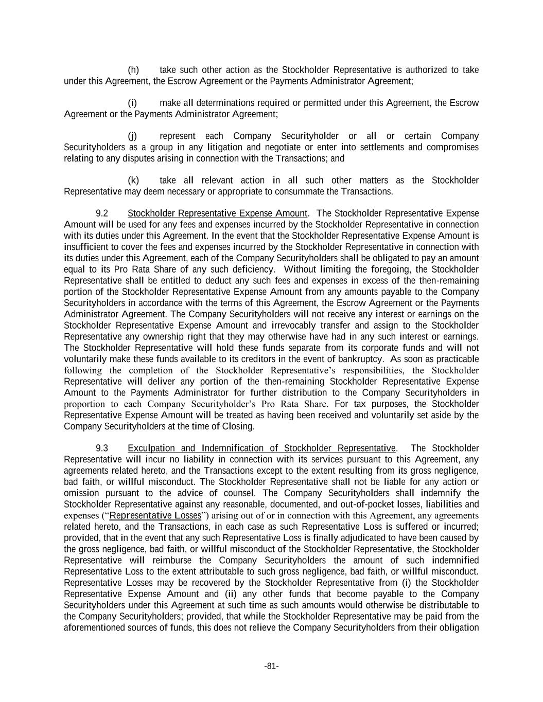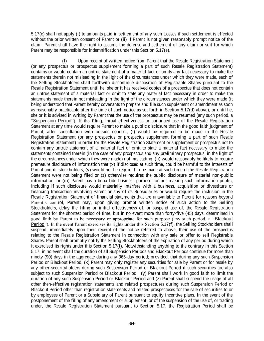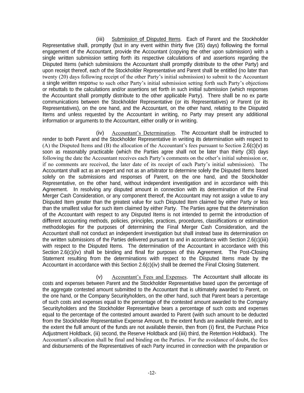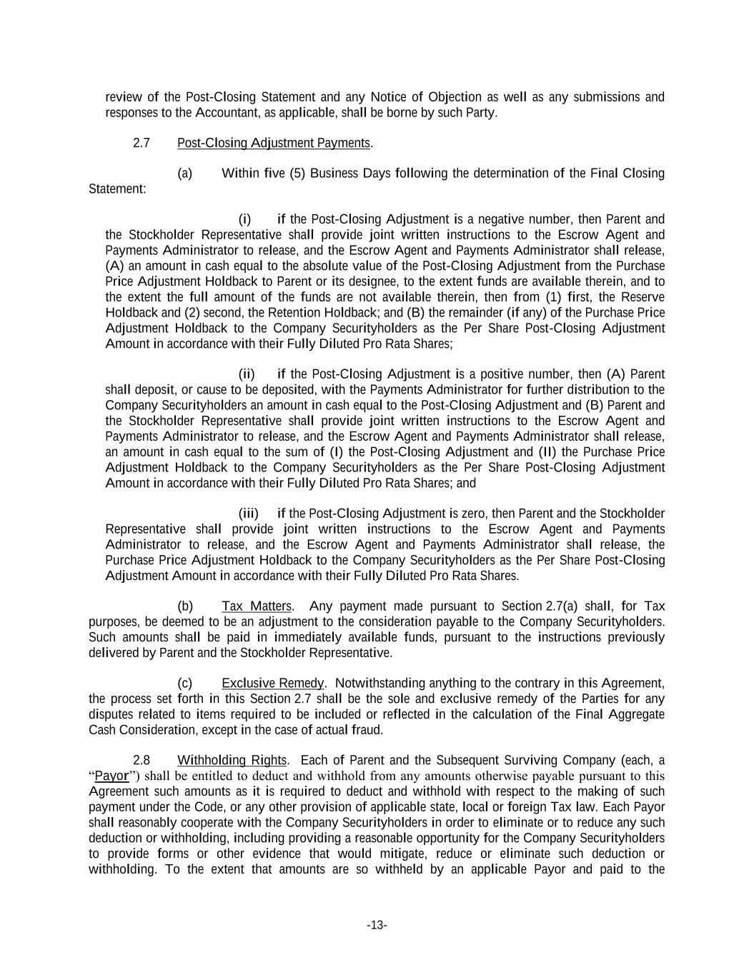 -6- equal to (A) the aggregate Per Share Portion of the Fully Diluted Non-Option Shares held by Non- Accredited Investors, multiplied by (B) the Merger Stock Consideration. (c) Cancellation of Excluded Shares. Each Excluded Share shall cease to be outstanding, be cancelled without payment of any consideration therefor and shall cease to exist, subject to any rights the holder thereof may have under Section 2.1(d). (d) Appraisal Rights. Subject to the last sentence of this Section 2.1(d), no Dissenting Stockholder shall be entitled to receive the Per Share Merger Consideration with respect to the Dissenting Shares, and each Dissenting Stockholder shall be entitled to receive only the payment provided by Section 262 of the DGCL with respect to the Dissenting Shares owned by such Dissenting Stockholder and such Dissenting Stockholder shall cease to have any other rights with respect to such Dissenting Shares. The Company shall give Parent (i) prompt written notice and copies of any written demands for appraisal, actual, attempted or purported withdrawals of such demands, and any other instruments served pursuant to (or purportedly pursuant to) applicable Law that are received by the Company relating to the Company Stockholders’ demands of appraisal, and (ii) the opportunity to direct negotiations and Proceedings with respect to demands for appraisal, including any determination to make any payment or deposit with respect to any of the Dissenting Stockholders with respect to any of their Dissenting Shares under Section 262(h) of the DGCL prior to the entry of judgment in the Proceedings regarding appraisal; provided that, after the Closing, the Stockholder Representative, on behalf of the Company Securityholders, shall be entitled, at the Company Securityholders’ expense, to participate in all such negotiations and Proceedings, and Parent shall consider in good faith input from the Stockholder Representative. The Company shall not, except with the prior written consent of Parent (which shall not be unreasonably withheld, conditioned or delayed), and Parent shall not, except with the prior written consent of the Company (prior to the Closing) or the Stockholder Representative (from and after the Closing) (in each case which shall not be unreasonably withheld, conditioned or delayed) make any payment or deposit with respect to any demands for appraisal, offer to settle or settle any such demands or approve any withdrawal of any such demands or agree, authorize or commit to do any of the foregoing. If any Dissenting Stockholder shall have effectively withdrawn or otherwise waived or lost the right under Section 262 of the DGCL with respect to any Dissenting Shares, such Dissenting Shares shall thereupon be converted into the right to receive the Per Share Merger Consideration with respect to such Company Capital Stock pursuant to this Article II. (e) No Fractional Shares. Notwithstanding anything to the contrary contained in this Agreement, no fractional shares of Parent Common Stock shall be issued to the holders of Company Capital Stock in connection with the Initial Merger and any such fractional share interests shall not entitle the owner thereof to vote or to any other rights of a holder of shares of Parent Common Stock. Parent shall pay to each Company Stockholder that would otherwise have been entitled to receive a fraction of a share of Parent Common Stock (after aggregating all shares represented by the Certificates delivered by such holder), in lieu thereof and upon surrender thereof, an amount in cash (without interest) equal to the product obtained by multiplying (i) the fraction of a share of Parent Common Stock to which such holder would otherwise be entitled (after taking into account all shares of Company Capital Stock held by such holder immediately prior to the Initial Effective Time) by (ii) the Closing Parent Trading Price. All calculations pursuant to or in connection with this Agreement or the Payments Administrator Agreement involving the determination of shares of Parent Common Stock, including the calculation of Aggregate Stock Consideration and Per Share Closing Consideration shall be calculated to the nearest sixth decimal place. 2.2 Effect of Subsequent Merger on Initial Surviving Company. At the Subsequent Effective Time, as a result of the Subsequent Merger and without any action on the part of any of the Parties or any holder of stock of the Initial Surviving Company, each share of common stock, par value $0.0001 per