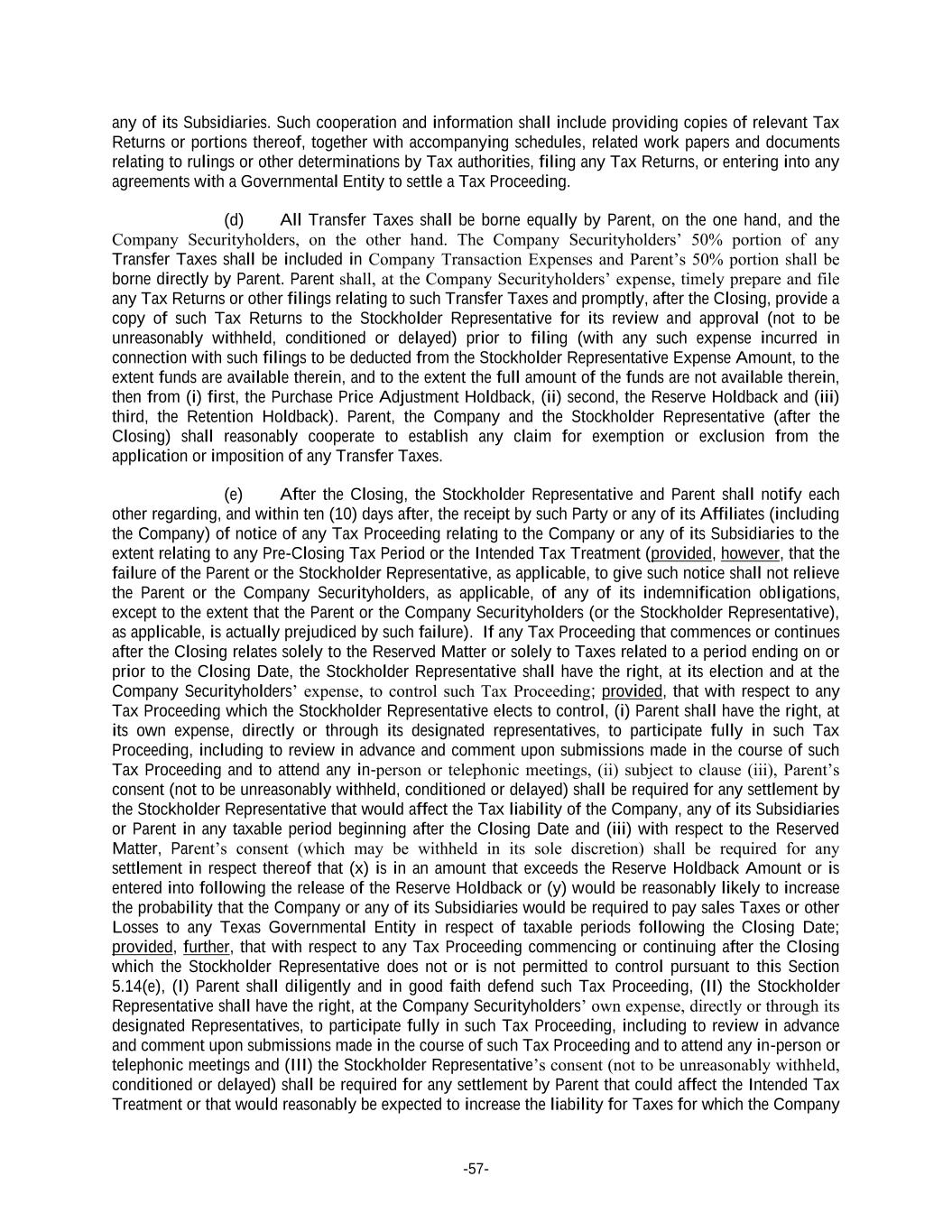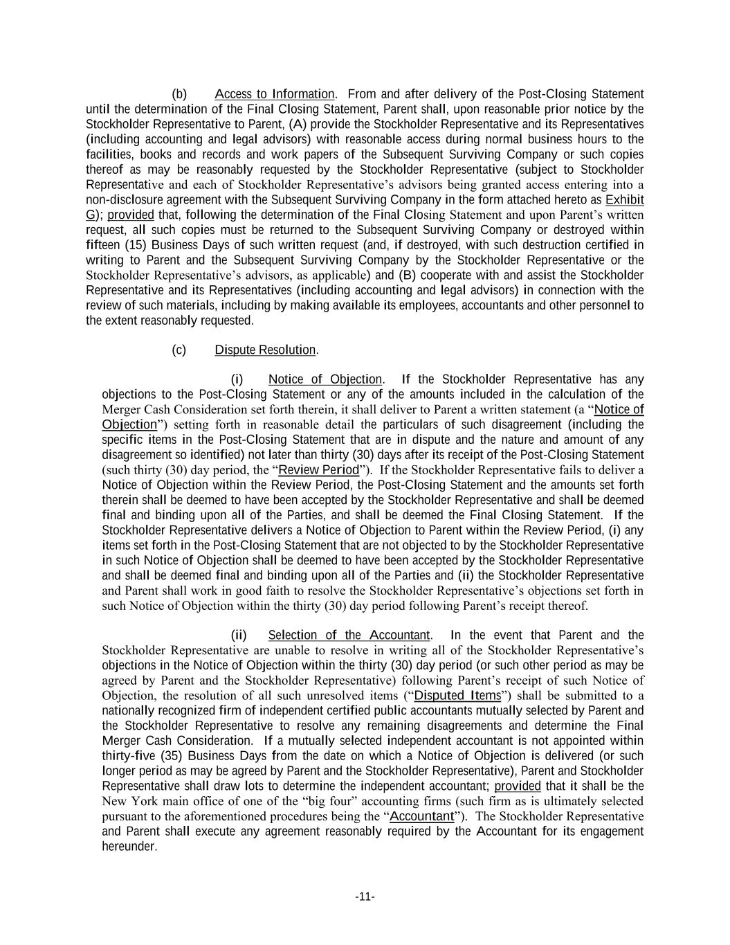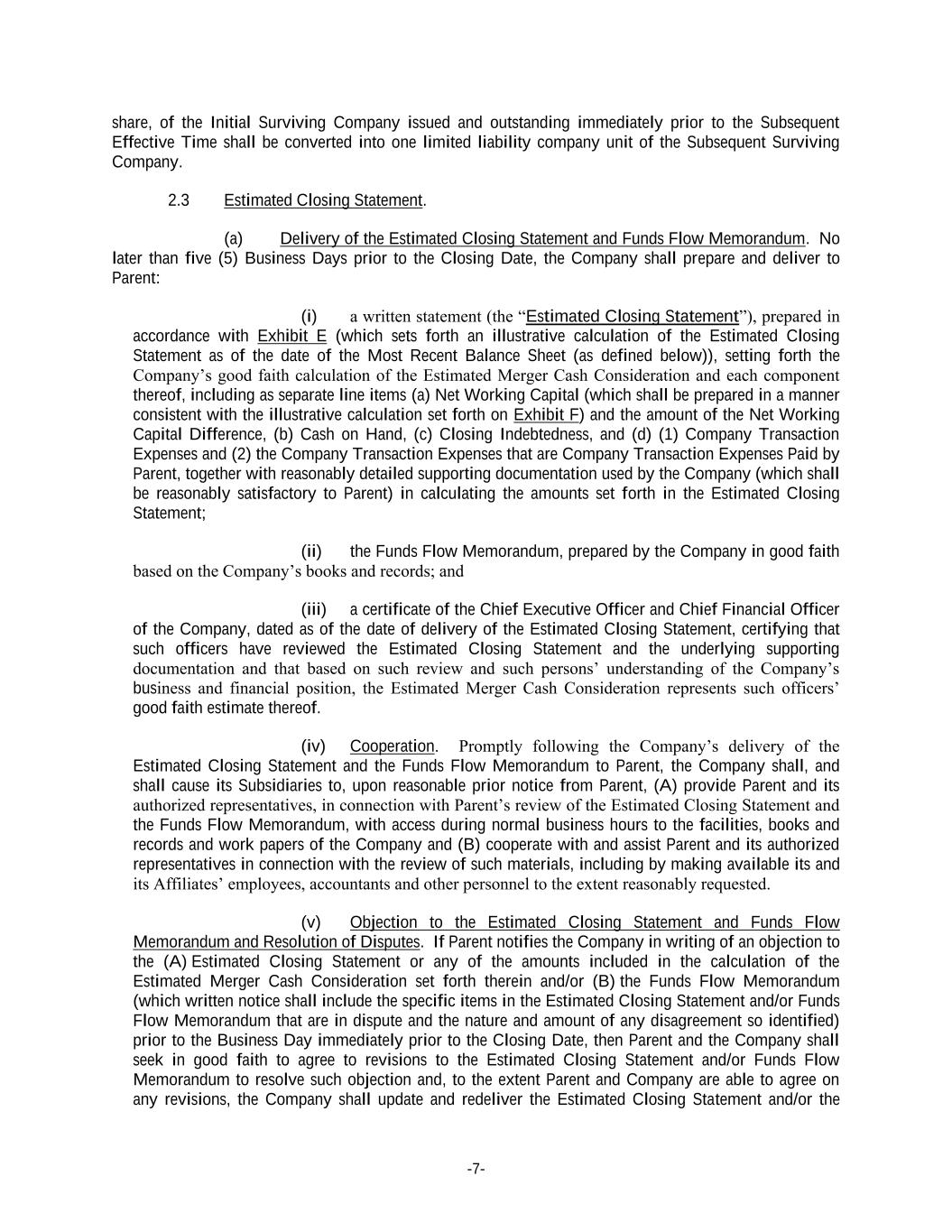 -7- share, of the Initial Surviving Company issued and outstanding immediately prior to the Subsequent Effective Time shall be converted into one limited liability company unit of the Subsequent Surviving Company. 2.3 Estimated Closing Statement. (a) Delivery of the Estimated Closing Statement and Funds Flow Memorandum. No later than five (5) Business Days prior to the Closing Date, the Company shall prepare and deliver to Parent: (i) a written statement (the “Estimated Closing Statement”), prepared in accordance with Exhibit E (which sets forth an illustrative calculation of the Estimated Closing Statement as of the date of the Most Recent Balance Sheet (as defined below)), setting forth the Company’s good faith calculation of the Estimated Merger Cash Consideration and each component thereof, including as separate line items (a) Net Working Capital (which shall be prepared in a manner consistent with the illustrative calculation set forth on Exhibit F) and the amount of the Net Working Capital Difference, (b) Cash on Hand, (c) Closing Indebtedness, and (d) (1) Company Transaction Expenses and (2) the Company Transaction Expenses that are Company Transaction Expenses Paid by Parent, together with reasonably detailed supporting documentation used by the Company (which shall be reasonably satisfactory to Parent) in calculating the amounts set forth in the Estimated Closing Statement; (ii) the Funds Flow Memorandum, prepared by the Company in good faith based on the Company’s books and records; and (iii) a certificate of the Chief Executive Officer and Chief Financial Officer of the Company, dated as of the date of delivery of the Estimated Closing Statement, certifying that such officers have reviewed the Estimated Closing Statement and the underlying supporting documentation and that based on such review and such persons’ understanding of the Company’s business and financial position, the Estimated Merger Cash Consideration represents such officers’ good faith estimate thereof. (iv) Cooperation. Promptly following the Company’s delivery of the Estimated Closing Statement and the Funds Flow Memorandum to Parent, the Company shall, and shall cause its Subsidiaries to, upon reasonable prior notice from Parent, (A) provide Parent and its authorized representatives, in connection with Parent’s review of the Estimated Closing Statement and the Funds Flow Memorandum, with access during normal business hours to the facilities, books and records and work papers of the Company and (B) cooperate with and assist Parent and its authorized representatives in connection with the review of such materials, including by making available its and its Affiliates’ employees, accountants and other personnel to the extent reasonably requested. (v) Objection to the Estimated Closing Statement and Funds Flow Memorandum and Resolution of Disputes. If Parent notifies the Company in writing of an objection to the (A) Estimated Closing Statement or any of the amounts included in the calculation of the Estimated Merger Cash Consideration set forth therein and/or (B) the Funds Flow Memorandum (which written notice shall include the specific items in the Estimated Closing Statement and/or Funds Flow Memorandum that are in dispute and the nature and amount of any disagreement so identified) prior to the Business Day immediately prior to the Closing Date, then Parent and the Company shall seek in good faith to agree to revisions to the Estimated Closing Statement and/or Funds Flow Memorandum to resolve such objection and, to the extent Parent and Company are able to agree on any revisions, the Company shall update and redeliver the Estimated Closing Statement and/or the