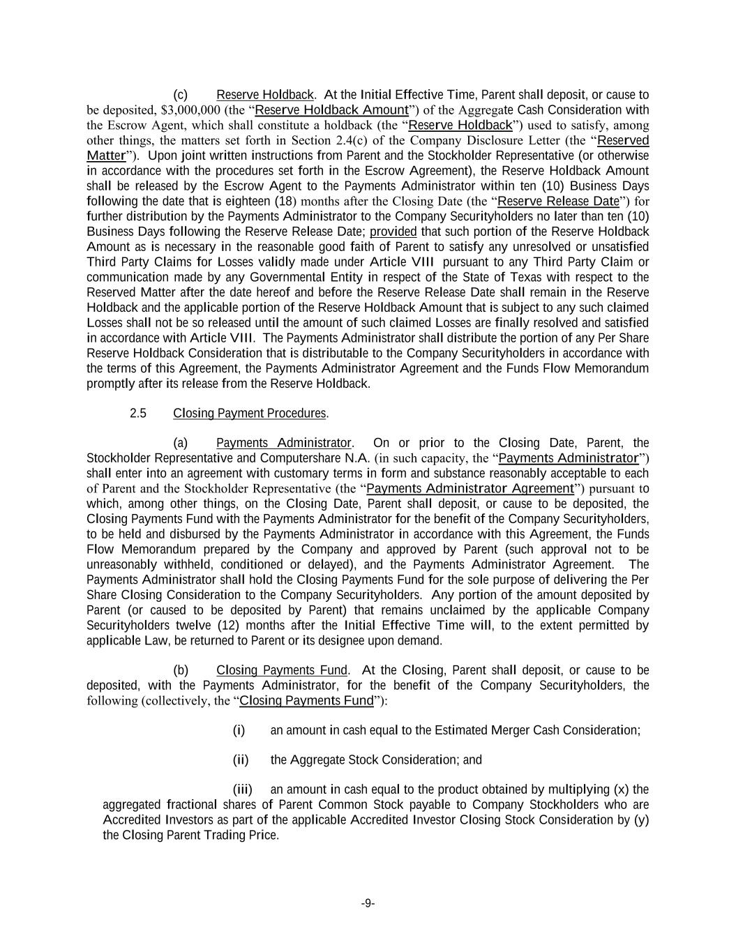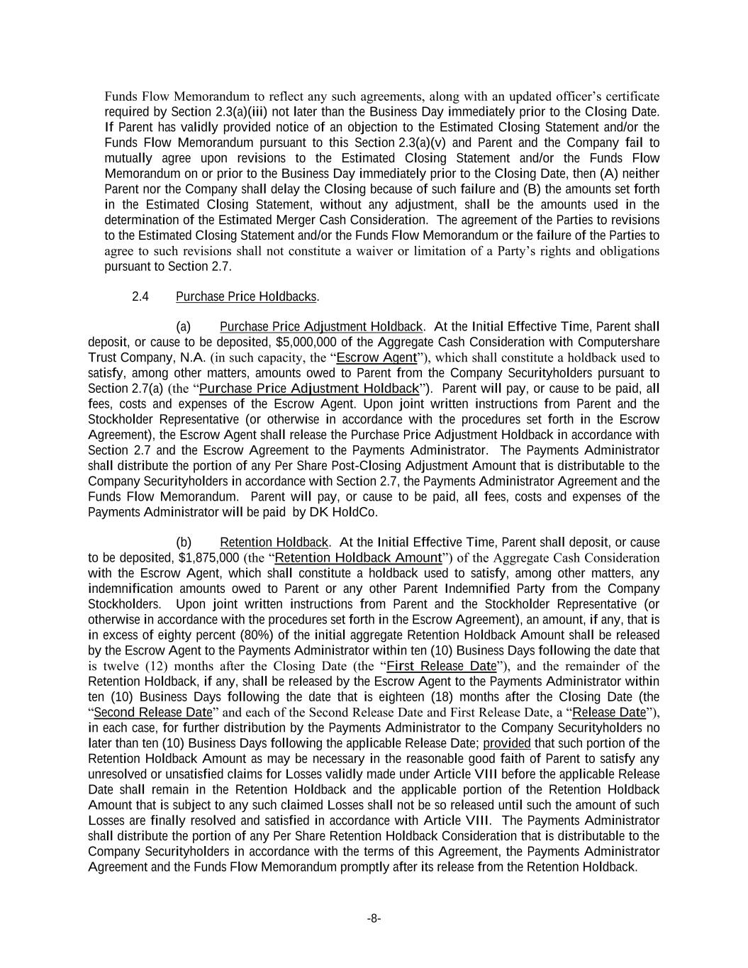 -8- Funds Flow Memorandum to reflect any such agreements, along with an updated officer’s certificate required by Section 2.3(a)(iii) not later than the Business Day immediately prior to the Closing Date. If Parent has validly provided notice of an objection to the Estimated Closing Statement and/or the Funds Flow Memorandum pursuant to this Section 2.3(a)(v) and Parent and the Company fail to mutually agree upon revisions to the Estimated Closing Statement and/or the Funds Flow Memorandum on or prior to the Business Day immediately prior to the Closing Date, then (A) neither Parent nor the Company shall delay the Closing because of such failure and (B) the amounts set forth in the Estimated Closing Statement, without any adjustment, shall be the amounts used in the determination of the Estimated Merger Cash Consideration. The agreement of the Parties to revisions to the Estimated Closing Statement and/or the Funds Flow Memorandum or the failure of the Parties to agree to such revisions shall not constitute a waiver or limitation of a Party’s rights and obligations pursuant to Section 2.7. 2.4 Purchase Price Holdbacks. (a) Purchase Price Adjustment Holdback. At the Initial Effective Time, Parent shall deposit, or cause to be deposited, $5,000,000 of the Aggregate Cash Consideration with Computershare Trust Company, N.A. (in such capacity, the “Escrow Agent”), which shall constitute a holdback used to satisfy, among other matters, amounts owed to Parent from the Company Securityholders pursuant to Section 2.7(a) (the “Purchase Price Adjustment Holdback”). Parent will pay, or cause to be paid, all fees, costs and expenses of the Escrow Agent. Upon joint written instructions from Parent and the Stockholder Representative (or otherwise in accordance with the procedures set forth in the Escrow Agreement), the Escrow Agent shall release the Purchase Price Adjustment Holdback in accordance with Section 2.7 and the Escrow Agreement to the Payments Administrator. The Payments Administrator shall distribute the portion of any Per Share Post-Closing Adjustment Amount that is distributable to the Company Securityholders in accordance with Section 2.7, the Payments Administrator Agreement and the Funds Flow Memorandum. Parent will pay, or cause to be paid, all fees, costs and expenses of the Payments Administrator will be paid by DK HoldCo. (b) Retention Holdback. At the Initial Effective Time, Parent shall deposit, or cause to be deposited, $1,875,000 (the “Retention Holdback Amount”) of the Aggregate Cash Consideration with the Escrow Agent, which shall constitute a holdback used to satisfy, among other matters, any indemnification amounts owed to Parent or any other Parent Indemnified Party from the Company Stockholders. Upon joint written instructions from Parent and the Stockholder Representative (or otherwise in accordance with the procedures set forth in the Escrow Agreement), an amount, if any, that is in excess of eighty percent (80%) of the initial aggregate Retention Holdback Amount shall be released by the Escrow Agent to the Payments Administrator within ten (10) Business Days following the date that is twelve (12) months after the Closing Date (the “First Release Date”), and the remainder of the Retention Holdback, if any, shall be released by the Escrow Agent to the Payments Administrator within ten (10) Business Days following the date that is eighteen (18) months after the Closing Date (the “Second Release Date” and each of the Second Release Date and First Release Date, a “Release Date”), in each case, for further distribution by the Payments Administrator to the Company Securityholders no later than ten (10) Business Days following the applicable Release Date; provided that such portion of the Retention Holdback Amount as may be necessary in the reasonable good faith of Parent to satisfy any unresolved or unsatisfied claims for Losses validly made under Article VIII before the applicable Release Date shall remain in the Retention Holdback and the applicable portion of the Retention Holdback Amount that is subject to any such claimed Losses shall not be so released until such the amount of such Losses are finally resolved and satisfied in accordance with Article VIII. The Payments Administrator shall distribute the portion of any Per Share Retention Holdback Consideration that is distributable to the Company Securityholders in accordance with the terms of this Agreement, the Payments Administrator Agreement and the Funds Flow Memorandum promptly after its release from the Retention Holdback.