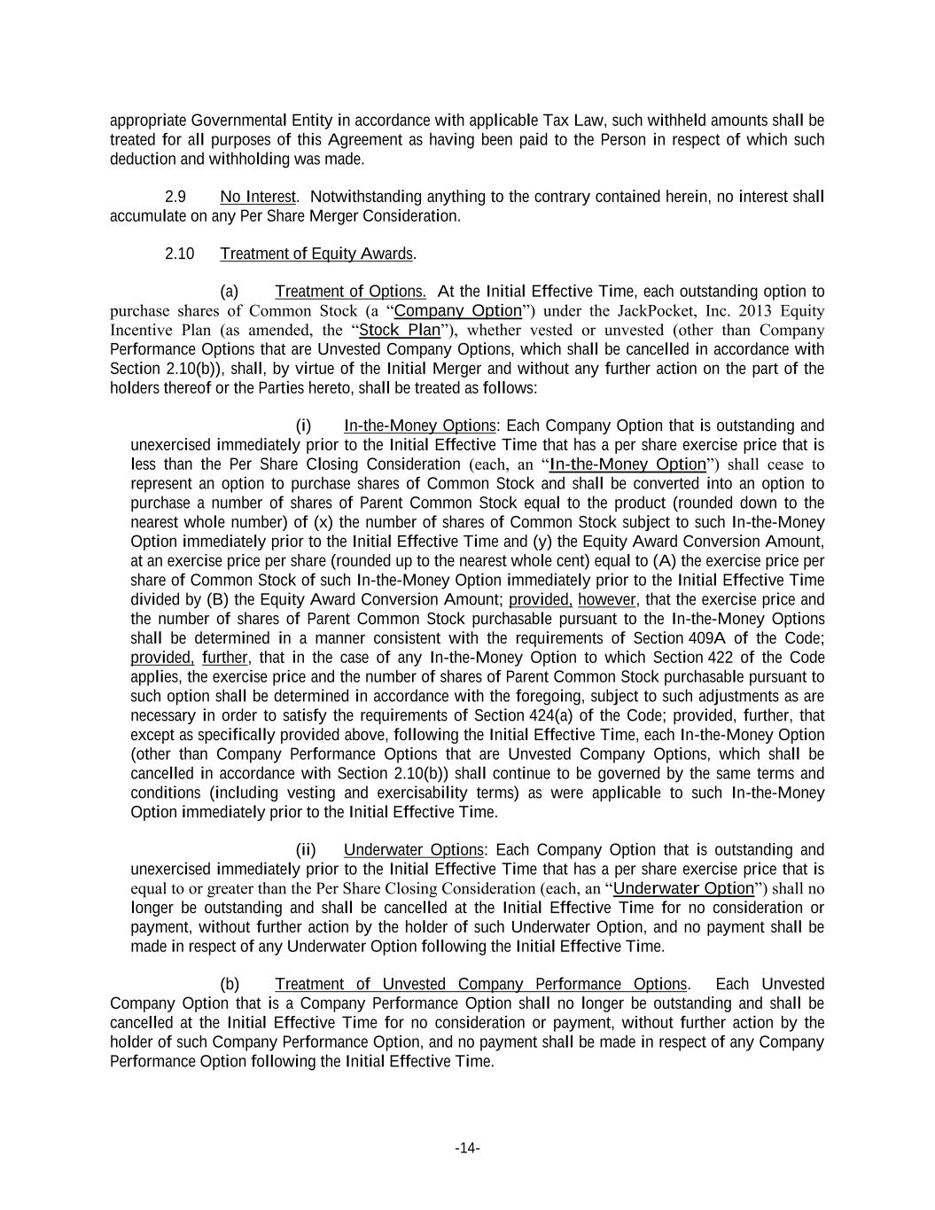 -当初効力発生時点の直前時において、1株当たりの行使価額が1株当たりクロージング対価(本合併契約に定義される)を下回り、かつ、業績条件付権利確定条件が付されていない未行使のジャックポケット・オプション(以下、総称して「イン・ザ・マネー・オプション」といいます)は、本合併契約の条項に従って決定される数のクラスA普通株式を購入するためのオプションに転換されます。合併契約に規定されている場合を除き、イン・ザ・マネー・オプションは、当初効力発生日の直前に適用されていた条件(権利確定条件および行使可能条件を含む)と同じ条件によって支配されます。