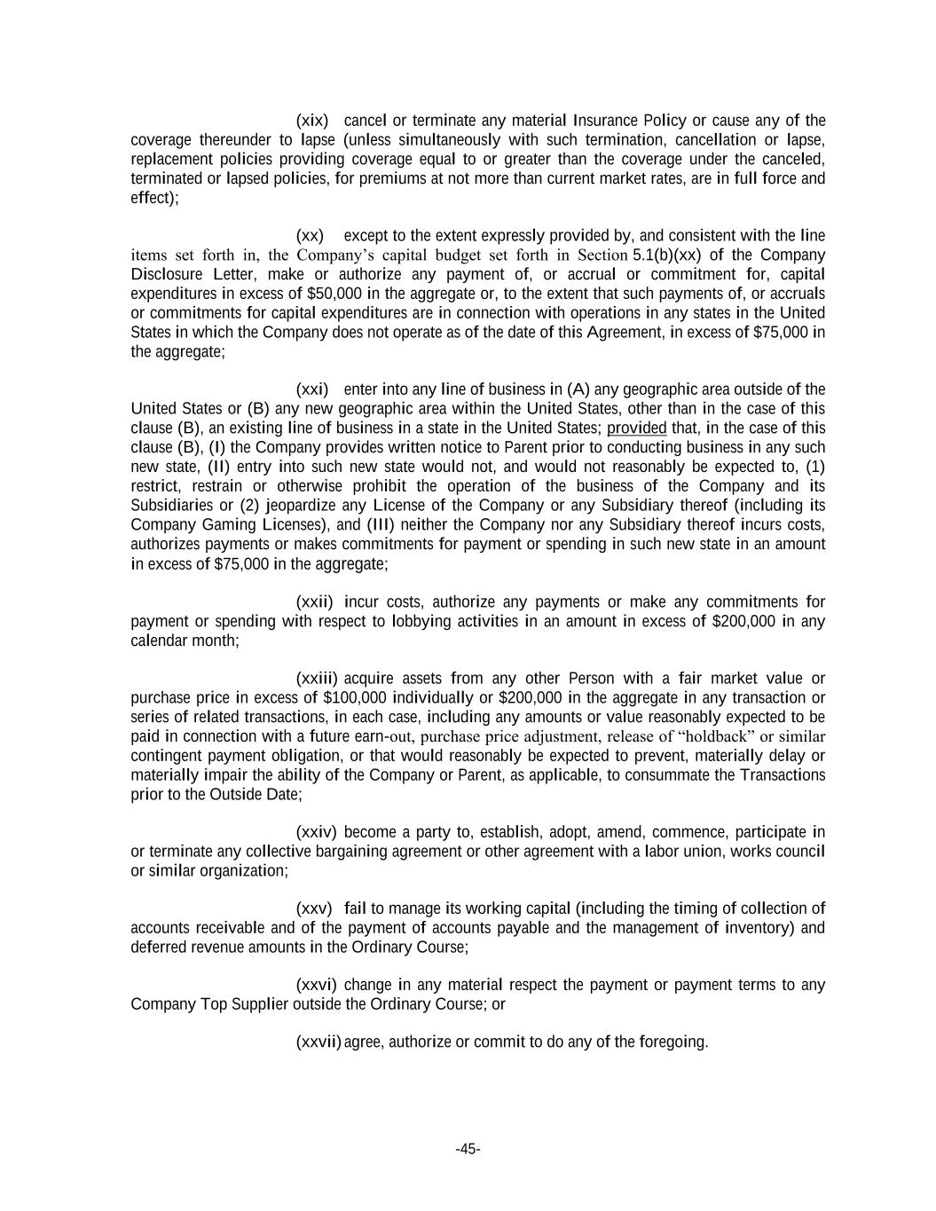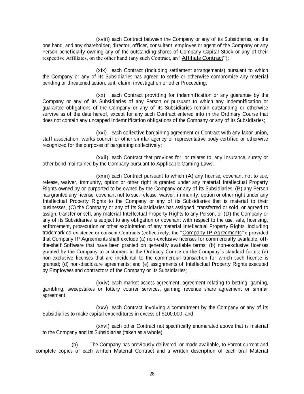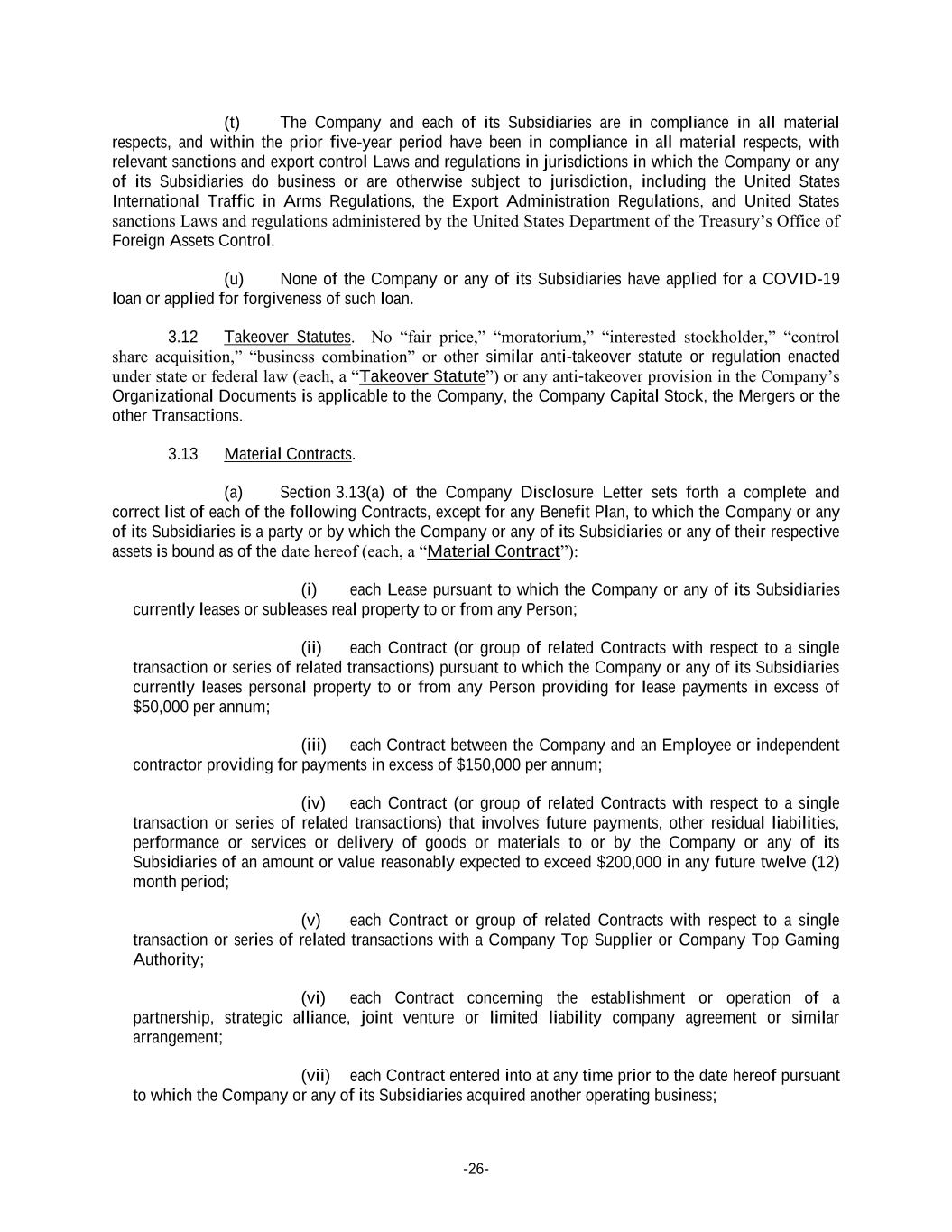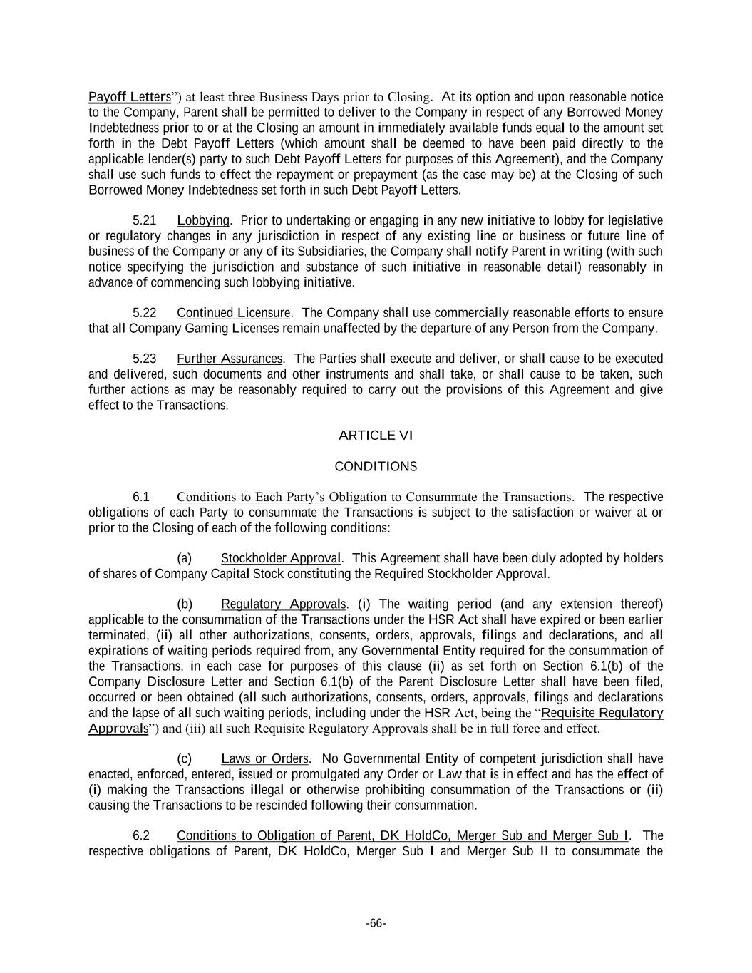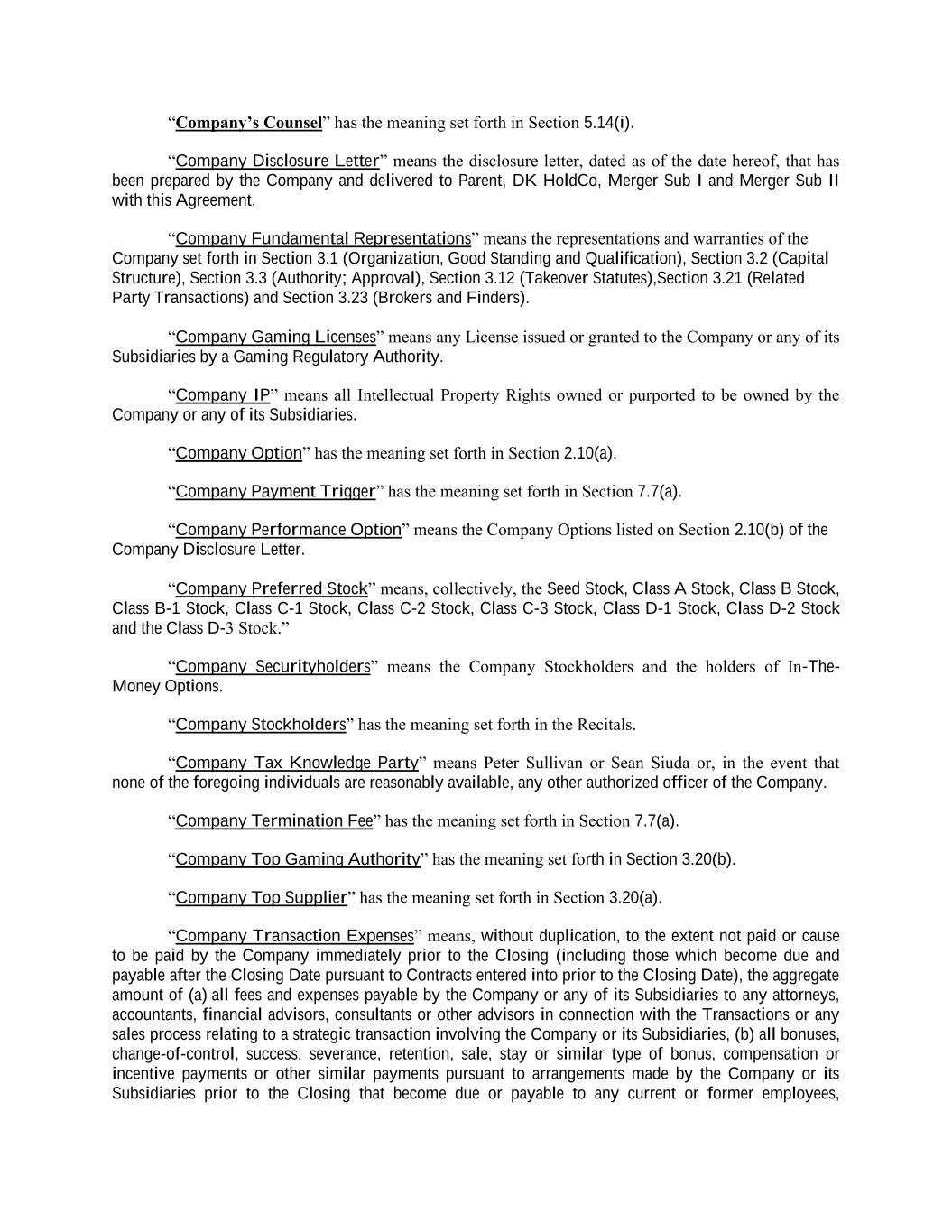 TABLE OF CONTENTS (continued) Page -ii- 3.10 Labor Matters. .................................................................................................................. 22 3.11 Compliance with Laws; Licenses. ................................................................................... 23 3.12 Takeover Statutes ............................................................................................................. 26 3.13 Material Contracts. ........................................................................................................... 26 3.14 Real Property. .................................................................................................................. 29 3.15 Environmental Matters .................................................................................................... 29 3.16 Taxes ................................................................................................................................ 30 3.17 Intellectual Property; IT Assets; Data Privacy. ................................................................ 32 3.18 Personal Property ............................................................................................................. 34 3.19 Insurance .......................................................................................................................... 35 3.20 Suppliers and Gaming Authorities. .................................................................................. 35 3.21 Related Party Transactions .............................................................................................. 35 3.22 Bank Accounts ................................................................................................................. 35 3.23 Brokers and Finders ......................................................................................................... 36 3.24 Private Placement ............................................................................................................ 36 3.25 Accredited Investors ........................................................................................................ 36 3.26 Trade Allowances ............................................................................................................ 36 3.27 Working Capital ............................................................................................................... 36 3.28 Products ........................................................................................................................... 36 3.29 Information ...................................................................................................................... 37 3.30 Non-Reliance ................................................................................................................... 37 3.31 No Other Representations or Warranties ......................................................................... 37 ARTICLE IV REPRESENTATIONS AND WARRANTIES OF PARENT, DK HOLDCO, MERGER SUB I AND MERGER SUB II ...................................................................... 37 4.1 Organization, Good Standing and Qualification .............................................................. 38 4.2 Parent Common Stock ..................................................................................................... 38 4.3 Authority; Approval ......................................................................................................... 38 4.4 Governmental Filings; No Violations. ............................................................................. 38 4.5 Public Filings ................................................................................................................... 39 4.6 Legal Proceedings ............................................................................................................ 39 4.7 Available Funds ............................................................................................................... 40 4.8 Merger Sub I and DK HoldCo ......................................................................................... 40 4.9 Merger Sub II ................................................................................................................... 40