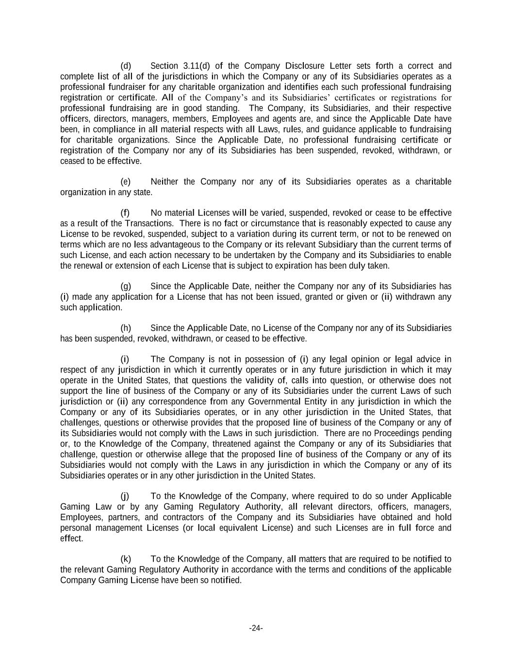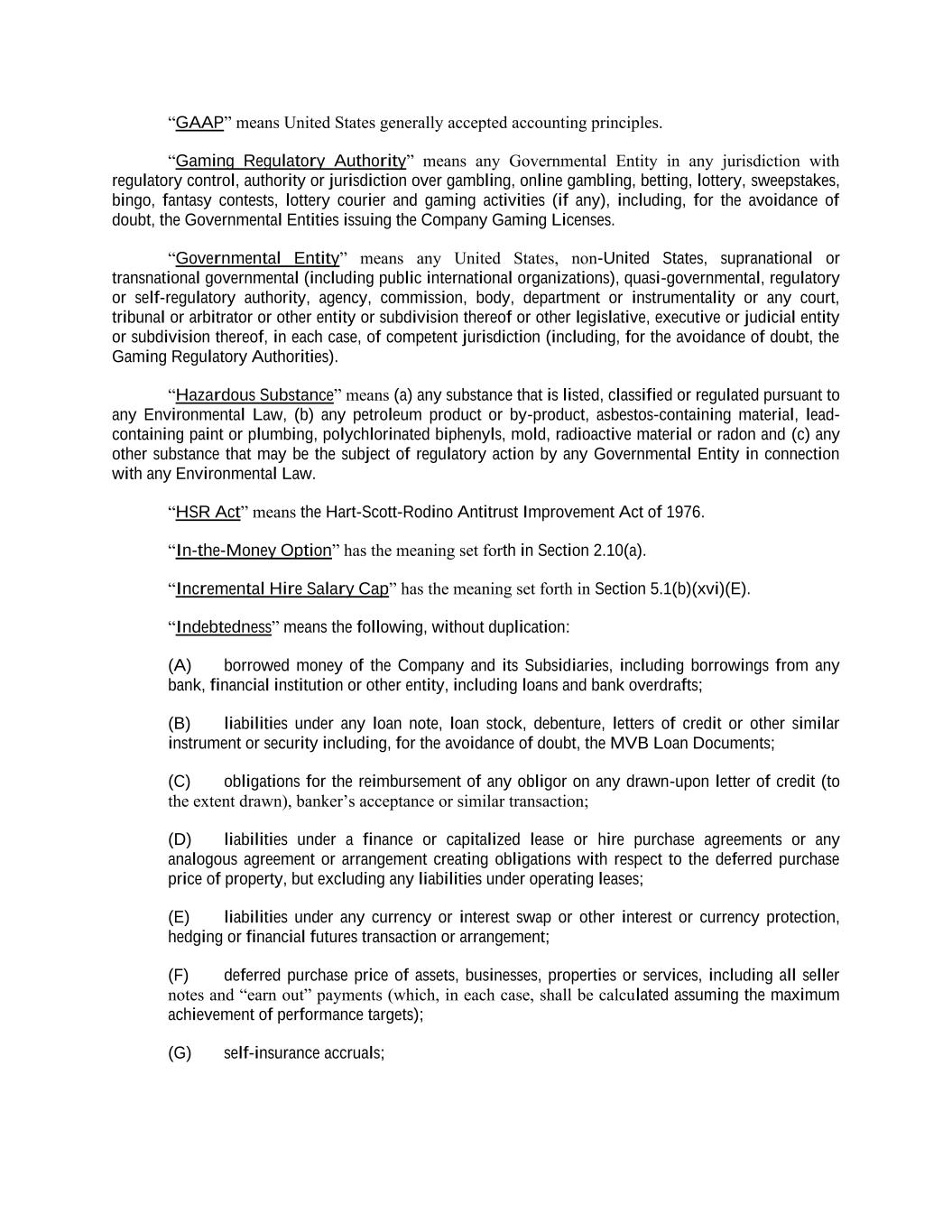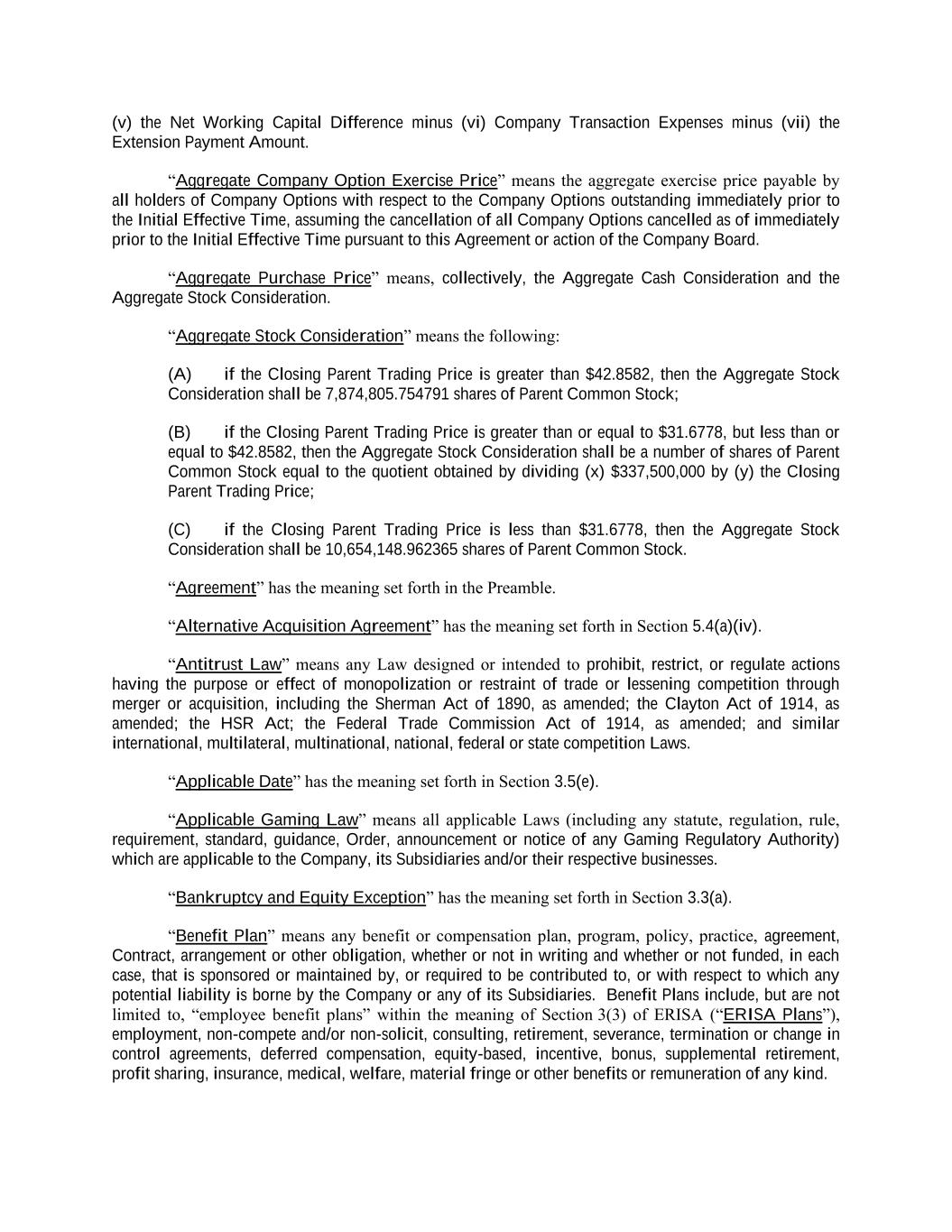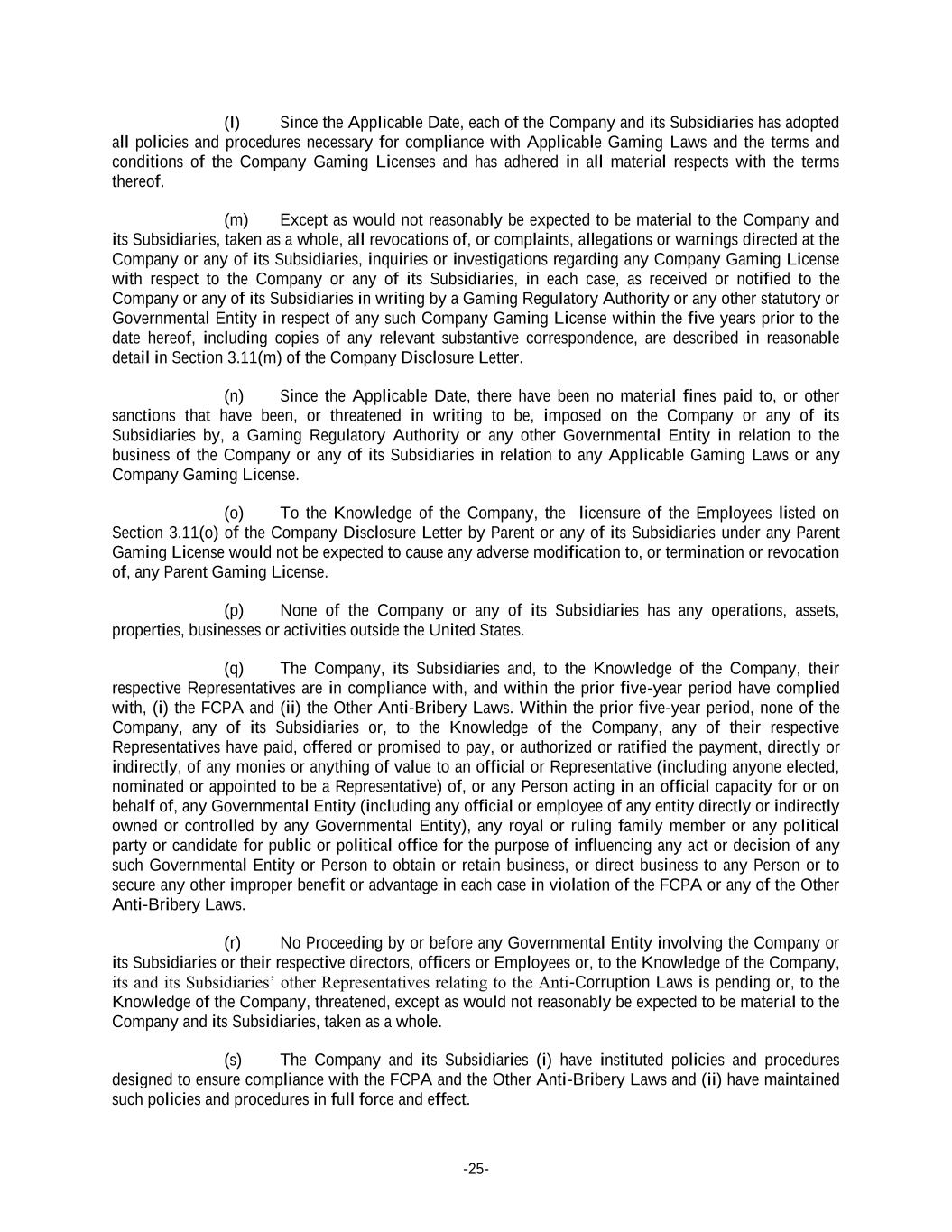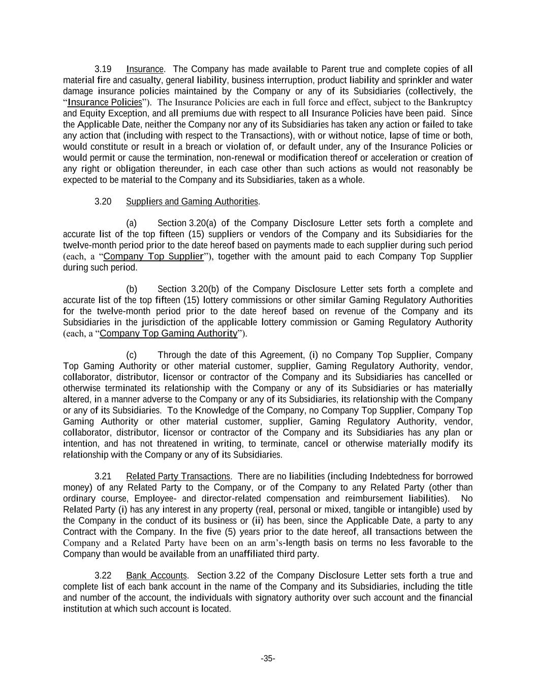 TABLE OF CONTENTS (continued) Page -ii- 3.10 Labor Matters. .................................................................................................................. 22 3.11 Compliance with Laws; Licenses. ................................................................................... 23 3.12 Takeover Statutes ............................................................................................................. 26 3.13 Material Contracts. ........................................................................................................... 26 3.14 Real Property. .................................................................................................................. 29 3.15 Environmental Matters .................................................................................................... 29 3.16 Taxes ................................................................................................................................ 30 3.17 Intellectual Property; IT Assets; Data Privacy. ................................................................ 32 3.18 Personal Property ............................................................................................................. 34 3.19 Insurance .......................................................................................................................... 35 3.20 Suppliers and Gaming Authorities. .................................................................................. 35 3.21 Related Party Transactions .............................................................................................. 35 3.22 Bank Accounts ................................................................................................................. 35 3.23 Brokers and Finders ......................................................................................................... 36 3.24 Private Placement ............................................................................................................ 36 3.25 Accredited Investors ........................................................................................................ 36 3.26 Trade Allowances ............................................................................................................ 36 3.27 Working Capital ............................................................................................................... 36 3.28 Products ........................................................................................................................... 36 3.29 Information ...................................................................................................................... 37 3.30 Non-Reliance ................................................................................................................... 37 3.31 No Other Representations or Warranties ......................................................................... 37 ARTICLE IV REPRESENTATIONS AND WARRANTIES OF PARENT, DK HOLDCO, MERGER SUB I AND MERGER SUB II ...................................................................... 37 4.1 Organization, Good Standing and Qualification .............................................................. 38 4.2 Parent Common Stock ..................................................................................................... 38 4.3 Authority; Approval ......................................................................................................... 38 4.4 Governmental Filings; No Violations. ............................................................................. 38 4.5 Public Filings ................................................................................................................... 39 4.6 Legal Proceedings ............................................................................................................ 39 4.7 Available Funds ............................................................................................................... 40 4.8 Merger Sub I and DK HoldCo ......................................................................................... 40 4.9 Merger Sub II ................................................................................................................... 40