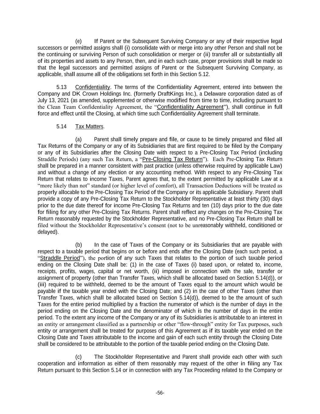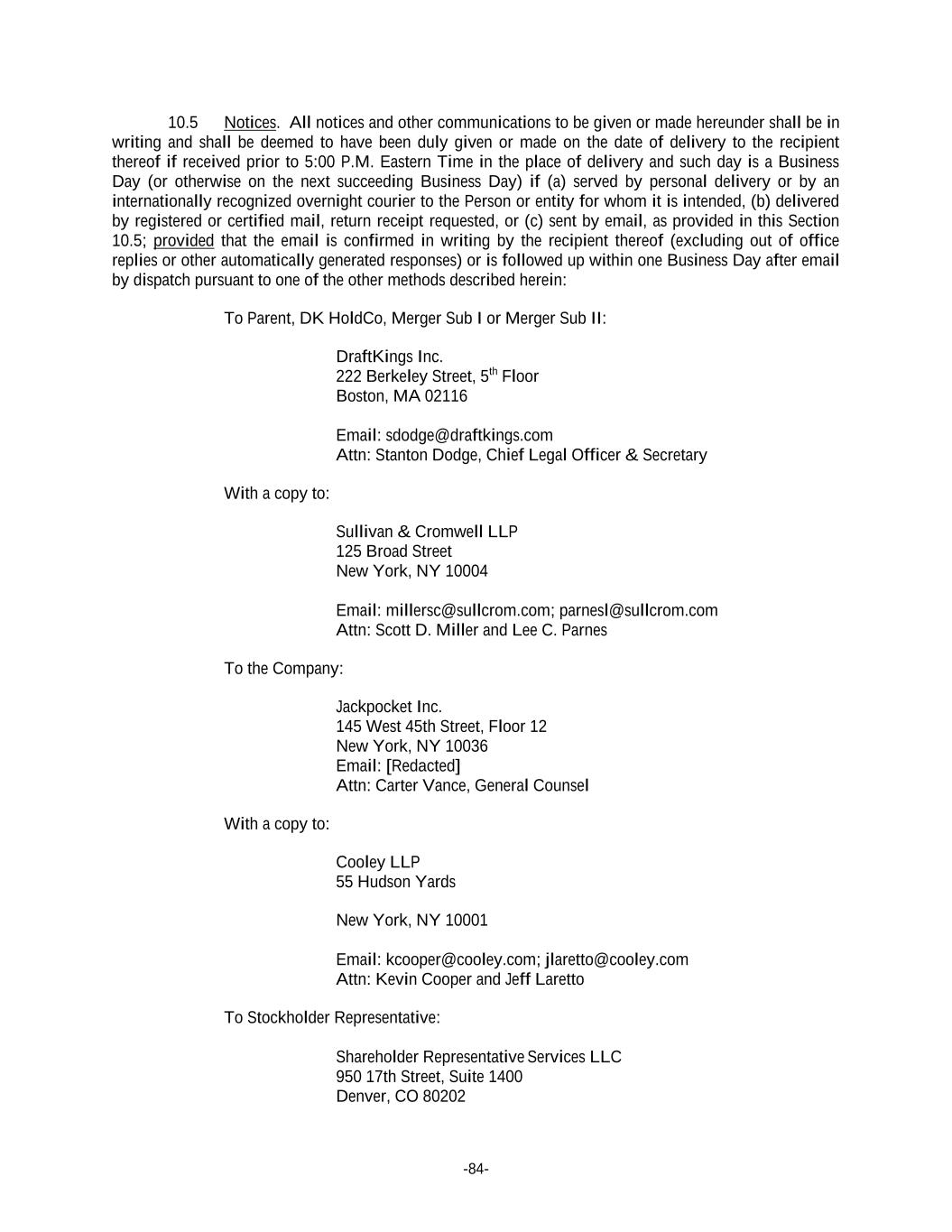 -4- Merger has been executed and filed pursuant to this Section 1.4, or at such later date and time as may be agreed by the Parties in writing and specified in the Certificate of Initial Merger so executed and filed (such date and time, as applicable, the “Initial Effective Time”). Immediately following the Initial Effective Time, DK HoldCo shall (i) cause the certificate of merger relating to the Subsequent Merger (the “Certificate of Subsequent Merger”) to be executed and delivered for filing with the Secretary of State of the State of Delaware as provided in Section 18-209 of the DLLCA and Section 251 of the DGCL and (ii) deliver and tender, or cause to be delivered or tendered, as applicable, any Taxes and fees and make all other filings or recordings required under the DGCL and the DLLCA in connection with such filing of the Certificate of Subsequent Merger and the consummation of the Subsequent Merger, which shall become effective at the date and time when the Certificate of Subsequent Merger has been executed and filed pursuant to this Section 1.4, or at such later date and time as may be agreed by the Parties in writing and specified in the Certificate of Subsequent Merger so executed and filed (such date and time, as applicable, the “Subsequent Effective Time”). 1.5 Governing Documents. At the Initial Effective Time, the certificate of incorporation and bylaws of the Initial Surviving Company shall be amended and restated to be identical to those of Merger Sub I, as in effect immediately prior to the Initial Effective Time, except that the name of the Initial Surviving Company shall be “Jackpocket Inc.” At the Subsequent Effective Time, the certificate of formation and limited liability company operating agreement of Merger Sub II, as in effect immediately prior to the Subsequent Effective Time, shall each remain in effect as the certificate of formation and limited liability company operating agreement of the Subsequent Surviving Company, except that the name of the Subsequent Surviving Company shall be “Jackpocket LLC”. 1.6 Directors and Officers of the Initial Surviving Company. The Parties shall take all actions necessary so that, effective as of the Initial Effective Time, (i) the directors of Merger Sub I immediately prior to the Initial Effective Time shall become and constitute the only directors of the Initial Surviving Company, each to hold office until his or her successor has been duly elected or appointed and qualified or until his or her earlier death, resignation or removal in accordance with the articles of incorporation and bylaws of the Initial Surviving Company and applicable Law, and (ii) the officers of Merger Sub I immediately prior to the Initial Effective Time shall become and constitute the only officers of the Initial Surviving Company, each to hold office until his or her successor has been duly elected or appointed and qualified or until his or her earlier death, resignation or removal in accordance with the articles of incorporation and the bylaws of the Initial Surviving Company and applicable Law. 1.7 Directors and Officers of the Subsequent Surviving Company. The Parties shall take all actions necessary so that, effective as of the Subsequent Effective Time, (i) the managers of Merger Sub II immediately prior to the Subsequent Effective Time shall become and constitute the managers of the Subsequent Surviving Company, each to hold office until his or her successor has been duly elected or appointed and qualified or until his or her earlier death, resignation or removal in accordance with the certificate of formation and limited liability company agreement of the Subsequent Surviving Company and applicable Law, and (ii) the officers of Merger Sub II immediately prior to the Subsequent Effective Time shall become and constitute the only officers of the Subsequent Surviving Company, each to hold office until his or her successor has been duly elected or appointed and qualified or until his or her earlier death, resignation or removal in accordance with the limited liability company agreement of the Subsequent Surviving Company and applicable Law. 1.8 Additional Actions. The Subsequent Surviving Company may, at any time after the Subsequent Effective Time, take any action, including executing and delivering any document, in the name and on behalf of any of the Company, Merger Sub I, the Initial Surviving Company or Merger Sub II, in order to consummate the Transactions.