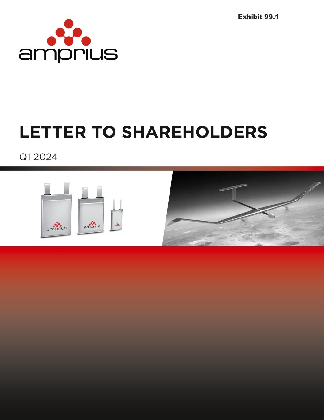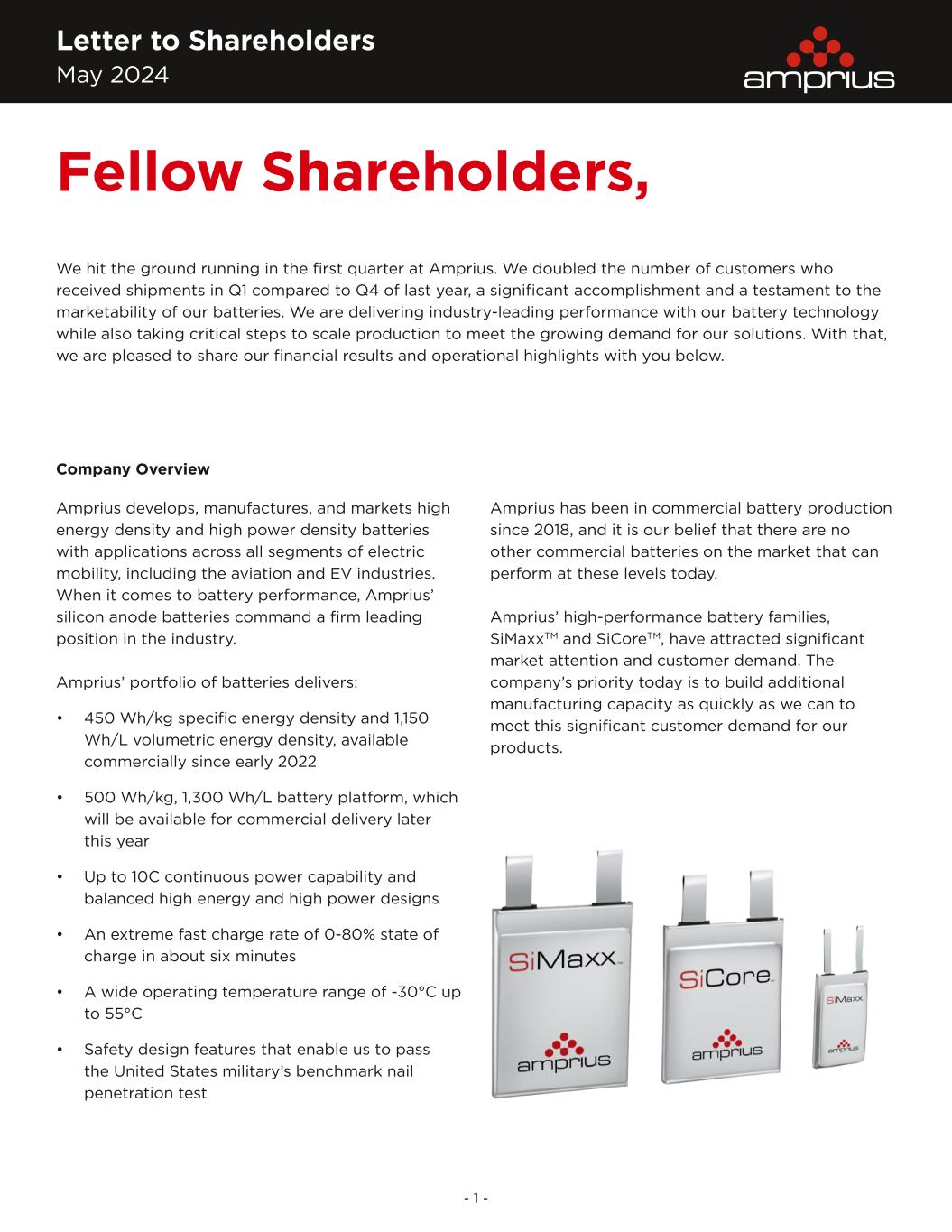 Letter to Shareholders May 2024 - 1 - Amprius has been in commercial battery production since 2018, and it is our belief that there are no other commercial batteries on the market that can perform at these levels today. Amprius’ high-performance battery families, SiMaxxTM and SiCoreTM, have attracted significant market attention and customer demand. The company’s priority today is to build additional manufacturing capacity as quickly as we can to meet this significant customer demand for our products. Company Overview Amprius develops, manufactures, and markets high energy density and high power density batteries with applications across all segments of electric mobility, including the aviation and EV industries. When it comes to battery performance, Amprius’ silicon anode batteries command a firm leading position in the industry. Amprius’ portfolio of batteries delivers: • 450 Wh/kg specific energy density and 1,150 Wh/L volumetric energy density, available commercially since early 2022 • 500 Wh/kg, 1,300 Wh/L battery platform, which will be available for commercial delivery later this year • Up to 10C continuous power capability and balanced high energy and high power designs • An extreme fast charge rate of 0-80% state of charge in about six minutes • A wide operating temperature range of -30°C up to 55°C • Safety design features that enable us to pass the United States military’s benchmark nail penetration test Fellow Shareholders, We hit the ground running in the first quarter at Amprius. We doubled the number of customers who received shipments in Q1 compared to Q4 of last year, a significant accomplishment and a testament to the marketability of our batteries. We are delivering industry-leading performance with our battery technology while also taking critical steps to scale production to meet the growing demand for our solutions. With that, we are pleased to share our financial results and operational highlights with you below.