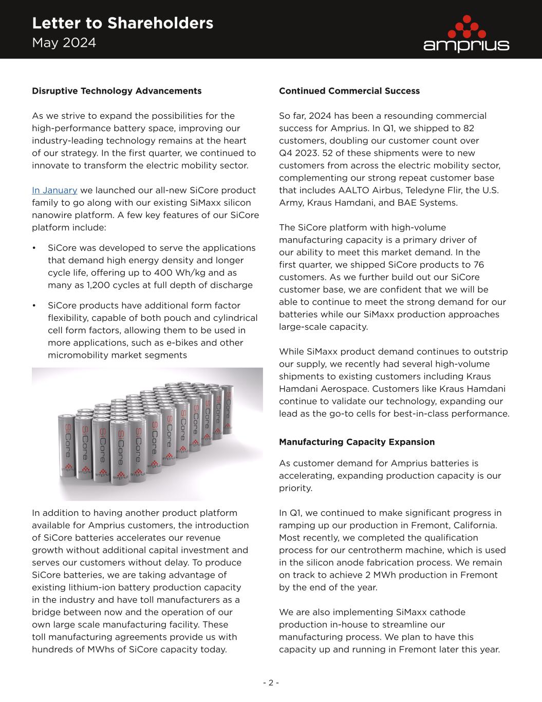 Letter to Shareholders May 2024 - 2 - Disruptive Technology Advancements As we strive to expand the possibilities for the high-performance battery space, improving our industry-leading technology remains at the heart of our strategy. In the first quarter, we continued to innovate to transform the electric mobility sector. In January we launched our all-new SiCore product family to go along with our existing SiMaxx silicon nanowire platform. A few key features of our SiCore platform include: • SiCore was developed to serve the applications that demand high energy density and longer cycle life, offering up to 400 Wh/kg and as many as 1,200 cycles at full depth of discharge • SiCore products have additional form factor flexibility, capable of both pouch and cylindrical cell form factors, allowing them to be used in more applications, such as e-bikes and other micromobility market segments In addition to having another product platform available for Amprius customers, the introduction of SiCore batteries accelerates our revenue growth without additional capital investment and serves our customers without delay. To produce SiCore batteries, we are taking advantage of existing lithium-ion battery production capacity in the industry and have toll manufacturers as a bridge between now and the operation of our own large scale manufacturing facility. These toll manufacturing agreements provide us with hundreds of MWhs of SiCore capacity today. Continued Commercial Success So far, 2024 has been a resounding commercial success for Amprius. In Q1, we shipped to 82 customers, doubling our customer count over Q4 2023. 52 of these shipments were to new customers from across the electric mobility sector, complementing our strong repeat customer base that includes AALTO Airbus, Teledyne Flir, the U.S. Army, Kraus Hamdani, and BAE Systems. The SiCore platform with high-volume manufacturing capacity is a primary driver of our ability to meet this market demand. In the first quarter, we shipped SiCore products to 76 customers. As we further build out our SiCore customer base, we are confident that we will be able to continue to meet the strong demand for our batteries while our SiMaxx production approaches large-scale capacity. While SiMaxx product demand continues to outstrip our supply, we recently had several high-volume shipments to existing customers including Kraus Hamdani Aerospace. Customers like Kraus Hamdani continue to validate our technology, expanding our lead as the go-to cells for best-in-class performance. Manufacturing Capacity Expansion As customer demand for Amprius batteries is accelerating, expanding production capacity is our priority. In Q1, we continued to make significant progress in ramping up our production in Fremont, California. Most recently, we completed the qualification process for our centrotherm machine, which is used in the silicon anode fabrication process. We remain on track to achieve 2 MWh production in Fremont by the end of the year. We are also implementing SiMaxx cathode production in-house to streamline our manufacturing process. We plan to have this capacity up and running in Fremont later this year.