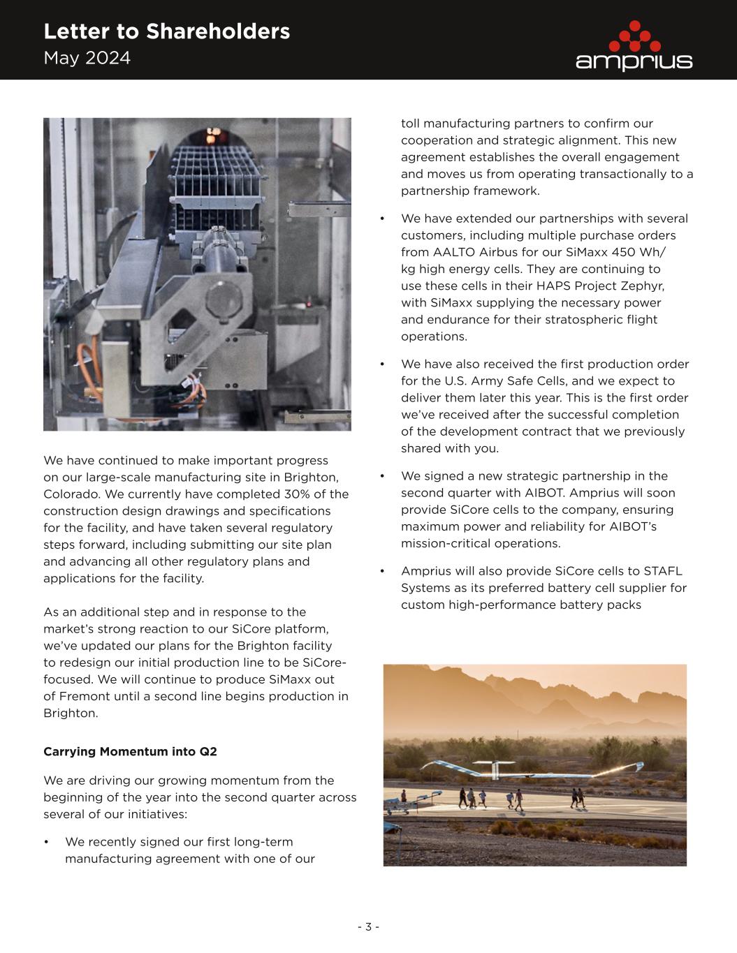 Letter to Shareholders May 2024 - 3 - We have continued to make important progress on our large-scale manufacturing site in Brighton, Colorado. We currently have completed 30% of the construction design drawings and specifications for the facility, and have taken several regulatory steps forward, including submitting our site plan and advancing all other regulatory plans and applications for the facility. As an additional step and in response to the market’s strong reaction to our SiCore platform, we’ve updated our plans for the Brighton facility to redesign our initial production line to be SiCore- focused. We will continue to produce SiMaxx out of Fremont until a second line begins production in Brighton. Carrying Momentum into Q2 We are driving our growing momentum from the beginning of the year into the second quarter across several of our initiatives: • We recently signed our first long-term manufacturing agreement with one of our toll manufacturing partners to confirm our cooperation and strategic alignment. This new agreement establishes the overall engagement and moves us from operating transactionally to a partnership framework. • We have extended our partnerships with several customers, including multiple purchase orders from AALTO Airbus for our SiMaxx 450 Wh/ kg high energy cells. They are continuing to use these cells in their HAPS Project Zephyr, with SiMaxx supplying the necessary power and endurance for their stratospheric flight operations. • We have also received the first production order for the U.S. Army Safe Cells, and we expect to deliver them later this year. This is the first order we’ve received after the successful completion of the development contract that we previously shared with you. • We signed a new strategic partnership in the second quarter with AIBOT. Amprius will soon provide SiCore cells to the company, ensuring maximum power and reliability for AIBOT’s mission-critical operations. • Amprius will also provide SiCore cells to STAFL Systems as its preferred battery cell supplier for custom high-performance battery packs
