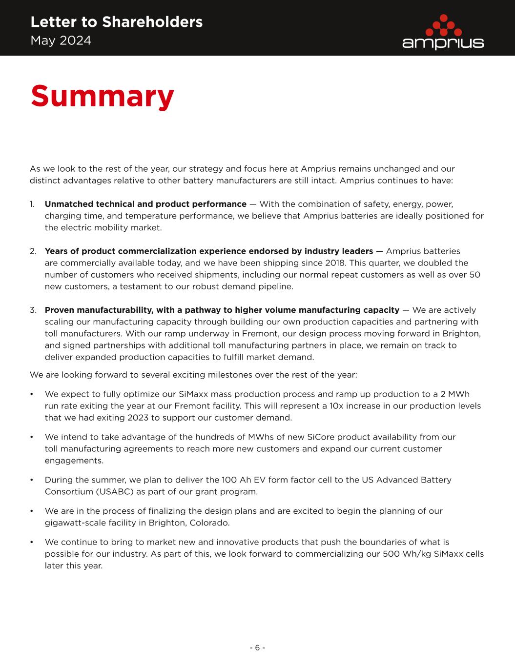 Letter to Shareholders May 2024 - 6 - Summary As we look to the rest of the year, our strategy and focus here at Amprius remains unchanged and our distinct advantages relative to other battery manufacturers are still intact. Amprius continues to have: 1. Unmatched technical and product performance — With the combination of safety, energy, power, charging time, and temperature performance, we believe that Amprius batteries are ideally positioned for the electric mobility market. 2. Years of product commercialization experience endorsed by industry leaders — Amprius batteries are commercially available today, and we have been shipping since 2018. This quarter, we doubled the number of customers who received shipments, including our normal repeat customers as well as over 50 new customers, a testament to our robust demand pipeline. 3. Proven manufacturability, with a pathway to higher volume manufacturing capacity — We are actively scaling our manufacturing capacity through building our own production capacities and partnering with toll manufacturers. With our ramp underway in Fremont, our design process moving forward in Brighton, and signed partnerships with additional toll manufacturing partners in place, we remain on track to deliver expanded production capacities to fulfill market demand. We are looking forward to several exciting milestones over the rest of the year: • We expect to fully optimize our SiMaxx mass production process and ramp up production to a 2 MWh run rate exiting the year at our Fremont facility. This will represent a 10x increase in our production levels that we had exiting 2023 to support our customer demand. • We intend to take advantage of the hundreds of MWhs of new SiCore product availability from our toll manufacturing agreements to reach more new customers and expand our current customer engagements. • During the summer, we plan to deliver the 100 Ah EV form factor cell to the US Advanced Battery Consortium (USABC) as part of our grant program. • We are in the process of finalizing the design plans and are excited to begin the planning of our gigawatt-scale facility in Brighton, Colorado. • We continue to bring to market new and innovative products that push the boundaries of what is possible for our industry. As part of this, we look forward to commercializing our 500 Wh/kg SiMaxx cells later this year.