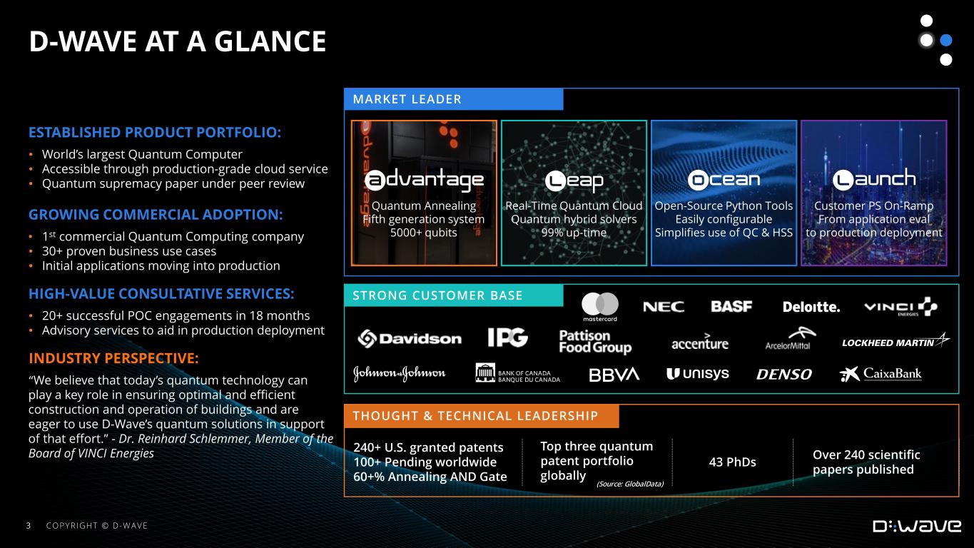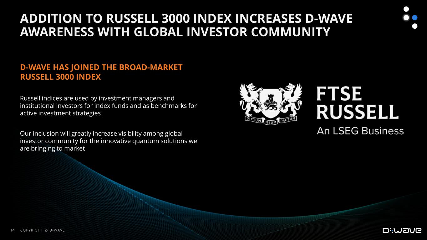 •Announced that D-Wave has joined the broad-market Russell 3000 Index, which captures the 3000 largest stocks as of April 30, 2024, ranking them by total market capitalization. Russell indexes are widely used by investment managers and institutional investors for index funds and as benchmarks for active investment strategies. According to the data as of the end of December 2023, about $10.5 trillion in assets are benchmarked against the Russell US indexes, which belong to FTSE Russell.