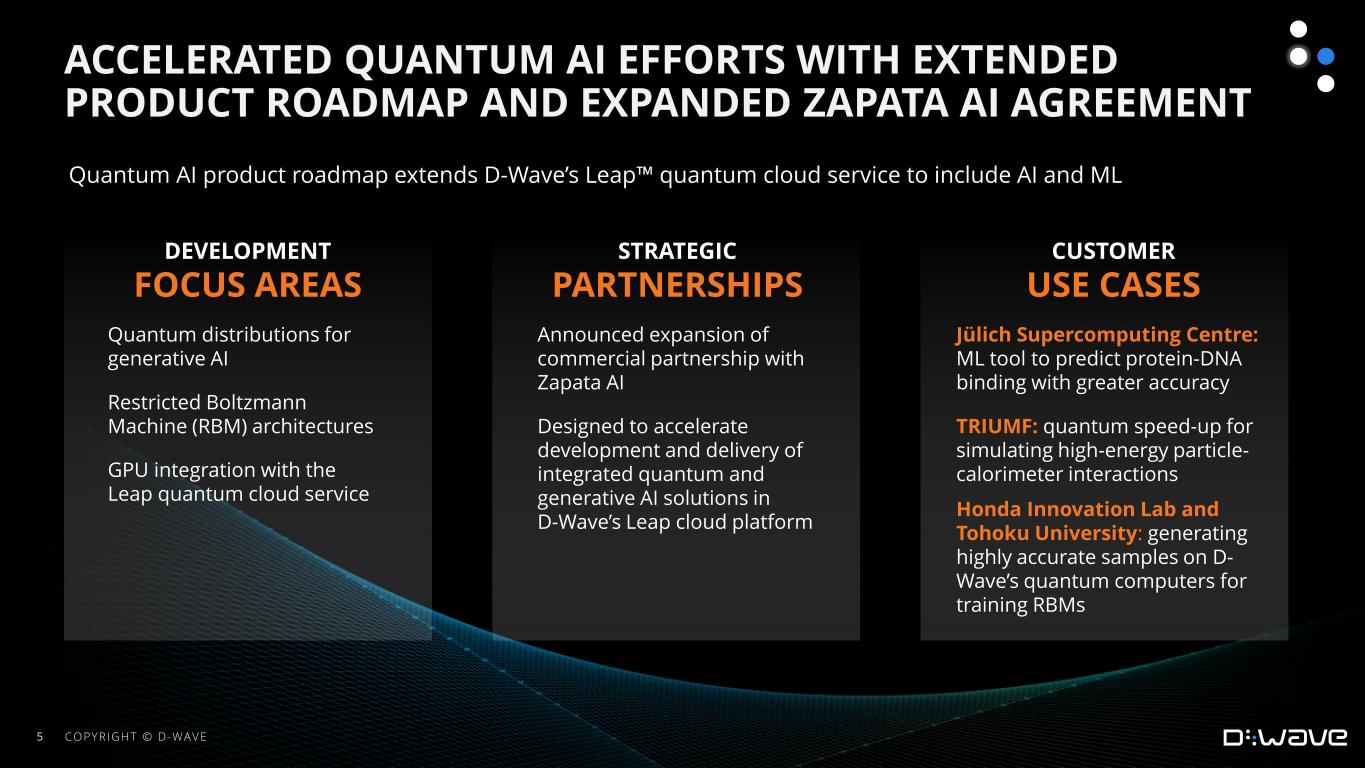 •Announced a significant expansion to our commercial partnership with Zapata AI, designed to accelerate the development and delivery of integrated quantum and generative AI solutions in D‑Wave’s Leap cloud platform, as part of the Quantum AI product roadmap. The new agreement leverages Zapata’s proprietary Universal Generative AI software for rapid development and builds upon D-Wave’s Leap real‑time quantum cloud service to support quantum, hybrid quantum, and classical AI solutions.