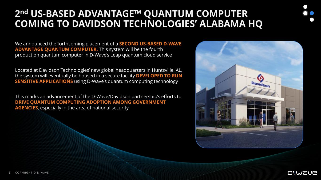 •Announced the forthcoming placement of a second US-based D-Wave Advantage quantum computer. This system will be the fourth production quantum computer in the Leap quantum cloud service. Located at Davidson Technologies’ new global headquarters in Huntsville, AL, the system will eventually be housed in a secure facility developed to run sensitive applications using D-Wave’s quantum computing technology.