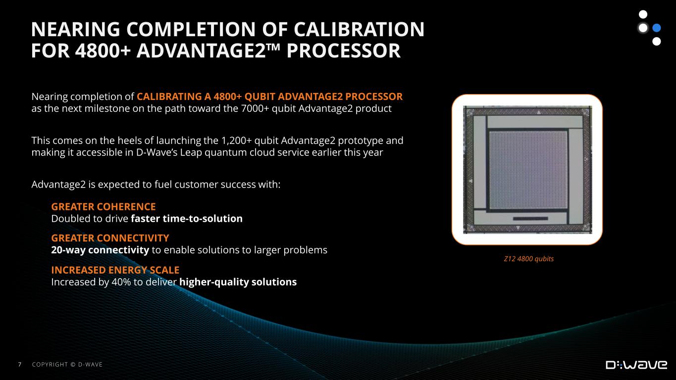 •Nearing completion of calibrating a 4800+ qubit Advantage2 processor as the next milestone on the path toward the 7000+ qubit Advantage2 product. This comes on the heels of launching the 1,200+ qubit Advantage2 prototype and making it accessible in D-Wave’s Leap quantum cloud service earlier this year.