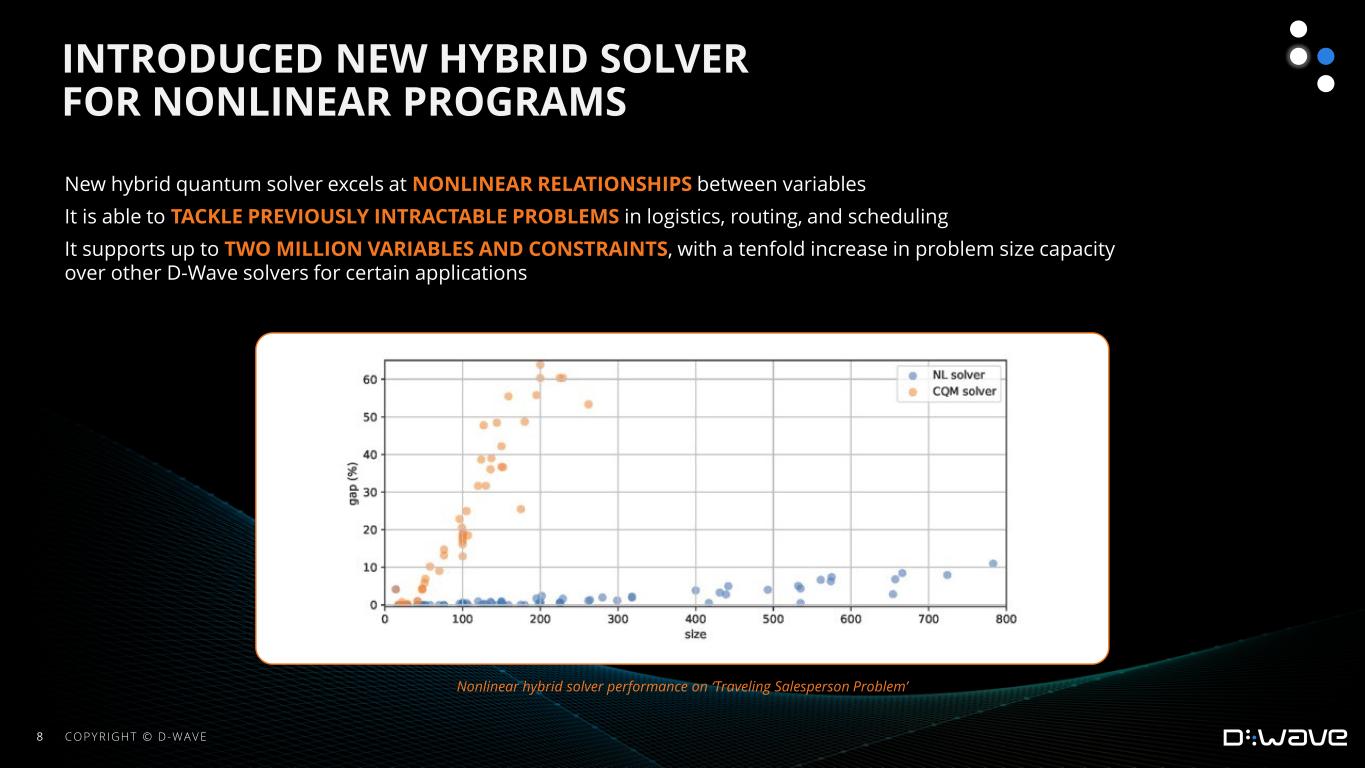 •Launched a new hybrid quantum solver for nonlinear programs, enabling customers to confront real-world problems of growing complexity. Available now in the D-Wave’s Leap™ quantum cloud service, the new solver supports up to two million variables and constraints, with a tenfold increase in problem size capacity over other D-Wave solvers for certain applications, according to preliminary benchmarking studies. In addition, the company introduced new demos of applications built with the nonlinear program solver, addressing vehicle routing and flow shop scheduling.