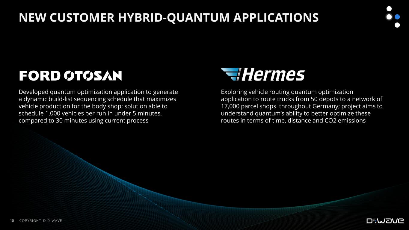 •Announced a Quantum AI product development roadmap that extends D-Wave’s Leap™ quantum cloud service for AI and machine learning. The focus will be on helping customers address a variety of AI/ML workloads including pre-training optimization, more accurate and efficient model training, and opening new AI business use cases that require the integration of AI and business optimization, such as quantum supply chain optimization in support of AI-predicted product demand requirements.