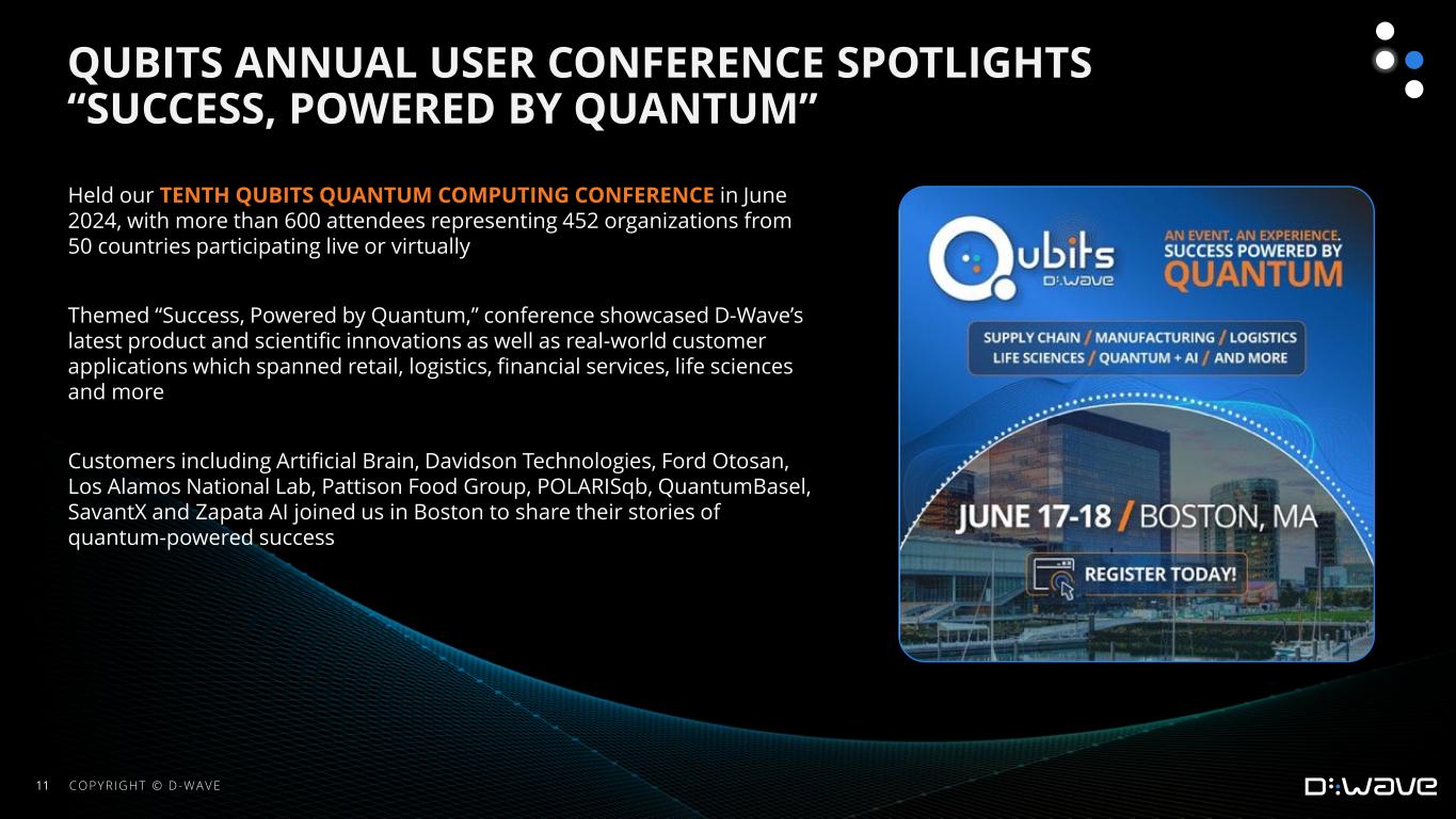 •Held our tenth Qubits quantum computing conference in June 2024, with more than 600 attendees representing 452 organizations from 50 countries participating live or virtually. Themed “Success, Powered by Quantum,” the conference showcased D-Wave’s latest product and scientific innovations as well as real-world customer applications which spanned retail, logistics, financial services, life sciences and more. Customers including Artificial Brain, Davidson Technologies, Ford Otosan, Los Alamos National Lab, Pattison Food Group, POLARISqb, QuantumBasel, SavantX and Zapata AI joined us in Boston to share their stories of quantum-powered success.