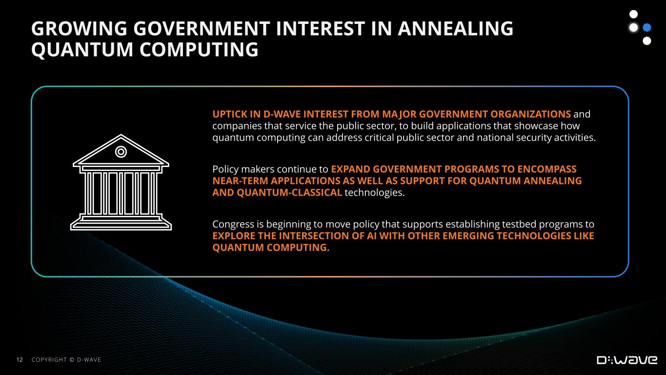 •Experienced an uptick in D-Wave interest from a number of major government organizations and companies that service the public sector, to build applications that showcase how quantum computing can address critical public sector and national security activities. Policy makers continue to expand government programs to encompass near-term applications as well as support for quantum annealing and quantum-classical technologies.
