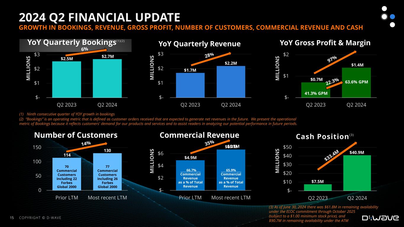 •Bookings1: Bookings for the second quarter of fiscal 2024 were $2.7 million, an increase of $0.2 million, or 6% from the fiscal 2023 second quarter Bookings of $2.5 million. This represents D-Wave’s ninth consecutive quarter of year-over-year growth in quarterly Bookings.
