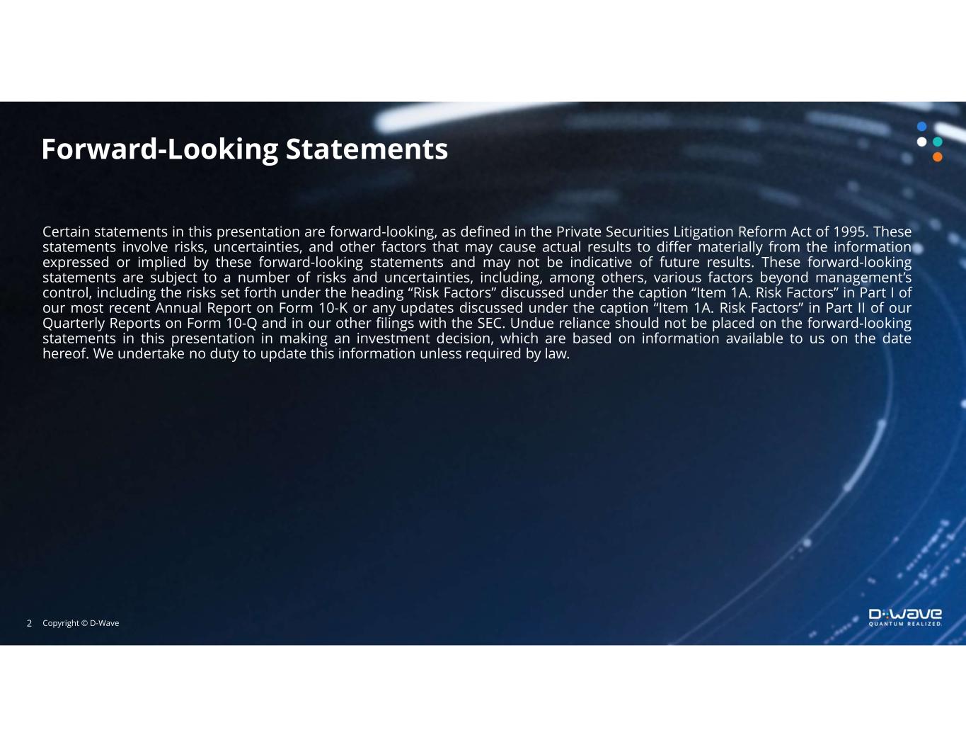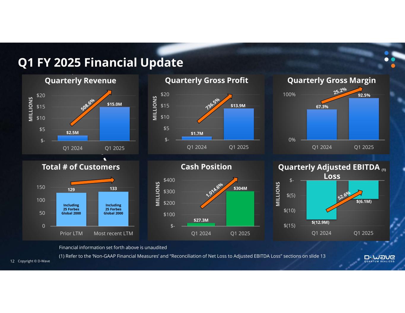 「D-WaveのCEOであるアラン・バラッツ博士は、次のように述べています。「2025年第1四半期は、D-Waveの歴史の中で間違いなく最も重要な四半期でした。「我々は、主要な研究機関への最初のAdvantageTMシステムの販売で収益を計上し、追加の顧客アプリケーションを商業生産に移行させ、実世界の有用な問題で古典的コンピューティングに対する量子の優位性を初めて実証しました。その結果、当四半期は記録的な売上高と売上総利益を達成することができました。"