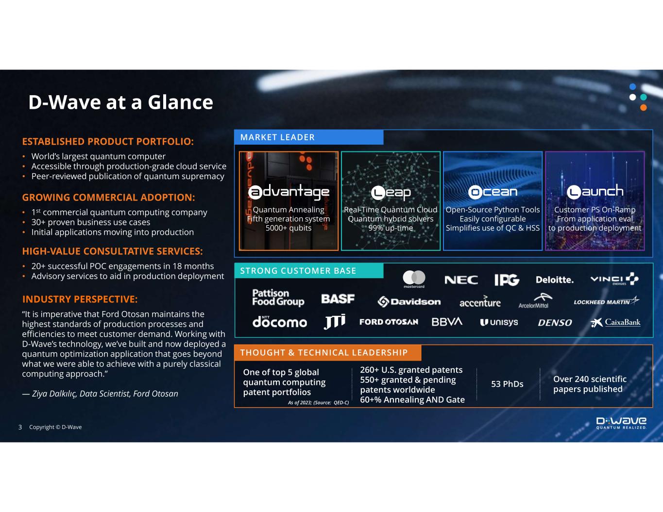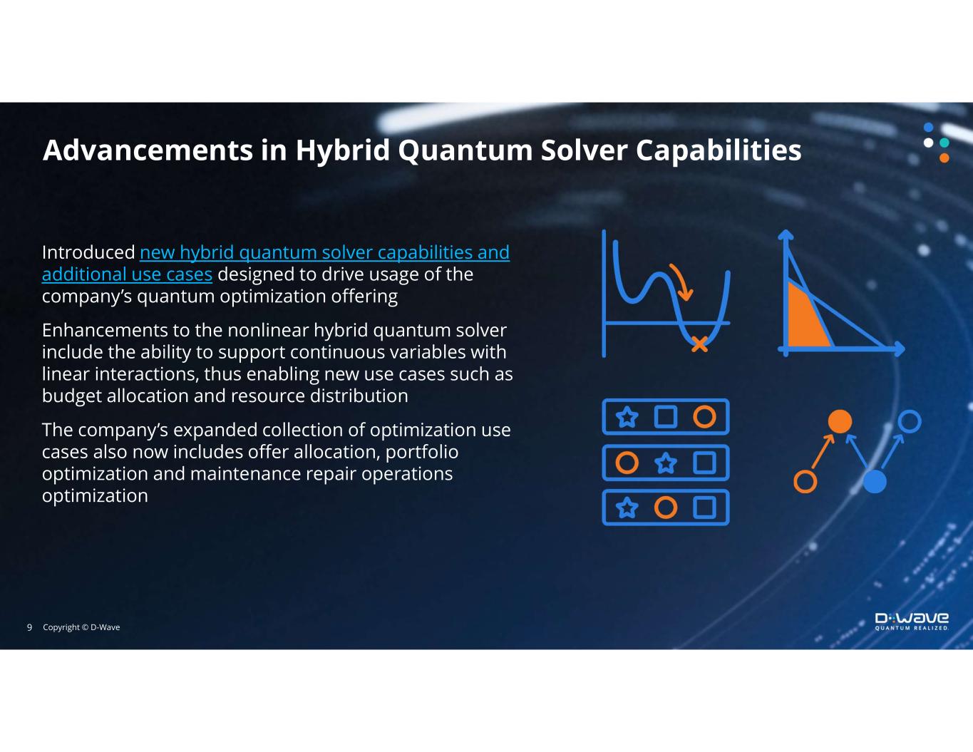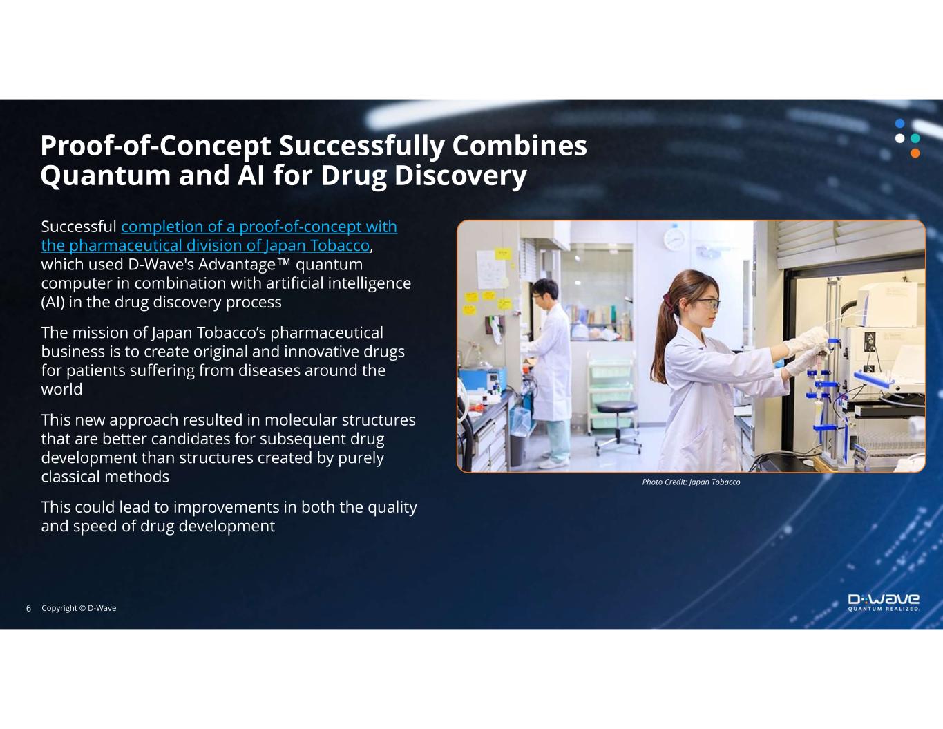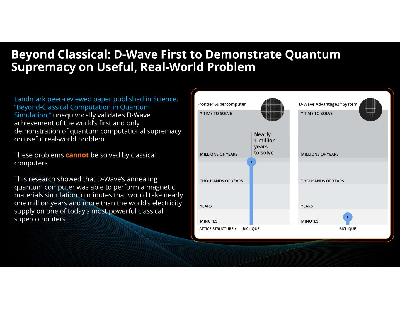 -サイエンス誌に査読付き論文 "Beyond-Classical Computation in Quantum Simulation "を発表し、D-Waveが量子計算の優位性を実世界の有用な問題で実証したことを検証した。この研究では、D-Waveのアニーリング量子コンピューターが、現在最も強力な古典的スーパーコンピューターの1つであるオークリッジ国立研究所の超並列GPUベースエクサスケールスーパーコンピューター「Frontier」では100万年近くかかり、世界の電力供給量を超えるような磁性材料シミュレーションを数分で実行できることが示された。これは、量子コンピュータが実世界の有用な問題で量子的優位性を達成した初めての例である。