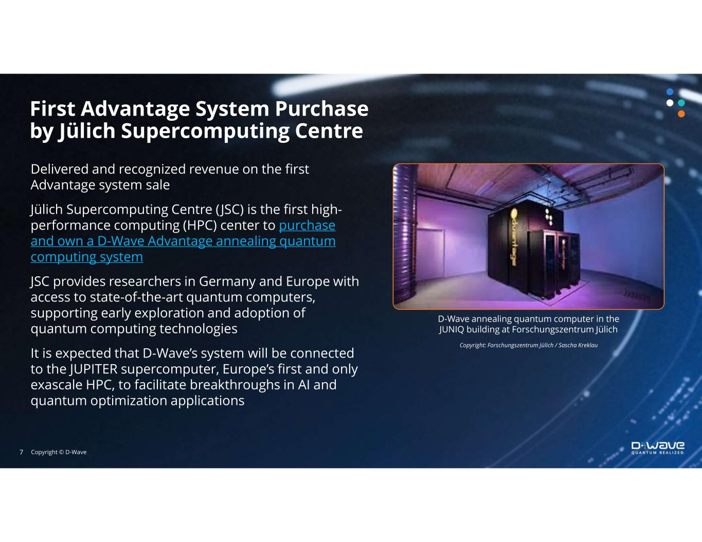 -ハイパフォーマンス・コンピューティング(HPC)センターであるユーリッヒ・スーパーコンピューティング・センターにアドバンテージ・システムを初めて納入し、売上を計上。D-Waveのシステムは、欧州初で唯一のエクサスケールHPCであるJUPITERスーパーコンピュータに接続され、AIや量子最適化アプリケーションのブレークスルーを促進することが期待されている。