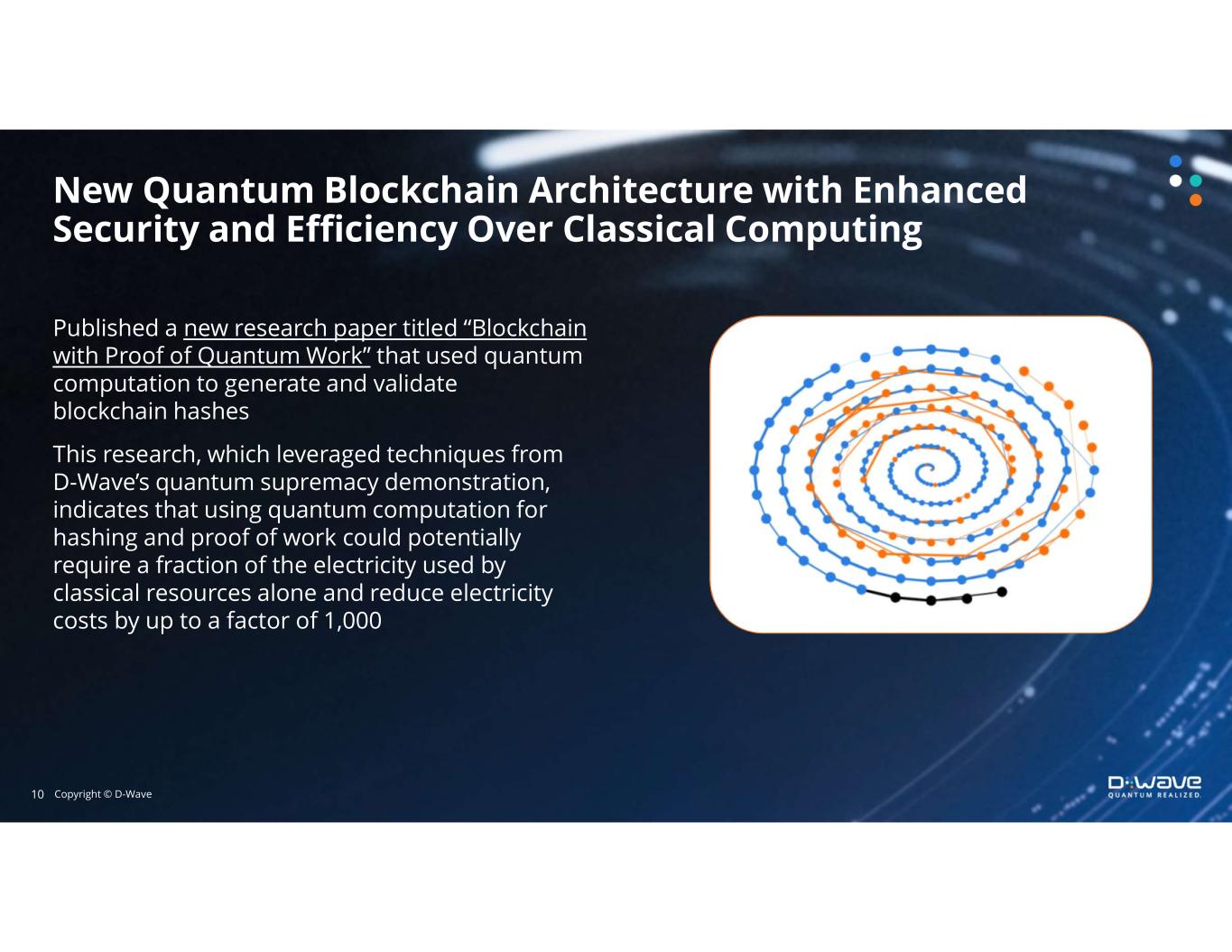 -量子計算を利用してブロックチェーンのハッシュを生成・検証する新しい研究論文「Blockchain with Proof of Quantum Work」を発表。この研究は、D-Waveの量子優位性実証の技術を活用したもので、量子計算をハッシュとプルーフ・オブ・ワークに使用することで、古典的なリソースだけで使用する電力の数分の一で済み、電気料金を最大1,000分の1に削減できる可能性があることを示している。