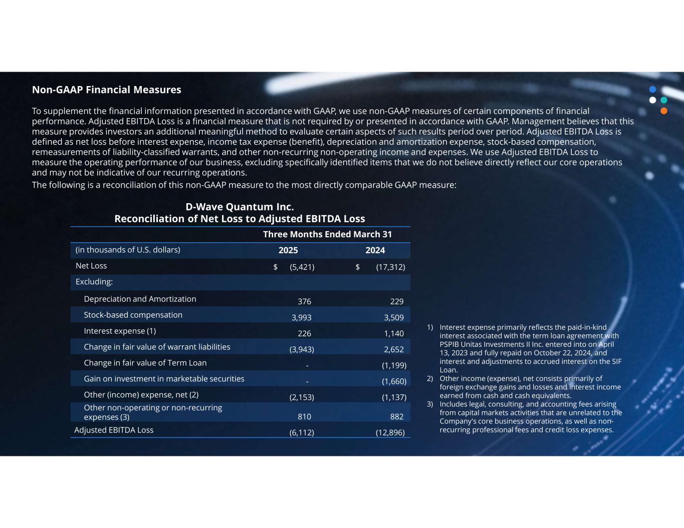 非GAAPベースの調整後営業費用2:2025年度第1四半期の非GAAPベースの調整後営業費用は2,020万ドルで、2024年度第1四半期の非GAAPベースの調整後営業費用1,480万ドルから540万ドル(36%)増加しました。GAAPベースの調整後営業費用と非GAAPベースの調整後営業費用の差額は、主に現金支出を伴わない株式報酬費用、現金支出を伴わない減価償却費および償却費、非経常的な一時的費用です。