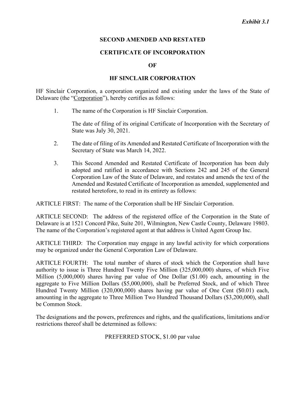 Exhibit 3.1 SECOND AMENDED AND RESTATED CERTIFICATE OF INCORPORATION OF HF SINCLAIR CORPORATION HF Sinclair Corporation, a corporation organized and existing under the laws of the State of Delaware (the “Corporation”), hereby certifies as follows: 1. The name of the Corporation is HF Sinclair Corporation. The date of filing of its original Certificate of Incorporation with the Secretary of State was July 30, 2021. 2. The date of filing of its Amended and Restated Certificate of Incorporation with the Secretary of State was March 14, 2022. 3. This Second Amended and Restated Certificate of Incorporation has been duly adopted and ratified in accordance with Sections 242 and 245 of the General Corporation Law of the State of Delaware, and restates and amends the text of the Amended and Restated Certificate of Incorporation as amended, supplemented and restated heretofore, to read in its entirety as follows: ARTICLE FIRST: The name of the Corporation shall be HF Sinclair Corporation. ARTICLE SECOND: The address of the registered office of the Corporation in the State of Delaware is at 1521 Concord Pike, Suite 201, Wilmington, New Castle County, Delaware 19803. The name of the Corporation’s registered agent at that address is United Agent Group Inc. ARTICLE THIRD: The Corporation may engage in any lawful activity for which corporations may be organized under the General Corporation Law of Delaware. ARTICLE FOURTH: The total number of shares of stock which the Corporation shall have authority to issue is Three Hundred Twenty Five Million (325,000,000) shares, of which Five Million (5,000,000) shares having par value of One Dollar ($1.00) each, amounting in the aggregate to Five Million Dollars ($5,000,000), shall be Preferred Stock, and of which Three Hundred Twenty Million (320,000,000) shares having par value of One Cent ($0.01) each, amounting in the aggregate to Three Million Two Hundred Thousand Dollars ($3,200,000), shall be Common Stock. The designations and the powers, preferences and rights, and the qualifications, limitations and/or restrictions thereof shall be determined as follows: PREFERRED STOCK, $1.00 par value