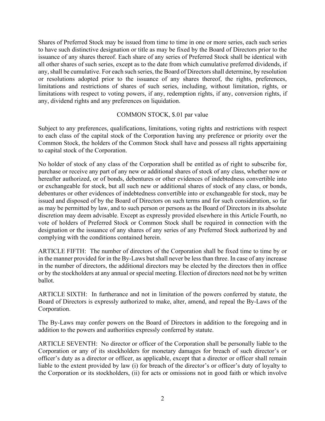 2 Shares of Preferred Stock may be issued from time to time in one or more series, each such series to have such distinctive designation or title as may be fixed by the Board of Directors prior to the issuance of any shares thereof. Each share of any series of Preferred Stock shall be identical with all other shares of such series, except as to the date from which cumulative preferred dividends, if any, shall be cumulative. For each such series, the Board of Directors shall determine, by resolution or resolutions adopted prior to the issuance of any shares thereof, the rights, preferences, limitations and restrictions of shares of such series, including, without limitation, rights, or limitations with respect to voting powers, if any, redemption rights, if any, conversion rights, if any, dividend rights and any preferences on liquidation. COMMON STOCK, $.01 par value Subject to any preferences, qualifications, limitations, voting rights and restrictions with respect to each class of the capital stock of the Corporation having any preference or priority over the Common Stock, the holders of the Common Stock shall have and possess all rights appertaining to capital stock of the Corporation. No holder of stock of any class of the Corporation shall be entitled as of right to subscribe for, purchase or receive any part of any new or additional shares of stock of any class, whether now or hereafter authorized, or of bonds, debentures or other evidences of indebtedness convertible into or exchangeable for stock, but all such new or additional shares of stock of any class, or bonds, debentures or other evidences of indebtedness convertible into or exchangeable for stock, may be issued and disposed of by the Board of Directors on such terms and for such consideration, so far as may be permitted by law, and to such person or persons as the Board of Directors in its absolute discretion may deem advisable. Except as expressly provided elsewhere in this Article Fourth, no vote of holders of Preferred Stock or Common Stock shall be required in connection with the designation or the issuance of any shares of any series of any Preferred Stock authorized by and complying with the conditions contained herein. ARTICLE FIFTH: The number of directors of the Corporation shall be fixed time to time by or in the manner provided for in the By-Laws but shall never be less than three. In case of any increase in the number of directors, the additional directors may be elected by the directors then in office or by the stockholders at any annual or special meeting. Election of directors need not be by written ballot. ARTICLE SIXTH: In furtherance and not in limitation of the powers conferred by statute, the Board of Directors is expressly authorized to make, alter, amend, and repeal the By-Laws of the Corporation. The By-Laws may confer powers on the Board of Directors in addition to the foregoing and in addition to the powers and authorities expressly conferred by statute. ARTICLE SEVENTH: No director or officer of the Corporation shall be personally liable to the Corporation or any of its stockholders for monetary damages for breach of such director’s or officer’s duty as a director or officer, as applicable, except that a director or officer shall remain liable to the extent provided by law (i) for breach of the director’s or officer’s duty of loyalty to the Corporation or its stockholders, (ii) for acts or omissions not in good faith or which involve