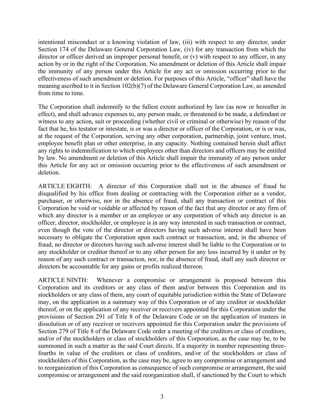 3 intentional misconduct or a knowing violation of law, (iii) with respect to any director, under Section 174 of the Delaware General Corporation Law, (iv) for any transaction from which the director or officer derived an improper personal benefit, or (v) with respect to any officer, in any action by or in the right of the Corporation. No amendment or deletion of this Article shall impair the immunity of any person under this Article for any act or omission occurring prior to the effectiveness of such amendment or deletion. For purposes of this Article, “officer” shall have the meaning ascribed to it in Section 102(b)(7) of the Delaware General Corporation Law, as amended from time to time. The Corporation shall indemnify to the fullest extent authorized by law (as now or hereafter in effect), and shall advance expenses to, any person made, or threatened to be made, a defendant or witness to any action, suit or proceeding (whether civil or criminal or otherwise) by reason of the fact that he, his testator or intestate, is or was a director or officer of the Corporation, or is or was, at the request of the Corporation, serving any other corporation, partnership, joint venture, trust, employee benefit plan or other enterprise, in any capacity. Nothing contained herein shall affect any rights to indemnification to which employees other than directors and officers may be entitled by law. No amendment or deletion of this Article shall impair the immunity of any person under this Article for any act or omission occurring prior to the effectiveness of such amendment or deletion. ARTICLE EIGHTH: A director of this Corporation shall not in the absence of fraud be disqualified by his office from dealing or contracting with the Corporation either as a vendor, purchaser, or otherwise, nor in the absence of fraud, shall any transaction or contract of this Corporation be void or voidable or affected by reason of the fact that any director or any firm of which any director is a member or an employee or any corporation of which any director is an officer, director, stockholder, or employee is in any way interested in such transaction or contract, even though the vote of the director or directors having such adverse interest shall have been necessary to obligate the Corporation upon such contract or transaction, and, in the absence of fraud, no director or directors having such adverse interest shall be liable to the Corporation or to any stockholder or creditor thereof or to any other person for any loss incurred by it under or by reason of any such contract or transaction, nor, in the absence of fraud, shall any such director or directors be accountable for any gains or profits realized thereon. ARTICLE NINTH: Whenever a compromise or arrangement is proposed between this Corporation and its creditors or any class of them and/or between this Corporation and its stockholders or any class of them, any court of equitable jurisdiction within the State of Delaware may, on the application in a summary way of this Corporation or of any creditor or stockholder thereof, or on the application of any receiver or receivers appointed for this Corporation under the provisions of Section 291 of Title 8 of the Delaware Code or on the application of trustees in dissolution or of any receiver or receivers appointed for this Corporation under the provisions of Section 279 of Title 8 of the Delaware Code order a meeting of the creditors or class of creditors, and/or of the stockholders or class of stockholders of this Corporation, as the case may be, to be summoned in such a matter as the said Court directs. If a majority in number representing three- fourths in value of the creditors or class of creditors, and/or of the stockholders or class of stockholders of this Corporation, as the case may be, agree to any compromise or arrangement and to reorganization of this Corporation as consequence of such compromise or arrangement, the said compromise or arrangement and the said reorganization shall, if sanctioned by the Court to which
