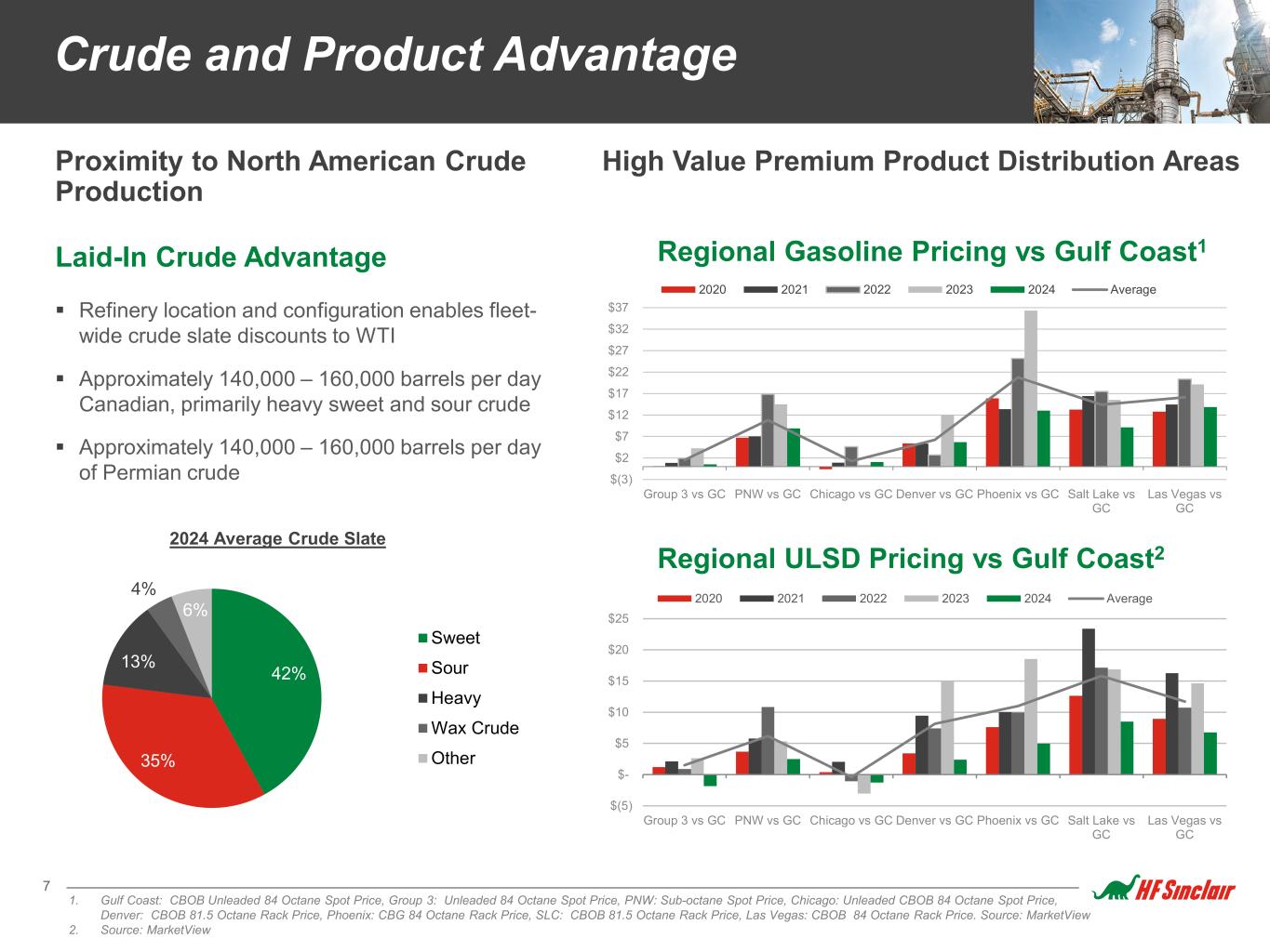 6 Refining Overview Expanded Footprint centered around Mid-Continent, Southwest, Rocky Mountain and Pacific Northwest with 678,000 BPD oil processing capacity West Region Puget Sound Refinery (Anacortes, WA) 149,000 BPD capacity Crude slate: Canadian mixed sweet and sour and Alaskan North Slope crude Distributes to locations in WA, OR, and British Columbia Navajo Refinery (Artesia, NM) 100,000 BPD capacity Crude slate: Permian sweet and sour crude Distributes to locations in AZ, NM, west TX and northern Mexico Parco Refinery (Sinclair, WY) 94,000 BPD capacity Crude slate: Canadian heavy and Rockies sweet crude Distributes to locations in greater Rocky Mountain region Woods Cross Refinery (Salt Lake City, UT) 45,000 BPD capacity Crude slate: Regional sweet and heavy crude Distributes to locations in UT, ID, NV, WY, and eastern WA Casper Refinery (Casper, WY) 30,000 BPD capacity Crude slate: Rockies sweet Distributes to locations in greater Rocky Mountain region and western SD Mid-Continent Region El Dorado Refinery (El Dorado, KS) 135,000 BPD capacity Crude slate: WCS, Bakken and Permian sour crude Distributes to locations in CO and Plains states Tulsa Refinery (Tulsa, OK) 125,000 BPD capacity Crude slate: Domestic sweet with up to 10,000 BPD of WCS crude Distributes to locations in Mid-Continent states Integrated refinery with base oil and lubricant production
