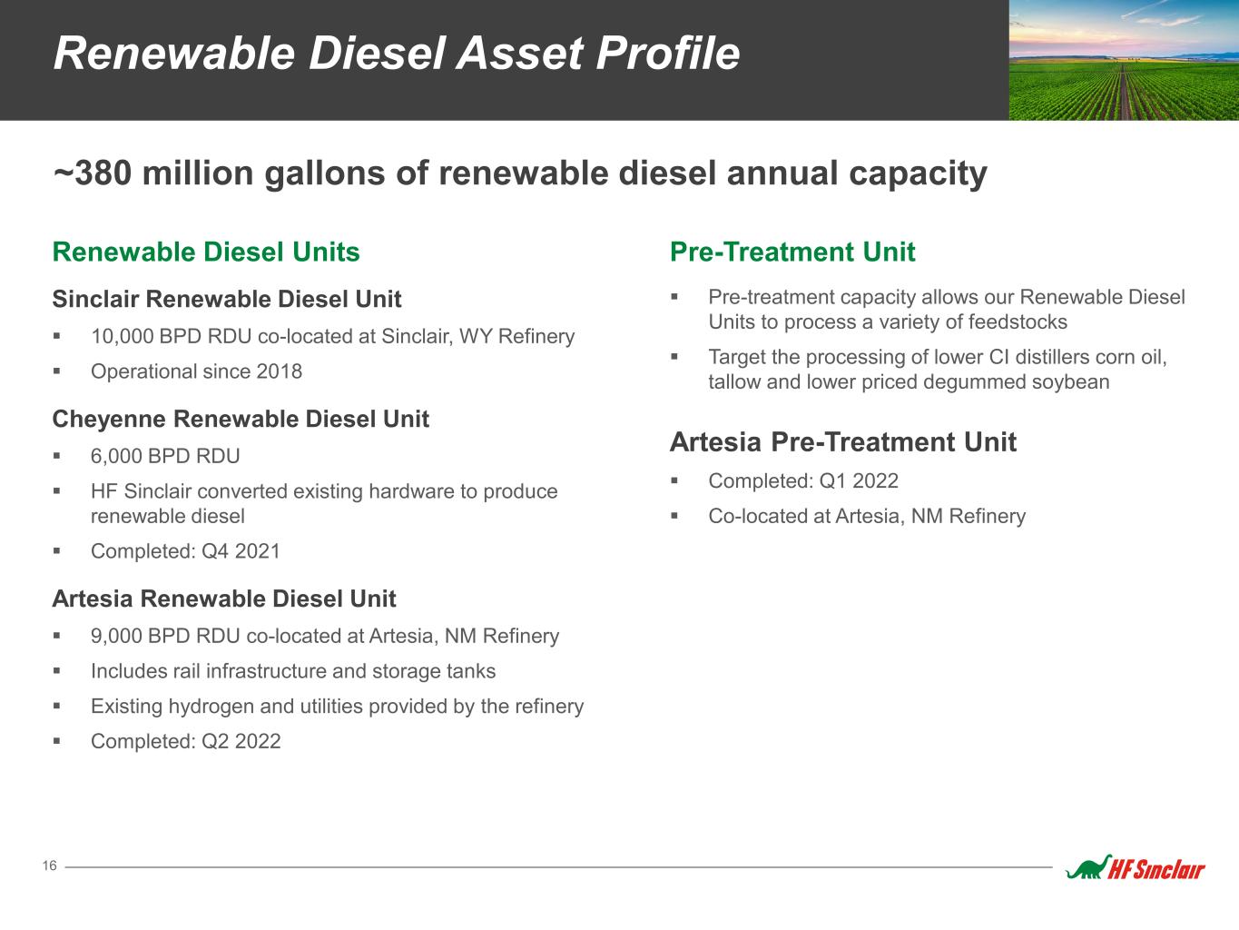 15 Renewables Overview Creating Large Scale Leading Renewables Business A leading U.S. producer of Renewable Diesel with 3 production facilities ~380 million gallons of renewable diesel annual capacity Pre-treatment unit providing significant feedstock flexibility Size and scale support operational synergies Supports consumer preference for low carbon fuels, driving expansion of government renewable fuel programs, requirements and incentives to more states in the United States and across the world HF Sinclair can leverage utilities and infrastructure at existing refineries for renewables production Integrated solution to the Renewable Fuels Standard (RFS) Strengthens ESG profile Renewable Diesel Defined Renewable diesel is a cleaner burning fuel with 50% to 80% lower lifecycle GHG emissions than conventional diesel Renewable diesel is not biodiesel Same feedstock Different process Chemically identical to conventional diesel No blend limit, existing diesel fleet can run 100% with no risk to engine operation