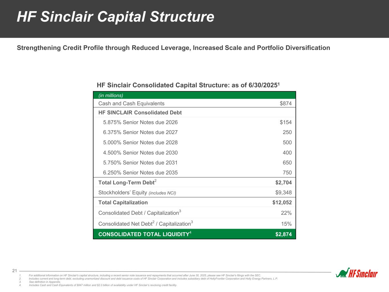 Note: Reflective of Capex expectations provided in December 3, 2024 8-K filing and Form 10-Q for the quarterly period ending June 30, 2025. Refining 27% Renewables 1% Lubricants & Specialties 5% Marketing 3% Corporate 2%Turnarounds & Catalysts 47% Midstream 3% Growth 11% 2025 Expected Capex Allocation 2025 Capex Guidance 20 HF Sinclair Capital Expenditures Plan (In Millions) Sustaining Capital Investments Refining $ 240 Renewables 5 Marketing 30 Lubricants & Specialties 40 Midstream 30 Corporate 20 Turnarounds & Catalysts 410 Total Sustaining 775 Growth Capital Investments 100 Total Capital $ 875