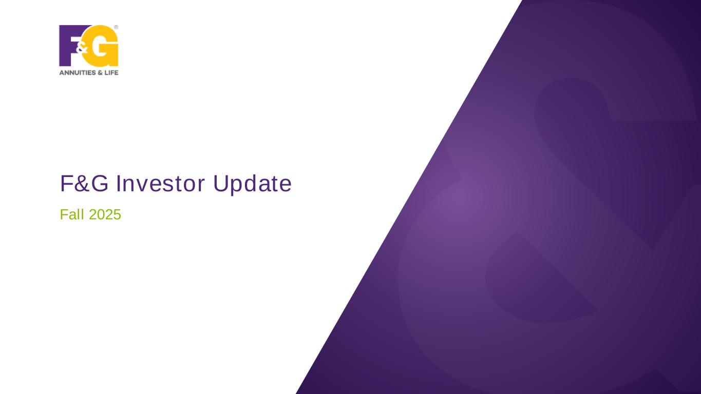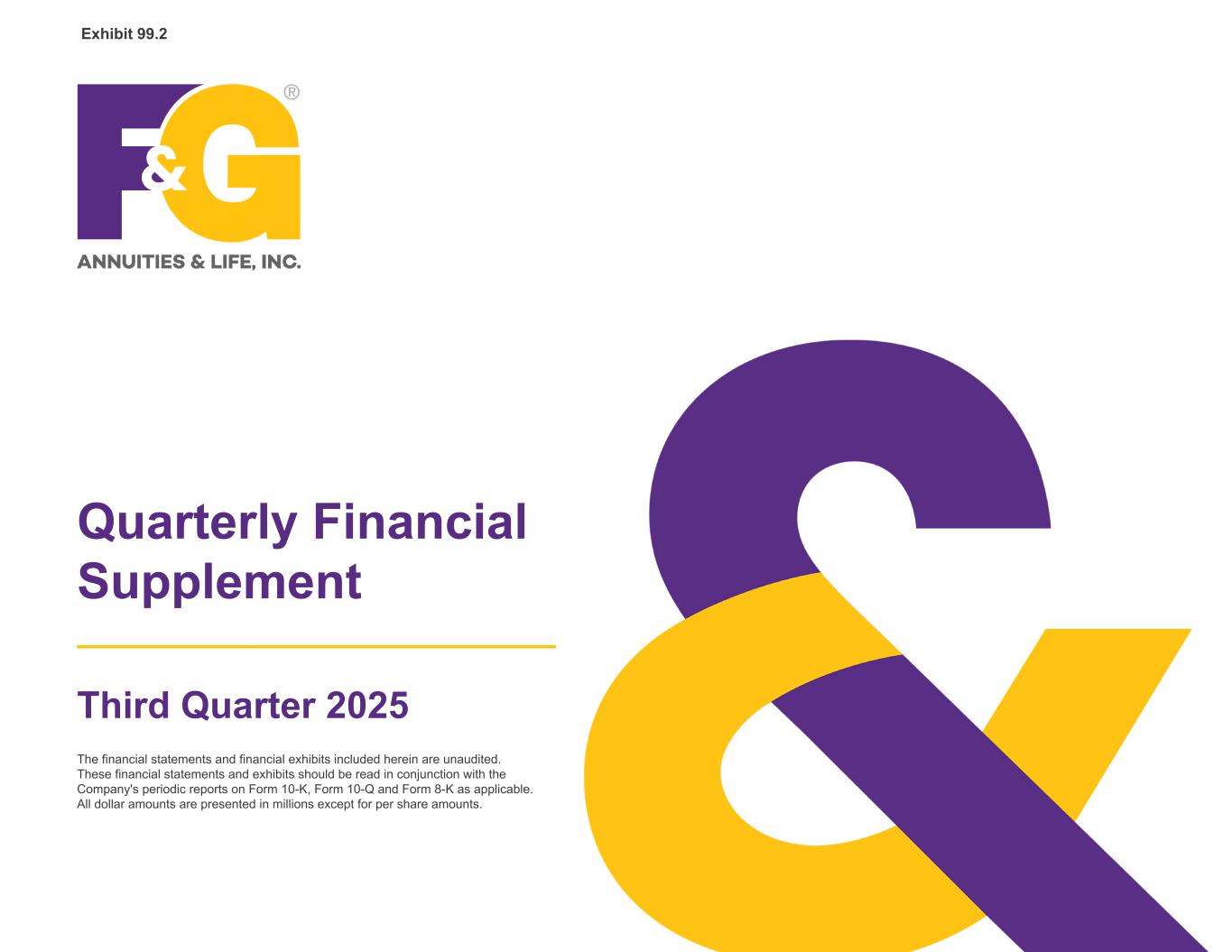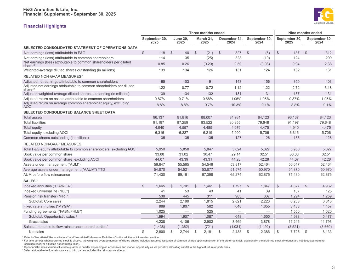 Financial Highlights Three months ended Nine months ended September 30, 2025 June 30, 2025 March 31, 2025 December 31, 2024 September 30, 2024 September 30, 2025 September 30, 2024 SELECTED CONSOLIDATED STATEMENT OF OPERATIONS DATA Net earnings (loss) attributable to F&G $ 118 $ 40 $ (21) $ 327 $ (6) $ 137 $ 312 Net earnings (loss) attributable to common shareholders 114 35 (25) 323 (10) 124 299 Net earnings (loss) attributable to common shareholders per diluted share ² 0.85 0.26 (0.20) 2.50 (0.08) 0.94 2.38 Weighted-average diluted shares outstanding (in millions) 139 134 126 131 124 132 131 RELATED NON-GAAP MEASURES ¹ Adjusted net earnings attributable to common shareholders 165 103 91 143 156 359 403 Adjusted net earnings attributable to common shareholders per diluted share ² 1.22 0.77 0.72 1.12 1.22 2.72 3.18 Adjusted weighted-average diluted shares outstanding (in millions) 139 134 132 131 131 137 131 Adjusted return on assets attributable to common shareholders 0.87 % 0.71 % 0.68 % 1.06 % 1.05 % 0.87 % 1.05 % Adjusted return on average common shareholder equity, excluding AOCI 8.8 % 8.8 % 9.7 % 10.3 % 9.1 % 8.8 % 9.1 % SELECTED CONSOLIDATED BALANCE SHEET DATA Total assets 96,137 91,816 88,007 84,931 84,123 96,137 84,123 Total liabilities 91,197 87,259 83,522 80,855 79,648 91,197 79,648 Total equity 4,940 4,557 4,485 4,076 4,475 4,940 4,475 Total equity, excluding AOCI 6,316 6,227 6,219 5,999 5,706 6,316 5,706 Common shares outstanding (in millions) 135 135 135 127 126 135 126 RELATED NON-GAAP MEASURES ¹ Total F&G equity attributable to common shareholders, excluding AOCI 5,950 5,858 5,847 5,624 5,327 5,950 5,327 Book value per common share 33.88 31.02 30.47 29.14 32.51 33.88 32.51 Book value per common share, excluding AOCI 44.07 43.39 43.31 44.28 42.28 44.07 42.28 Assets under management ("AUM") 56,647 55,565 54,546 53,817 52,464 56,647 52,464 Average assets under management ("AAUM") YTD 54,870 54,521 53,877 51,574 50,970 54,870 50,970 AUM before flow reinsurance 71,430 69,161 67,398 65,274 62,875 71,430 62,875 SALES ¹ Indexed annuities ("FIA/RILA") $ 1,665 $ 1,701 $ 1,461 $ 1,797 $ 1,847 $ 4,827 $ 4,932 Indexed universal life ("IUL") 41 53 43 41 39 137 125 Pension risk transfer ("PRT") 538 445 311 983 337 1,294 1,259 Subtotal: Core sales 2,244 2,199 1,815 2,821 2,223 6,258 6,316 Fixed rate annuities ("MYGA") 969 1,907 562 648 1,655 3,438 4,457 Funding agreements ("FABN/FHLB") 1,025 — 525 — — 1,550 1,020 Subtotal: Opportunistic sales ³ 1,994 1,907 1,087 648 1,655 4,988 5,477 Gross sales 4,238 4,106 2,902 3,469 3,878 11,246 11,793 Sales attributable to flow reinsurance to third parties ⁴ (1,438) (1,362) (721) (1,031) (1,492) (3,521) (3,660) Net sales $ 2,800 $ 2,744 $ 2,181 $ 2,438 $ 2,386 $ 7,725 $ 8,133 ¹ Refer to "Non-GAAP Reconciliations" and "Non-GAAP Measures Definitions" in the additional information section. ² For time periods when preferred stock is dilutive, the weighted average number of diluted shares includes assumed issuance of common shares upon conversion of the preferred stock; additionally, the preferred stock dividends are not deducted from net earnings (loss) or adjusted net earnings (loss). ³ Opportunistic sales volumes fluctuate quarter to quarter depending on economics and market opportunity as we prioritize allocating capital to the highest return opportunities. ⁴ Sales attributable to flow reinsurance to third parties includes the reinsurance sidecar. F&G Annuities & Life, Inc. Financial Supplement - September 30, 2025 3