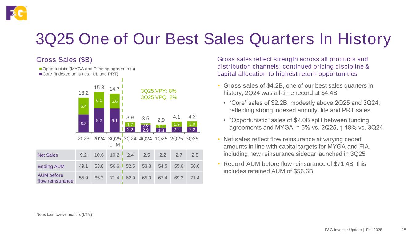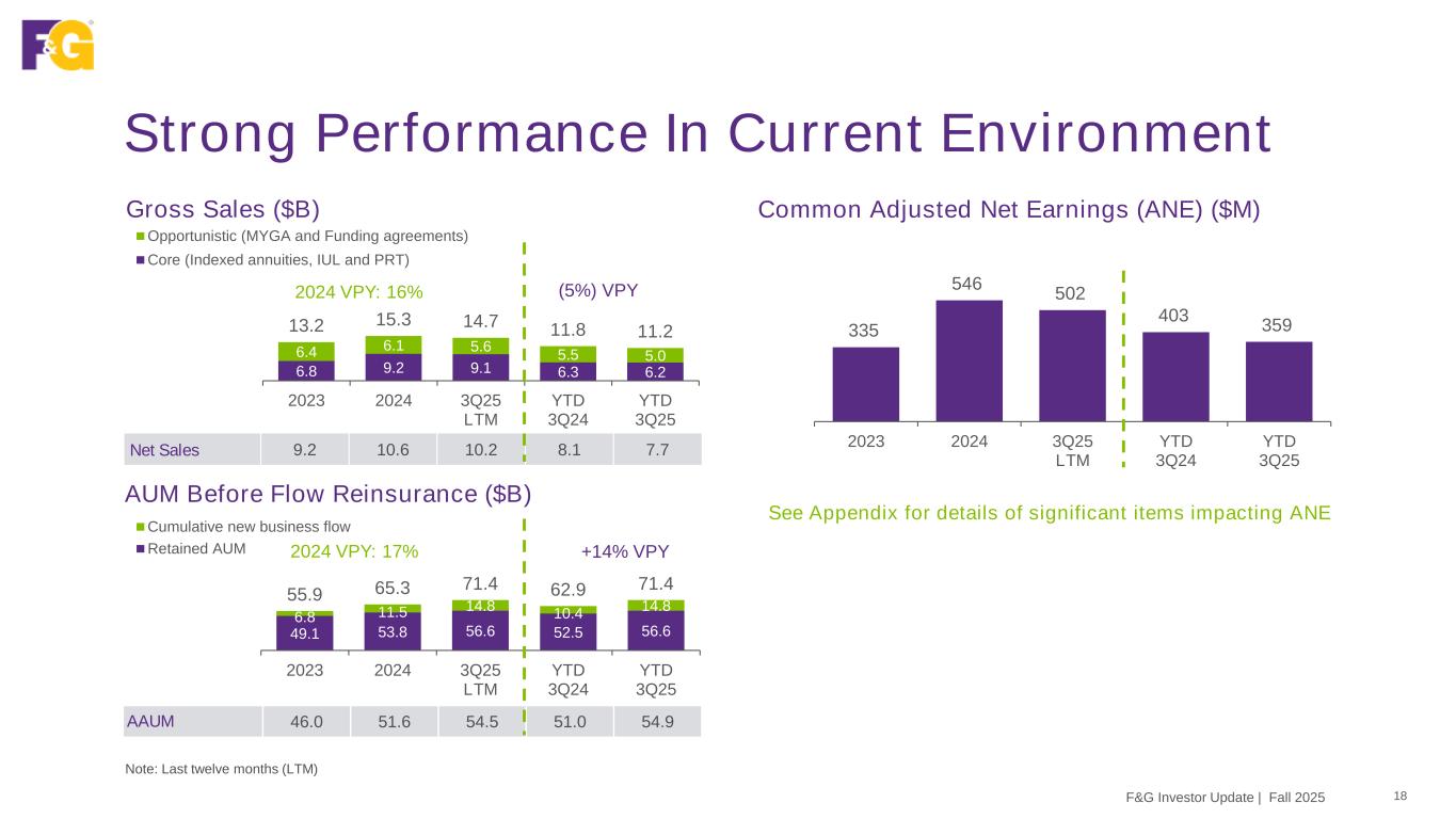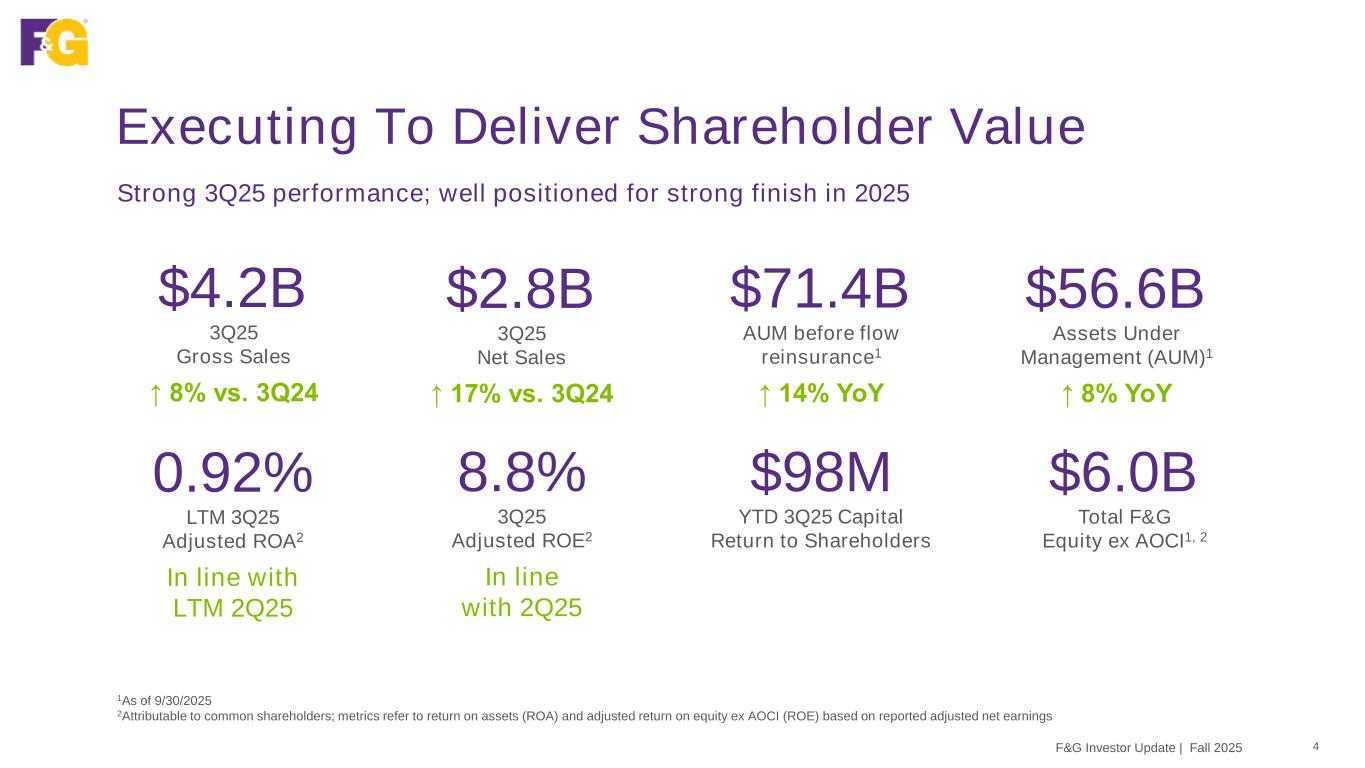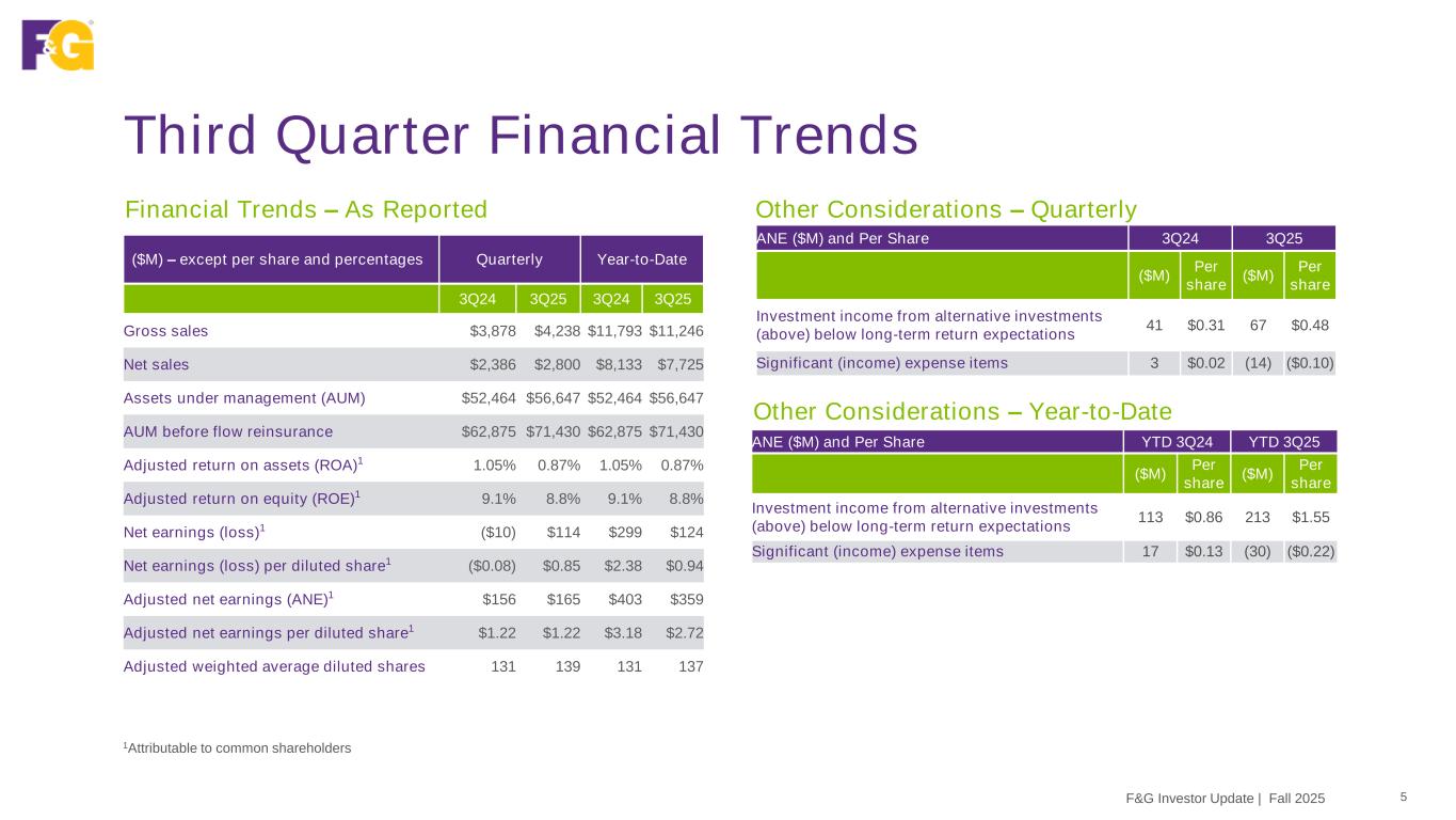 Financial Highlights Three months ended Nine months ended September 30, 2025 June 30, 2025 March 31, 2025 December 31, 2024 September 30, 2024 September 30, 2025 September 30, 2024 SELECTED CONSOLIDATED STATEMENT OF OPERATIONS DATA Net earnings (loss) attributable to F&G $ 118 $ 40 $ (21) $ 327 $ (6) $ 137 $ 312 Net earnings (loss) attributable to common shareholders 114 35 (25) 323 (10) 124 299 Net earnings (loss) attributable to common shareholders per diluted share ² 0.85 0.26 (0.20) 2.50 (0.08) 0.94 2.38 Weighted-average diluted shares outstanding (in millions) 139 134 126 131 124 132 131 RELATED NON-GAAP MEASURES ¹ Adjusted net earnings attributable to common shareholders 165 103 91 143 156 359 403 Adjusted net earnings attributable to common shareholders per diluted share ² 1.22 0.77 0.72 1.12 1.22 2.72 3.18 Adjusted weighted-average diluted shares outstanding (in millions) 139 134 132 131 131 137 131 Adjusted return on assets attributable to common shareholders 0.87 % 0.71 % 0.68 % 1.06 % 1.05 % 0.87 % 1.05 % Adjusted return on average common shareholder equity, excluding AOCI 8.8 % 8.8 % 9.7 % 10.3 % 9.1 % 8.8 % 9.1 % SELECTED CONSOLIDATED BALANCE SHEET DATA Total assets 96,137 91,816 88,007 84,931 84,123 96,137 84,123 Total liabilities 91,197 87,259 83,522 80,855 79,648 91,197 79,648 Total equity 4,940 4,557 4,485 4,076 4,475 4,940 4,475 Total equity, excluding AOCI 6,316 6,227 6,219 5,999 5,706 6,316 5,706 Common shares outstanding (in millions) 135 135 135 127 126 135 126 RELATED NON-GAAP MEASURES ¹ Total F&G equity attributable to common shareholders, excluding AOCI 5,950 5,858 5,847 5,624 5,327 5,950 5,327 Book value per common share 33.88 31.02 30.47 29.14 32.51 33.88 32.51 Book value per common share, excluding AOCI 44.07 43.39 43.31 44.28 42.28 44.07 42.28 Assets under management ("AUM") 56,647 55,565 54,546 53,817 52,464 56,647 52,464 Average assets under management ("AAUM") YTD 54,870 54,521 53,877 51,574 50,970 54,870 50,970 AUM before flow reinsurance 71,430 69,161 67,398 65,274 62,875 71,430 62,875 SALES ¹ Indexed annuities ("FIA/RILA") $ 1,665 $ 1,701 $ 1,461 $ 1,797 $ 1,847 $ 4,827 $ 4,932 Indexed universal life ("IUL") 41 53 43 41 39 137 125 Pension risk transfer ("PRT") 538 445 311 983 337 1,294 1,259 Subtotal: Core sales 2,244 2,199 1,815 2,821 2,223 6,258 6,316 Fixed rate annuities ("MYGA") 969 1,907 562 648 1,655 3,438 4,457 Funding agreements ("FABN/FHLB") 1,025 — 525 — — 1,550 1,020 Subtotal: Opportunistic sales ³ 1,994 1,907 1,087 648 1,655 4,988 5,477 Gross sales 4,238 4,106 2,902 3,469 3,878 11,246 11,793 Sales attributable to flow reinsurance to third parties ⁴ (1,438) (1,362) (721) (1,031) (1,492) (3,521) (3,660) Net sales $ 2,800 $ 2,744 $ 2,181 $ 2,438 $ 2,386 $ 7,725 $ 8,133 ¹ Refer to "Non-GAAP Reconciliations" and "Non-GAAP Measures Definitions" in the additional information section. ² For time periods when preferred stock is dilutive, the weighted average number of diluted shares includes assumed issuance of common shares upon conversion of the preferred stock; additionally, the preferred stock dividends are not deducted from net earnings (loss) or adjusted net earnings (loss). ³ Opportunistic sales volumes fluctuate quarter to quarter depending on economics and market opportunity as we prioritize allocating capital to the highest return opportunities. ⁴ Sales attributable to flow reinsurance to third parties includes the reinsurance sidecar. F&G Annuities & Life, Inc. Financial Supplement - September 30, 2025 3