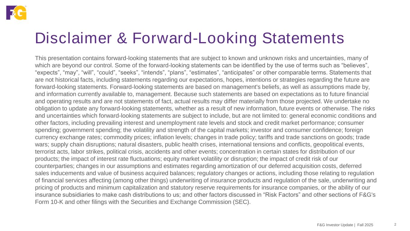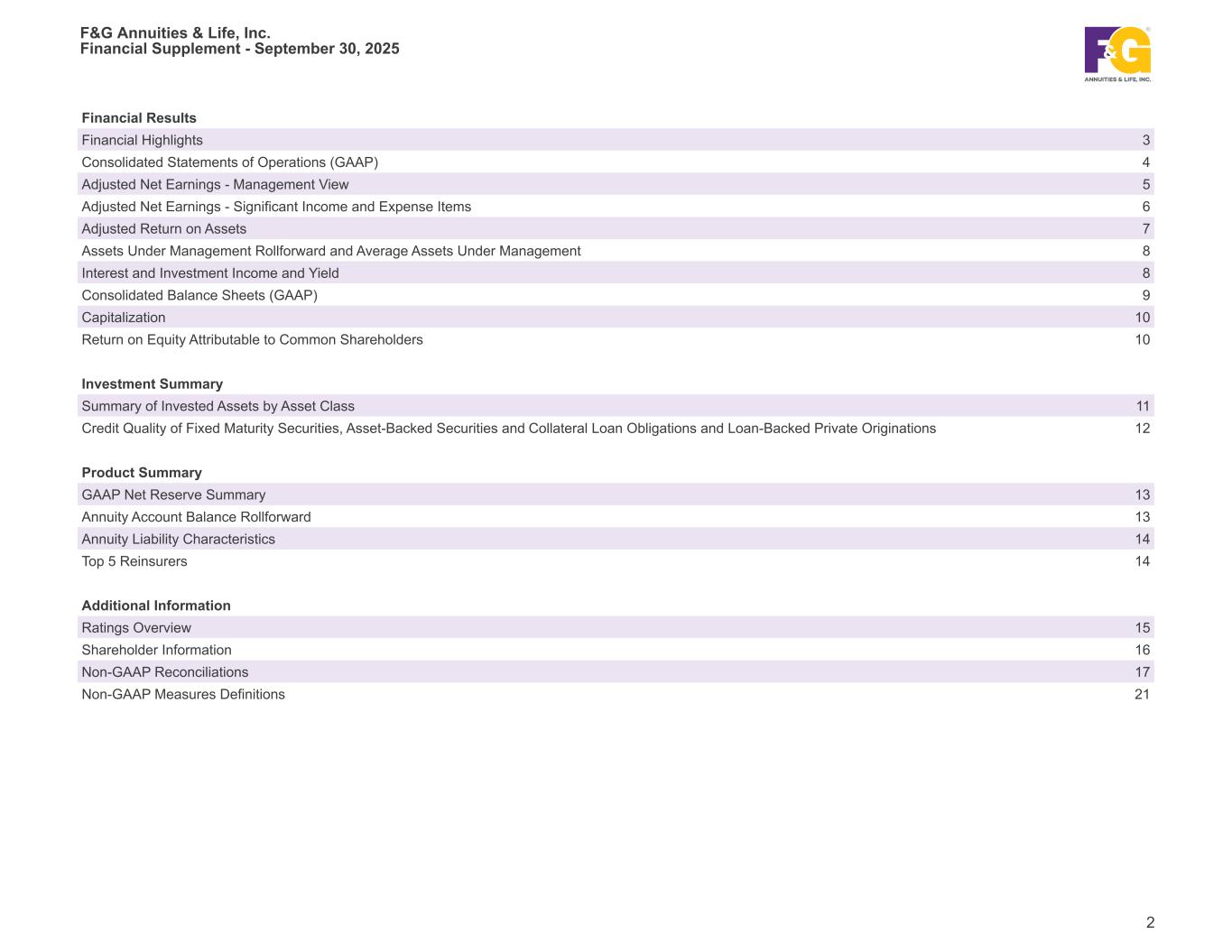 Financial Results Financial Highlights 3 Consolidated Statements of Operations (GAAP) 4 Adjusted Net Earnings - Management View 5 Adjusted Net Earnings - Significant Income and Expense Items 6 Adjusted Return on Assets 7 Assets Under Management Rollforward and Average Assets Under Management 8 Interest and Investment Income and Yield 8 Consolidated Balance Sheets (GAAP) 9 Capitalization 10 Return on Equity Attributable to Common Shareholders 10 Investment Summary Summary of Invested Assets by Asset Class 11 Credit Quality of Fixed Maturity Securities, Asset-Backed Securities and Collateral Loan Obligations and Loan-Backed Private Originations 12 Product Summary GAAP Net Reserve Summary 13 Annuity Account Balance Rollforward 13 Annuity Liability Characteristics 14 Top 5 Reinsurers 14 Additional Information Ratings Overview 15 Shareholder Information 16 Non-GAAP Reconciliations 17 Non-GAAP Measures Definitions 21 F&G Annuities & Life, Inc. Financial Supplement - September 30, 2025 2