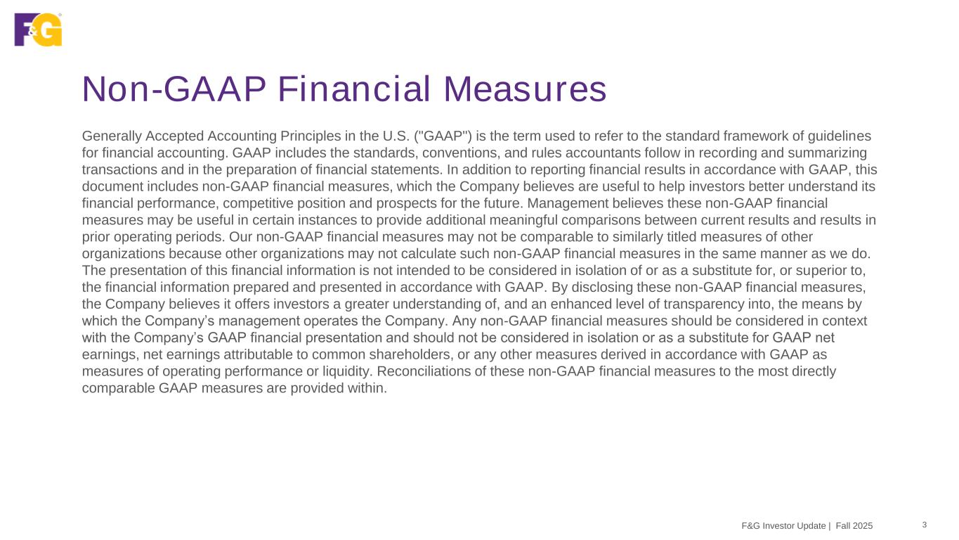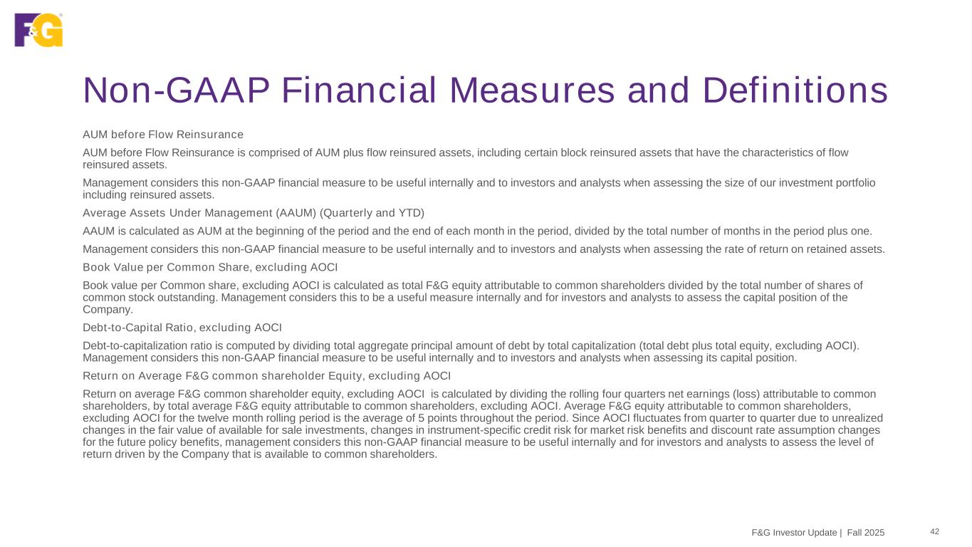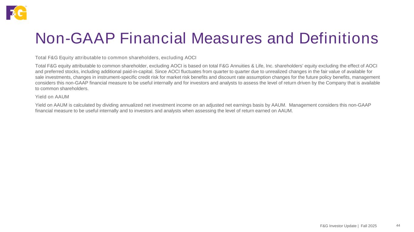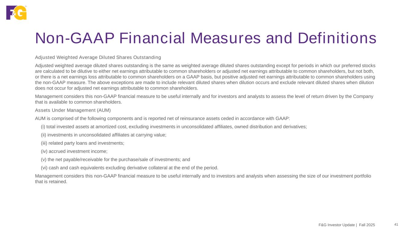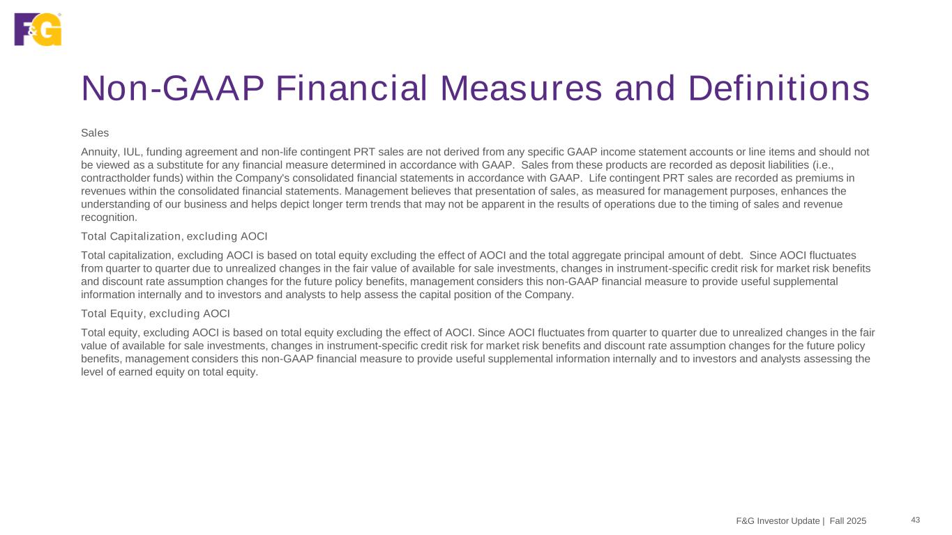 Non-GAAP Measures Definitions (continued) Average Assets Under Management (AAUM) (Quarterly and YTD) AAUM is calculated as AUM at the beginning of the period and the end of each month in the period, divided by the total number of months in the period plus one. Management considers this non-GAAP financial measure to be useful internally and to investors and analysts when assessing the rate of return on retained assets. Book Value per Common Share, excluding AOCI Book value per Common share, excluding AOCI is calculated as total F&G equity attributable to common shareholders divided by the total number of shares of common stock outstanding. Management considers this to be a useful measure internally and for investors and analysts to assess the capital position of the Company. Return on Average F&G common shareholder Equity, excluding AOCI Return on average F&G common shareholder equity, excluding AOCI is calculated by dividing the rolling four quarters net earnings (loss) attributable to common shareholders, by total average F&G equity attributable to common shareholders, excluding AOCI. Average F&G equity attributable to common shareholders, excluding AOCI for the twelve month rolling period is the average of 5 points throughout the period. Since AOCI fluctuates from quarter to quarter due to unrealized changes in the fair value of available for sale investments, changes in instrument-specific credit risk for market risk benefits and discount rate assumption changes for the future policy benefits, management considers this non-GAAP financial measure to be useful internally and for investors and analysts to assess the level of return driven by the Company that is available to common shareholders. Sales Annuity, IUL, funding agreement and non-life contingent PRT sales are not derived from any specific GAAP income statement accounts or line items and should not be viewed as a substitute for any financial measure determined in accordance with GAAP. Sales from these products are recorded as deposit liabilities (i.e., contractholder funds) within the Company's consolidated financial statements in accordance with GAAP. Life contingent PRT sales are recorded as premiums in revenues within the consolidated financial statements. Management believes that presentation of sales, as measured for management purposes, enhances the understanding of our business and helps depict longer term trends that may not be apparent in the results of operations due to the timing of sales and revenue recognition. Total Capitalization, excluding AOCI Total capitalization, excluding AOCI is based on total equity excluding the effect of AOCI and the total aggregate principal amount of debt. Since AOCI fluctuates from quarter to quarter due to unrealized changes in the fair value of available for sale investments, changes in instrument-specific credit risk for market risk benefits and discount rate assumption changes for the future policy benefits, management considers this non-GAAP financial measure to provide useful supplemental information internally and to investors and analysts to help assess the capital position of the Company. Debt-to-Capitalization Ratio, excluding AOCI Debt-to-capitalization ratio is computed by dividing total aggregate principal amount of debt by total capitalization (total debt plus total equity, excluding AOCI). Management considers this non-GAAP financial measure to be useful internally and to investors and analysts when assessing its capital position. Total Equity, excluding AOCI Total equity, excluding AOCI is based on total equity excluding the effect of AOCI. Since AOCI fluctuates from quarter to quarter due to unrealized changes in the fair value of available for sale investments, changes in instrument-specific credit risk for market risk benefits and discount rate assumption changes for the future policy benefits, management considers this non-GAAP financial measure to provide useful supplemental information internally and to investors and analysts assessing the level of earned equity on total equity. Total F&G Equity attributable to common shareholders, excluding AOCI Total F&G equity attributable to common shareholder, excluding AOCI is based on total F&G Annuities & Life, Inc. shareholders' equity excluding the effect of AOCI and preferred stocks, including additional paid-in-capital. Since AOCI fluctuates from quarter to quarter due to unrealized changes in the fair value of available for sale investments, changes in instrument-specific credit risk for market risk benefits and discount rate assumption changes for the future policy benefits, management considers this non-GAAP financial measure to be useful internally and for investors and analysts to assess the level of return driven by the Company that is available to common shareholders. Yield on AAUM Yield on AAUM is calculated by dividing annualized GAAP net investment income by AAUM. Management considers this non-GAAP financial measure to be useful internally and to investors and analysts when assessing the level of return earned on AAUM. F&G Annuities & Life, Inc. Financial Supplement - September 30, 2025 23