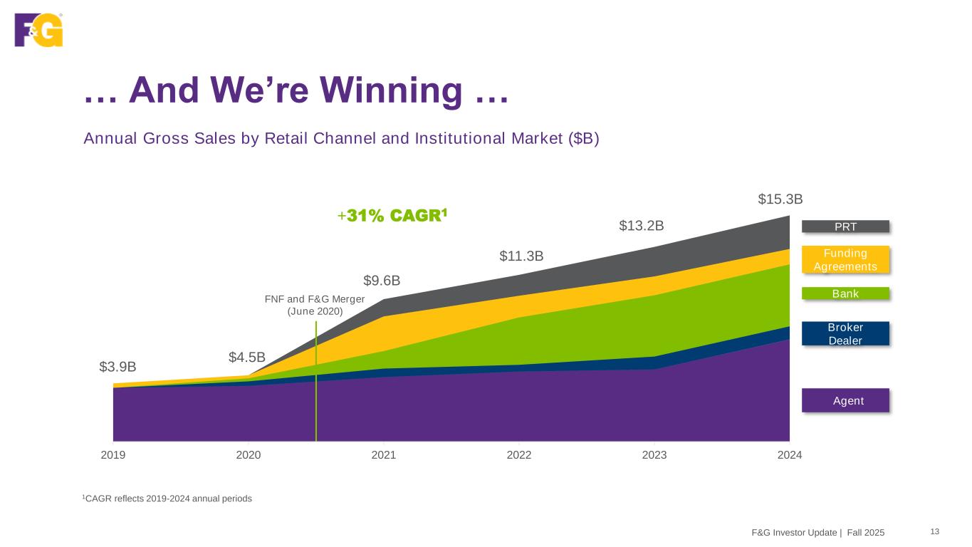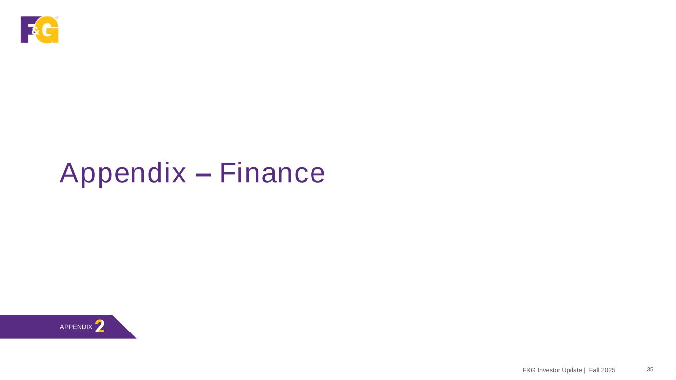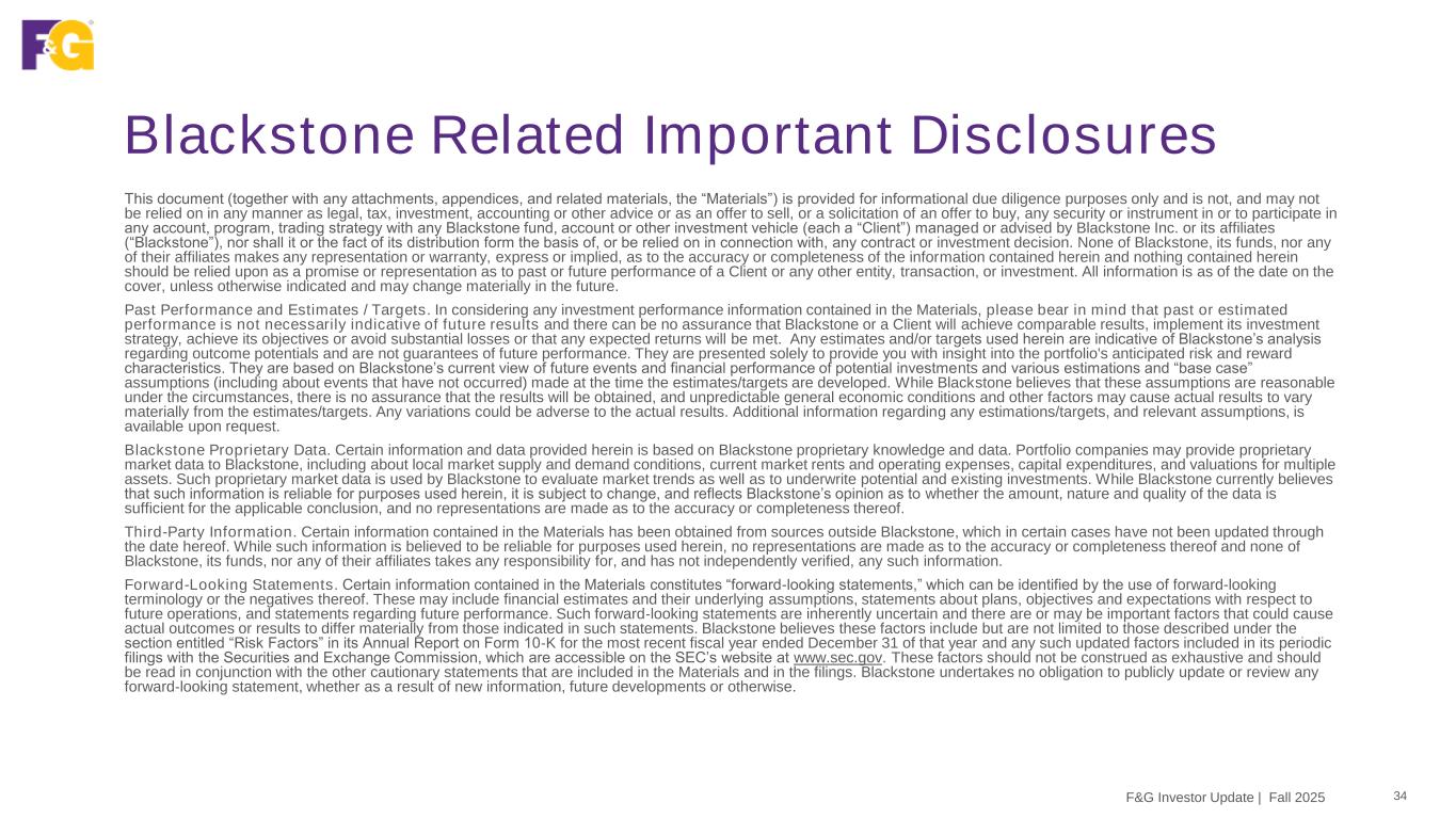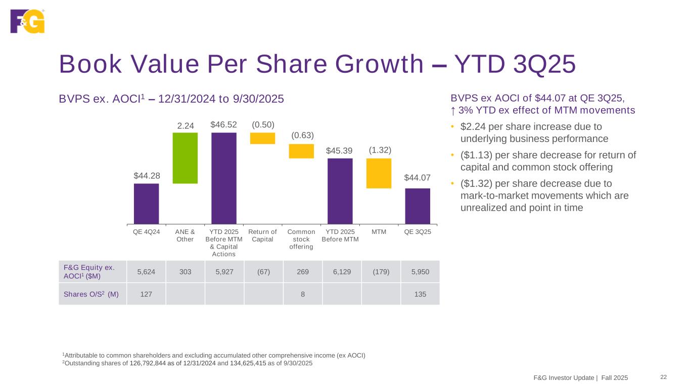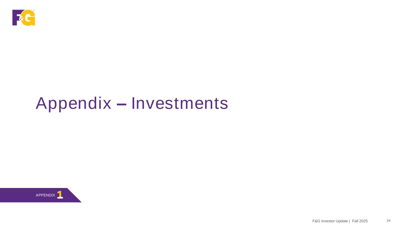 Non-GAAP Measures Definitions (continued) Average Assets Under Management (AAUM) (Quarterly and YTD) AAUM is calculated as AUM at the beginning of the period and the end of each month in the period, divided by the total number of months in the period plus one. Management considers this non-GAAP financial measure to be useful internally and to investors and analysts when assessing the rate of return on retained assets. Book Value per Common Share, excluding AOCI Book value per Common share, excluding AOCI is calculated as total F&G equity attributable to common shareholders divided by the total number of shares of common stock outstanding. Management considers this to be a useful measure internally and for investors and analysts to assess the capital position of the Company. Return on Average F&G common shareholder Equity, excluding AOCI Return on average F&G common shareholder equity, excluding AOCI is calculated by dividing the rolling four quarters net earnings (loss) attributable to common shareholders, by total average F&G equity attributable to common shareholders, excluding AOCI. Average F&G equity attributable to common shareholders, excluding AOCI for the twelve month rolling period is the average of 5 points throughout the period. Since AOCI fluctuates from quarter to quarter due to unrealized changes in the fair value of available for sale investments, changes in instrument-specific credit risk for market risk benefits and discount rate assumption changes for the future policy benefits, management considers this non-GAAP financial measure to be useful internally and for investors and analysts to assess the level of return driven by the Company that is available to common shareholders. Sales Annuity, IUL, funding agreement and non-life contingent PRT sales are not derived from any specific GAAP income statement accounts or line items and should not be viewed as a substitute for any financial measure determined in accordance with GAAP. Sales from these products are recorded as deposit liabilities (i.e., contractholder funds) within the Company's consolidated financial statements in accordance with GAAP. Life contingent PRT sales are recorded as premiums in revenues within the consolidated financial statements. Management believes that presentation of sales, as measured for management purposes, enhances the understanding of our business and helps depict longer term trends that may not be apparent in the results of operations due to the timing of sales and revenue recognition. Total Capitalization, excluding AOCI Total capitalization, excluding AOCI is based on total equity excluding the effect of AOCI and the total aggregate principal amount of debt. Since AOCI fluctuates from quarter to quarter due to unrealized changes in the fair value of available for sale investments, changes in instrument-specific credit risk for market risk benefits and discount rate assumption changes for the future policy benefits, management considers this non-GAAP financial measure to provide useful supplemental information internally and to investors and analysts to help assess the capital position of the Company. Debt-to-Capitalization Ratio, excluding AOCI Debt-to-capitalization ratio is computed by dividing total aggregate principal amount of debt by total capitalization (total debt plus total equity, excluding AOCI). Management considers this non-GAAP financial measure to be useful internally and to investors and analysts when assessing its capital position. Total Equity, excluding AOCI Total equity, excluding AOCI is based on total equity excluding the effect of AOCI. Since AOCI fluctuates from quarter to quarter due to unrealized changes in the fair value of available for sale investments, changes in instrument-specific credit risk for market risk benefits and discount rate assumption changes for the future policy benefits, management considers this non-GAAP financial measure to provide useful supplemental information internally and to investors and analysts assessing the level of earned equity on total equity. Total F&G Equity attributable to common shareholders, excluding AOCI Total F&G equity attributable to common shareholder, excluding AOCI is based on total F&G Annuities & Life, Inc. shareholders' equity excluding the effect of AOCI and preferred stocks, including additional paid-in-capital. Since AOCI fluctuates from quarter to quarter due to unrealized changes in the fair value of available for sale investments, changes in instrument-specific credit risk for market risk benefits and discount rate assumption changes for the future policy benefits, management considers this non-GAAP financial measure to be useful internally and for investors and analysts to assess the level of return driven by the Company that is available to common shareholders. Yield on AAUM Yield on AAUM is calculated by dividing annualized GAAP net investment income by AAUM. Management considers this non-GAAP financial measure to be useful internally and to investors and analysts when assessing the level of return earned on AAUM. F&G Annuities & Life, Inc. Financial Supplement - September 30, 2025 23