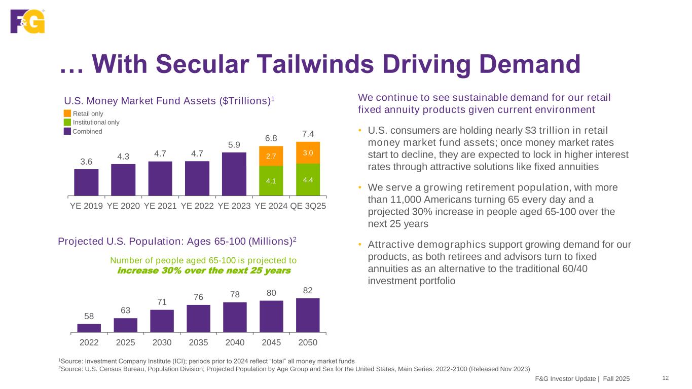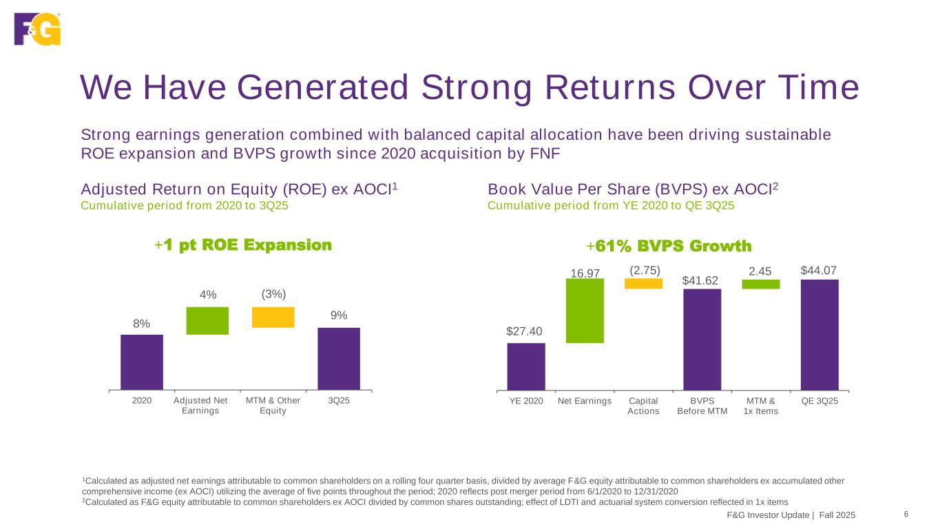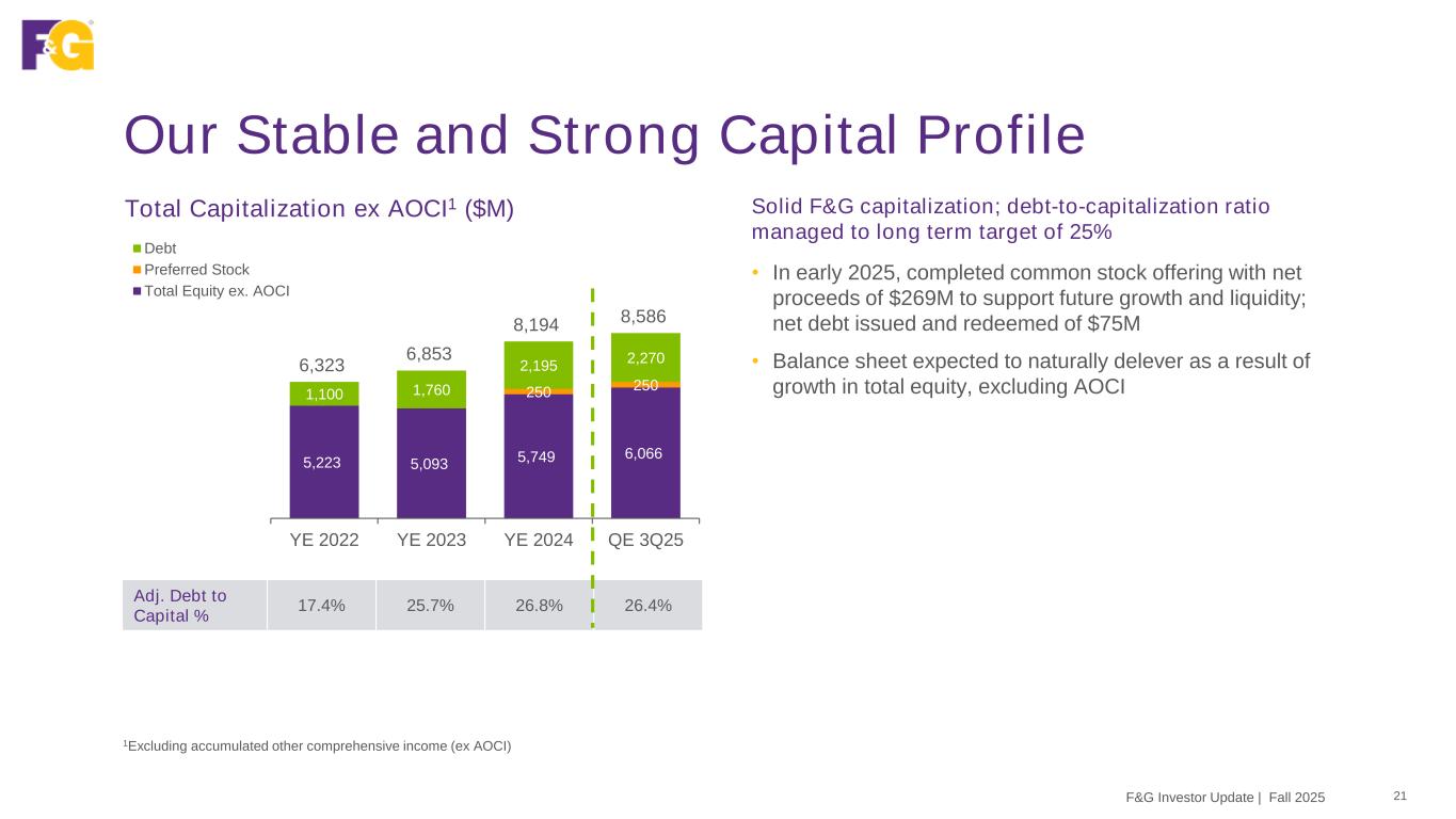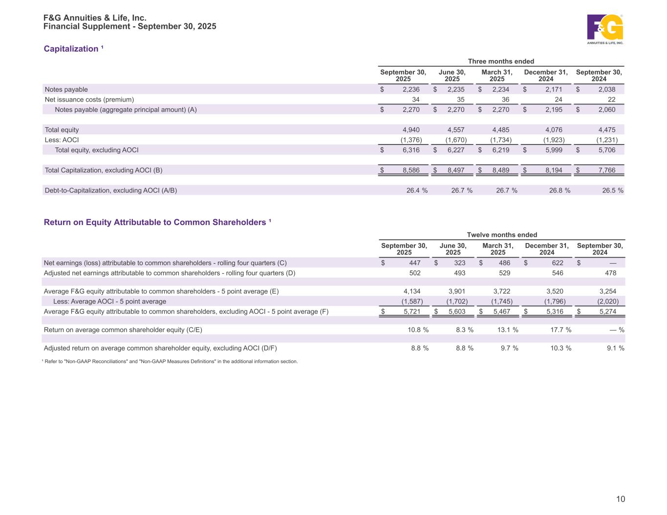 Capitalization ¹ Three months ended September 30, 2025 June 30, 2025 March 31, 2025 December 31, 2024 September 30, 2024 Notes payable $ 2,236 $ 2,235 $ 2,234 $ 2,171 $ 2,038 Net issuance costs (premium) 34 35 36 24 22 Notes payable (aggregate principal amount) (A) $ 2,270 $ 2,270 $ 2,270 $ 2,195 $ 2,060 Total equity 4,940 4,557 4,485 4,076 4,475 Less: AOCI (1,376) (1,670) (1,734) (1,923) (1,231) Total equity, excluding AOCI $ 6,316 $ 6,227 $ 6,219 $ 5,999 $ 5,706 Total Capitalization, excluding AOCI (B) $ 8,586 $ 8,497 $ 8,489 $ 8,194 $ 7,766 Debt-to-Capitalization, excluding AOCI (A/B) 26.4 % 26.7 % 26.7 % 26.8 % 26.5 % Return on Equity Attributable to Common Shareholders ¹ Twelve months ended September 30, 2025 June 30, 2025 March 31, 2025 December 31, 2024 September 30, 2024 Net earnings (loss) attributable to common shareholders - rolling four quarters (C) $ 447 $ 323 $ 486 $ 622 $ — Adjusted net earnings attributable to common shareholders - rolling four quarters (D) 502 493 529 546 478 Average F&G equity attributable to common shareholders - 5 point average (E) 4,134 3,901 3,722 3,520 3,254 Less: Average AOCI - 5 point average (1,587) (1,702) (1,745) (1,796) (2,020) Average F&G equity attributable to common shareholders, excluding AOCI - 5 point average (F) $ 5,721 $ 5,603 $ 5,467 $ 5,316 $ 5,274 Return on average common shareholder equity (C/E) 10.8 % 8.3 % 13.1 % 17.7 % — % Adjusted return on average common shareholder equity, excluding AOCI (D/F) 8.8 % 8.8 % 9.7 % 10.3 % 9.1 % ¹ Refer to "Non-GAAP Reconciliations" and "Non-GAAP Measures Definitions" in the additional information section. F&G Annuities & Life, Inc. Financial Supplement - September 30, 2025 10