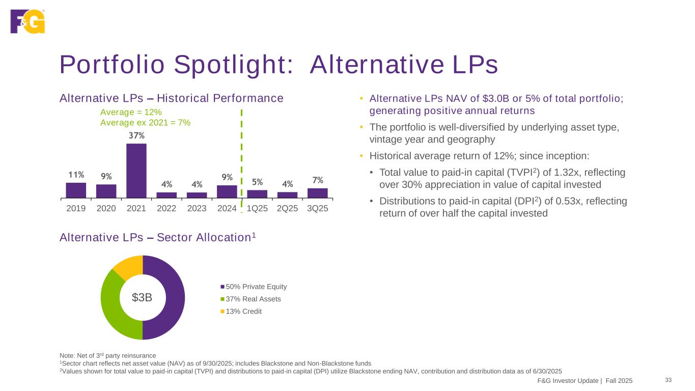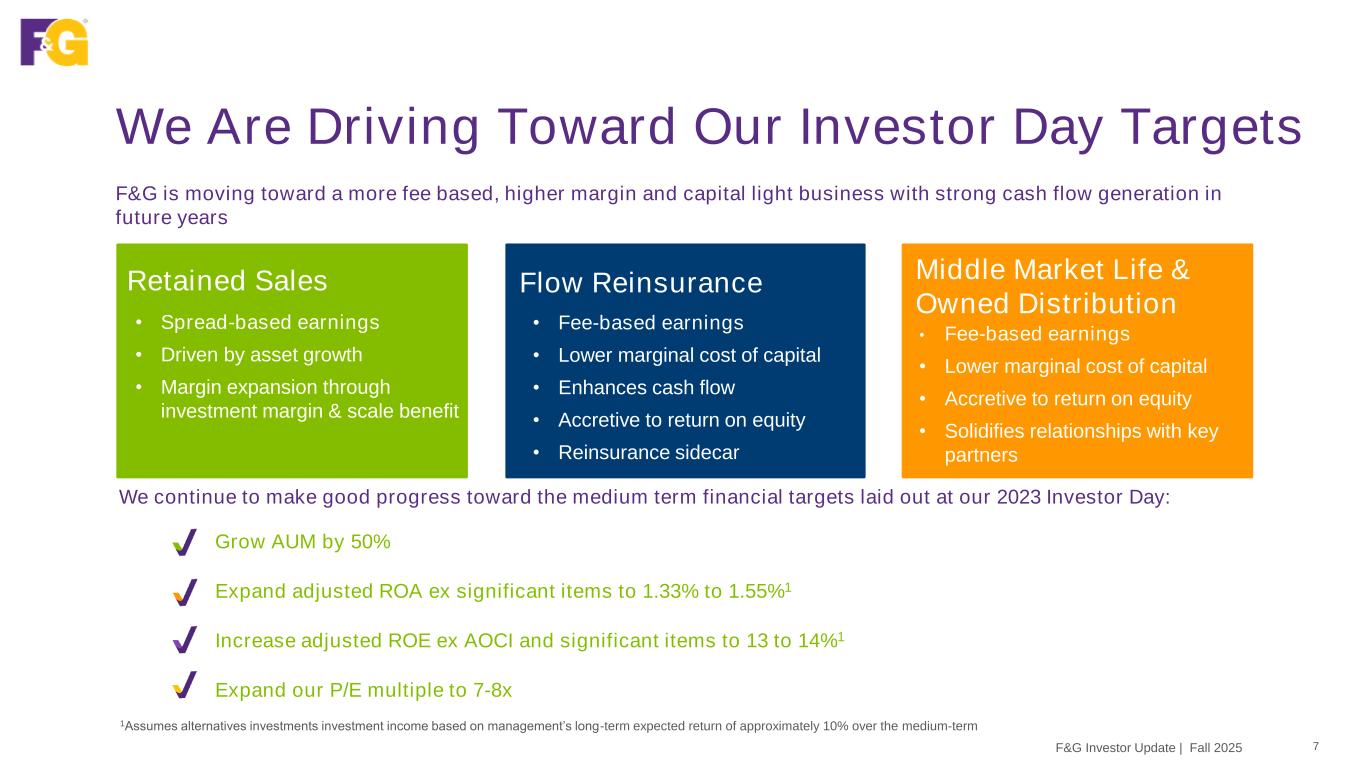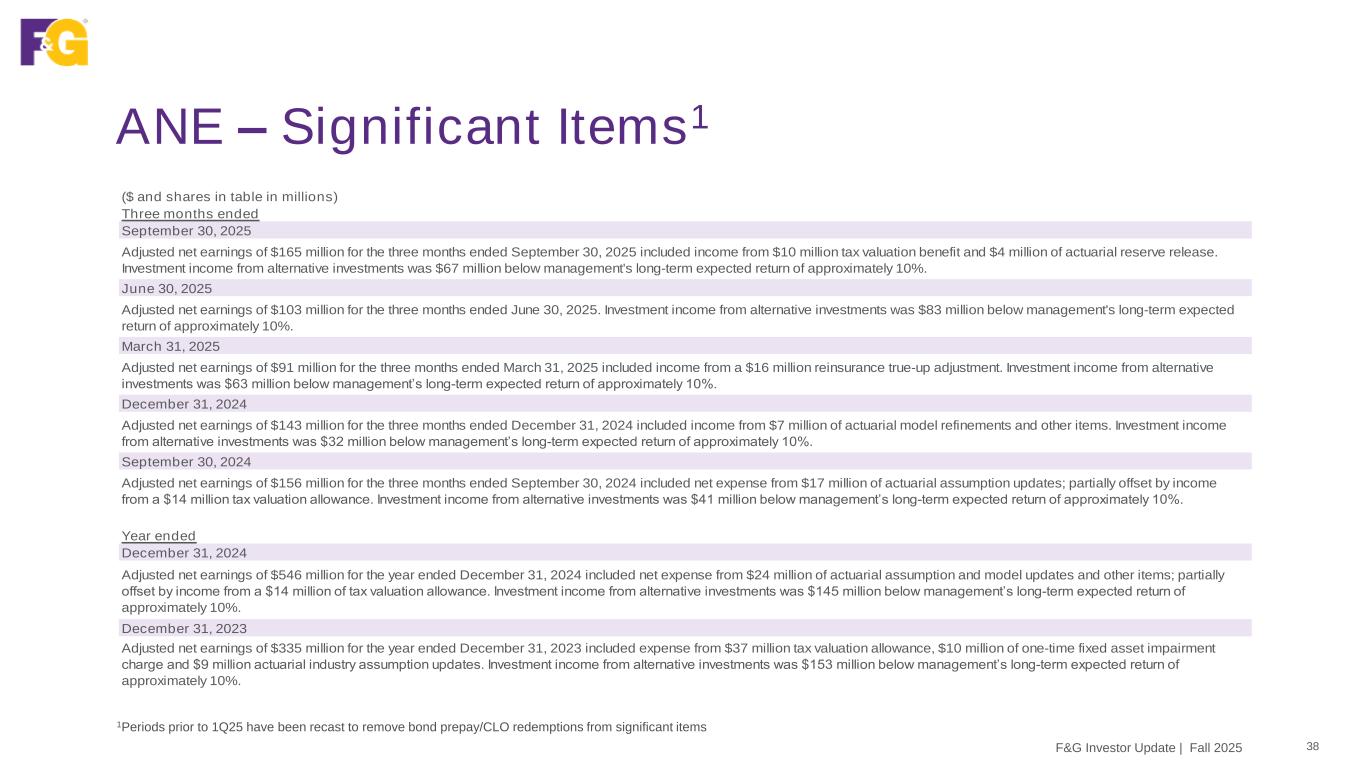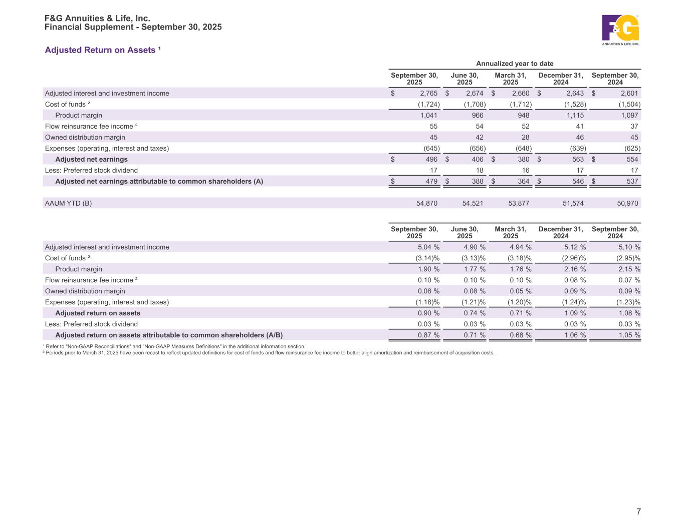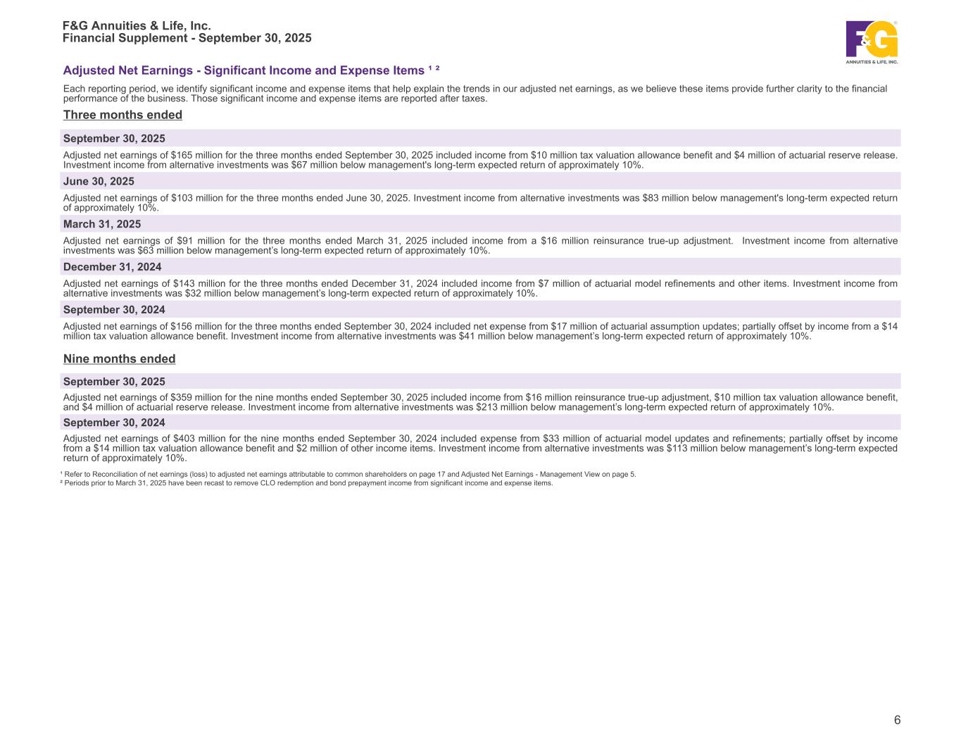 Adjusted Net Earnings - Significant Income and Expense Items ¹ ² Each reporting period, we identify significant income and expense items that help explain the trends in our adjusted net earnings, as we believe these items provide further clarity to the financial performance of the business. Those significant income and expense items are reported after taxes. Three months ended September 30, 2025 Adjusted net earnings of $165 million for the three months ended September 30, 2025 included income from $10 million tax valuation allowance benefit and $4 million of actuarial reserve release. Investment income from alternative investments was $67 million below management's long-term expected return of approximately 10%. June 30, 2025 Adjusted net earnings of $103 million for the three months ended June 30, 2025. Investment income from alternative investments was $83 million below management's long-term expected return of approximately 10%. March 31, 2025 Adjusted net earnings of $91 million for the three months ended March 31, 2025 included income from a $16 million reinsurance true-up adjustment. Investment income from alternative investments was $63 million below management’s long-term expected return of approximately 10%. December 31, 2024 Adjusted net earnings of $143 million for the three months ended December 31, 2024 included income from $7 million of actuarial model refinements and other items. Investment income from alternative investments was $32 million below management’s long-term expected return of approximately 10%. September 30, 2024 Adjusted net earnings of $156 million for the three months ended September 30, 2024 included net expense from $17 million of actuarial assumption updates; partially offset by income from a $14 million tax valuation allowance benefit. Investment income from alternative investments was $41 million below management’s long-term expected return of approximately 10%. Nine months ended September 30, 2025 Adjusted net earnings of $359 million for the nine months ended September 30, 2025 included income from $16 million reinsurance true-up adjustment, $10 million tax valuation allowance benefit, and $4 million of actuarial reserve release. Investment income from alternative investments was $213 million below management’s long-term expected return of approximately 10%. September 30, 2024 Adjusted net earnings of $403 million for the nine months ended September 30, 2024 included expense from $33 million of actuarial model updates and refinements; partially offset by income from a $14 million tax valuation allowance benefit and $2 million of other income items. Investment income from alternative investments was $113 million below management’s long-term expected return of approximately 10%. ¹ Refer to Reconciliation of net earnings (loss) to adjusted net earnings attributable to common shareholders on page 17 and Adjusted Net Earnings - Management View on page 5. ² Periods prior to March 31, 2025 have been recast to remove CLO redemption and bond prepayment income from significant income and expense items. F&G Annuities & Life, Inc. Financial Supplement - September 30, 2025 6