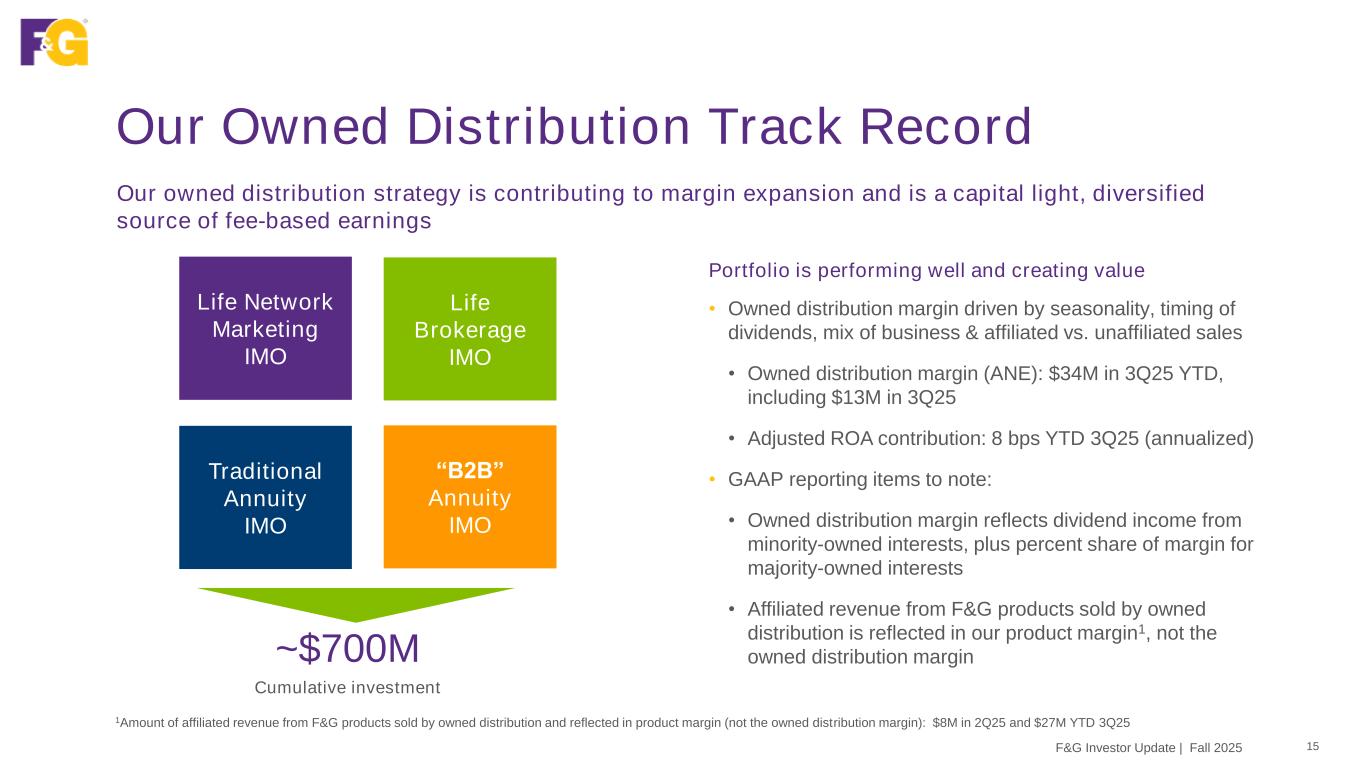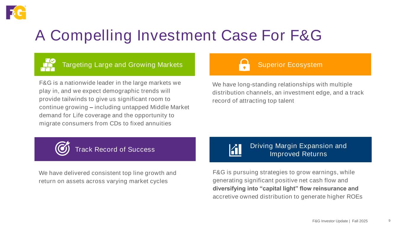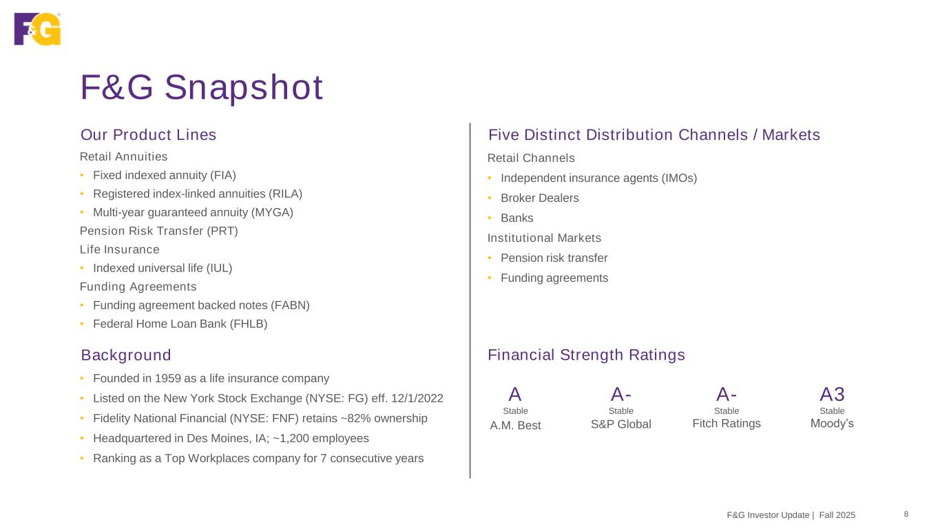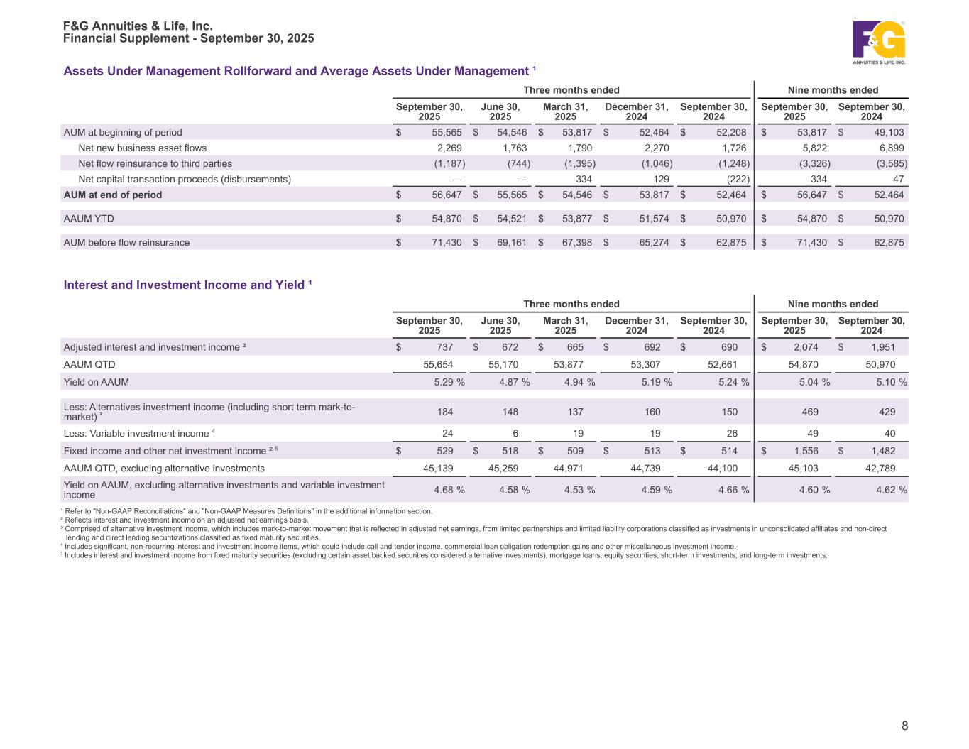 Adjusted Return on Assets ¹ Annualized year to date September 30, 2025 June 30, 2025 March 31, 2025 December 31, 2024 September 30, 2024 Adjusted interest and investment income $ 2,765 $ 2,674 $ 2,660 $ 2,643 $ 2,601 Cost of funds ² (1,724) (1,708) (1,712) (1,528) (1,504) Product margin 1,041 966 948 1,115 1,097 Flow reinsurance fee income ² 55 54 52 41 37 Owned distribution margin 45 42 28 46 45 Expenses (operating, interest and taxes) (645) (656) (648) (639) (625) Adjusted net earnings $ 496 $ 406 $ 380 $ 563 $ 554 Less: Preferred stock dividend 17 18 16 17 17 Adjusted net earnings attributable to common shareholders (A) $ 479 $ 388 $ 364 $ 546 $ 537 AAUM YTD (B) 54,870 54,521 53,877 51,574 50,970 September 30, 2025 June 30, 2025 March 31, 2025 December 31, 2024 September 30, 2024 Adjusted interest and investment income 5.04 % 4.90 % 4.94 % 5.12 % 5.10 % Cost of funds ² (3.14) % (3.13) % (3.18) % (2.96) % (2.95) % Product margin 1.90 % 1.77 % 1.76 % 2.16 % 2.15 % Flow reinsurance fee income ² 0.10 % 0.10 % 0.10 % 0.08 % 0.07 % Owned distribution margin 0.08 % 0.08 % 0.05 % 0.09 % 0.09 % Expenses (operating, interest and taxes) (1.18) % (1.21) % (1.20) % (1.24) % (1.23) % Adjusted return on assets 0.90 % 0.74 % 0.71 % 1.09 % 1.08 % Less: Preferred stock dividend 0.03 % 0.03 % 0.03 % 0.03 % 0.03 % Adjusted return on assets attributable to common shareholders (A/B) 0.87 % 0.71 % 0.68 % 1.06 % 1.05 % ¹ Refer to "Non-GAAP Reconciliations" and "Non-GAAP Measures Definitions" in the additional information section. ² Periods prior to March 31, 2025 have been recast to reflect updated definitions for cost of funds and flow reinsurance fee income to better align amortization and reimbursement of acquisition costs. F&G Annuities & Life, Inc. Financial Supplement - September 30, 2025 7
