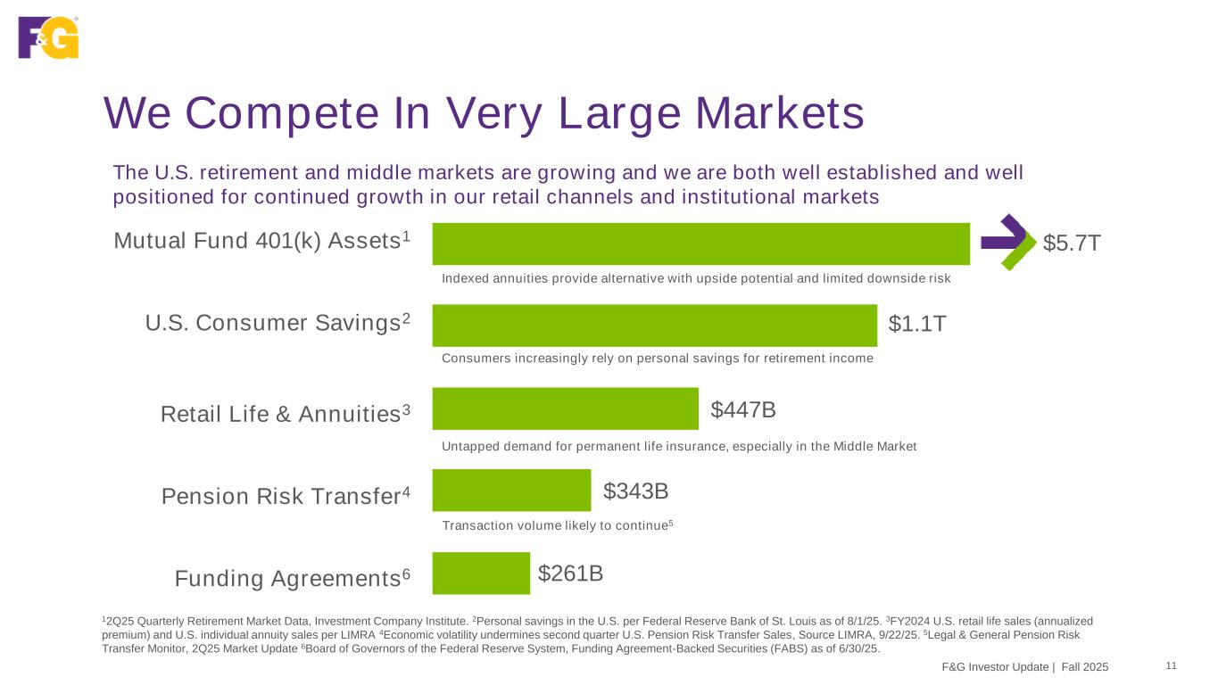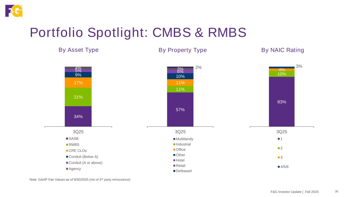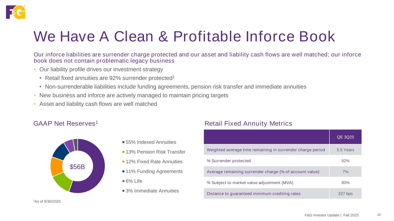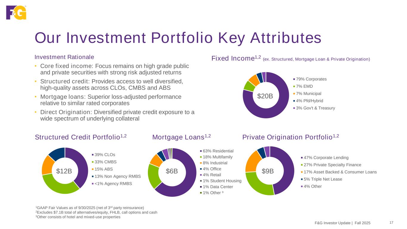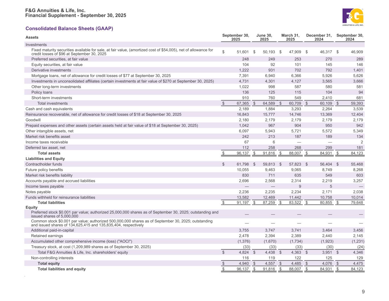 Consolidated Balance Sheets (GAAP) Assets September 30, 2025 June 30, 2025 March 31, 2025 December 31, 2024 September 30, 2024 Investments Fixed maturity securities available for sale, at fair value, (amortized cost of $54,005), net of allowance for credit losses of $96 at September 30, 2025 $ 51,601 $ 50,193 $ 47,909 $ 46,317 $ 46,909 Preferred securities, at fair value 248 249 253 270 289 Equity securities, at fair value 104 92 101 145 146 Derivative investments 1,222 931 702 792 1,401 Mortgage loans, net of allowance for credit losses of $77 at September 30, 2025 7,391 6,940 6,366 5,926 5,626 Investments in unconsolidated affiliates (certain investments at fair value of $270 at September 30, 2025) 4,731 4,301 4,127 3,565 3,666 Other long-term investments 1,022 998 587 580 581 Policy loans 136 125 115 104 94 Short-term investments 910 760 549 2,410 681 Total investments $ 67,365 $ 64,589 $ 60,709 $ 60,109 $ 59,393 Cash and cash equivalents 2,189 1,884 3,293 2,264 3,539 Reinsurance recoverable, net of allowance for credit losses of $18 at September 30, 2025 16,843 15,777 14,746 13,369 12,404 Goodwill 2,180 2,179 2,179 2,179 2,179 Prepaid expenses and other assets (certain assets held at fair value of $18 at September 30, 2025) 1,042 967 904 950 942 Other intangible assets, net 6,097 5,943 5,721 5,572 5,349 Market risk benefits asset 242 213 187 189 134 Income taxes receivable 67 6 — — 2 Deferred tax asset, net 112 258 268 299 181 Total assets $ 96,137 $ 91,816 $ 88,007 $ 84,931 $ 84,123 Liabilities and Equity Contractholder funds $ 61,798 $ 59,813 $ 57,823 $ 56,404 $ 55,468 Future policy benefits 10,055 9,463 9,065 8,749 8,268 Market risk benefits liability 830 711 635 549 603 Accounts payable and accrued liabilities 2,696 2,568 2,314 2,219 3,257 Income taxes payable — — 9 5 — Notes payable 2,236 2,235 2,234 2,171 2,038 Funds withheld for reinsurance liabilities 13,582 12,469 11,442 10,758 10,014 Total liabilities $ 91,197 $ 87,259 $ 83,522 $ 80,855 $ 79,648 Equity Preferred stock $0.001 par value; authorized 25,000,000 shares as of September 30, 2025; outstanding and issued shares of 5,000,000 — — — — — Common stock $0.001 par value; authorized 500,000,000 shares as of September 30, 2025; outstanding and issued shares of 134,625,415 and 135,835,404, respectively — — — — — Additional paid-in-capital 3,755 3,747 3,741 3,464 3,456 Retained earnings 2,478 2,394 2,389 2,440 2,145 Accumulated other comprehensive income (loss) ("AOCI") (1,376) (1,670) (1,734) (1,923) (1,231) Treasury stock, at cost (1,209,989 shares as of September 30, 2025) (33) (33) (33) (30) (24) Total F&G Annuities & Life, Inc. shareholders' equity $ 4,824 $ 4,438 $ 4,363 $ 3,951 $ 4,346 Non-controlling interests 116 119 122 125 129 Total equity $ 4,940 $ 4,557 $ 4,485 $ 4,076 $ 4,475 Total liabilities and equity $ 96,137 $ 91,816 $ — $ 88,007 $ 84,931 $ 84,123 . F&G Annuities & Life, Inc. Financial Supplement - September 30, 2025 9