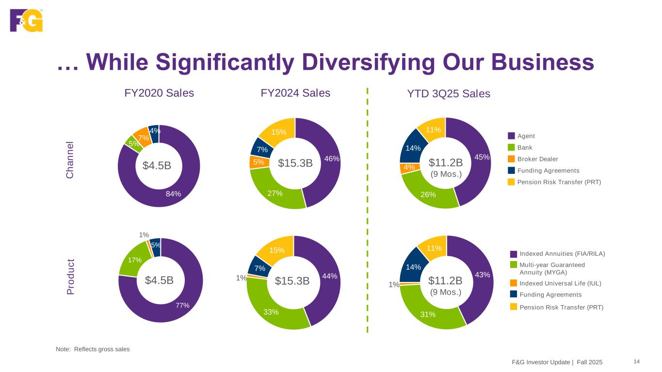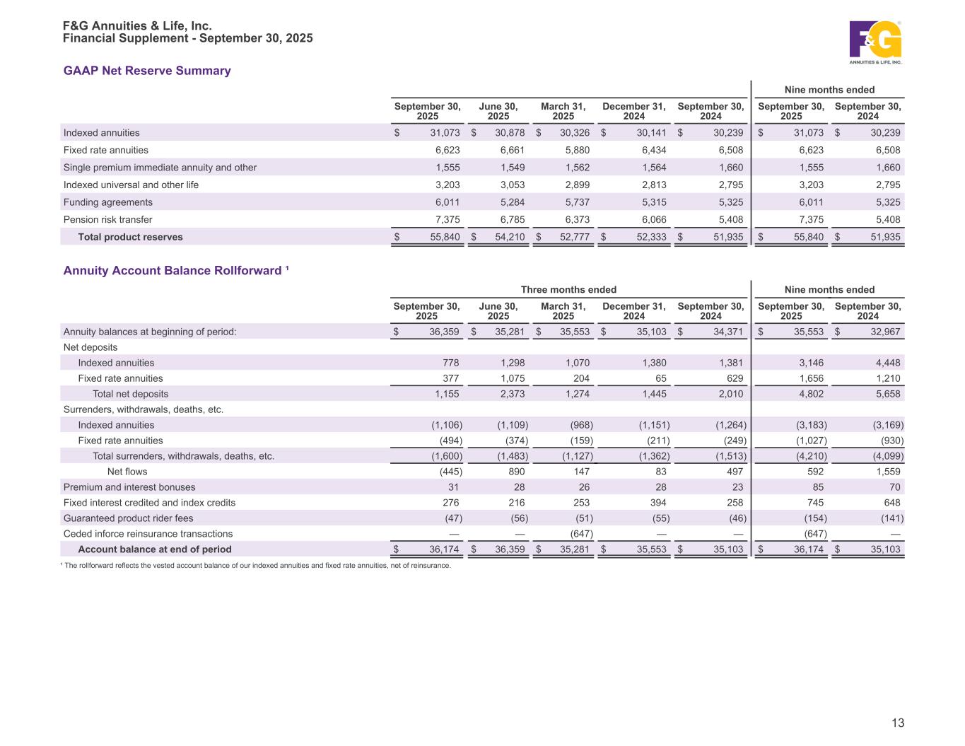 GAAP Net Reserve Summary Nine months ended September 30, 2025 June 30, 2025 March 31, 2025 December 31, 2024 September 30, 2024 September 30, 2025 September 30, 2024 Indexed annuities $ 31,073 $ 30,878 $ 30,326 $ 30,141 $ 30,239 $ 31,073 $ 30,239 Fixed rate annuities 6,623 6,661 5,880 6,434 6,508 6,623 6,508 Single premium immediate annuity and other 1,555 1,549 1,562 1,564 1,660 1,555 1,660 Indexed universal and other life 3,203 3,053 2,899 2,813 2,795 3,203 2,795 Funding agreements 6,011 5,284 5,737 5,315 5,325 6,011 5,325 Pension risk transfer 7,375 6,785 6,373 6,066 5,408 7,375 5,408 Total product reserves $ 55,840 $ 54,210 $ 52,777 $ 52,333 $ 51,935 $ 55,840 $ 51,935 Annuity Account Balance Rollforward ¹ Three months ended Nine months ended September 30, 2025 June 30, 2025 March 31, 2025 December 31, 2024 September 30, 2024 September 30, 2025 September 30, 2024 Annuity balances at beginning of period: $ 36,359 $ 35,281 $ 35,553 $ 35,103 $ 34,371 $ 35,553 $ 32,967 Net deposits Indexed annuities 778 1,298 1,070 1,380 1,381 3,146 4,448 Fixed rate annuities 377 1,075 204 65 629 1,656 1,210 Total net deposits 1,155 2,373 1,274 1,445 2,010 4,802 5,658 Surrenders, withdrawals, deaths, etc. Indexed annuities (1,106) (1,109) (968) (1,151) (1,264) (3,183) (3,169) Fixed rate annuities (494) (374) (159) (211) (249) (1,027) (930) Total surrenders, withdrawals, deaths, etc. (1,600) (1,483) (1,127) (1,362) (1,513) (4,210) (4,099) Net flows (445) 890 147 83 497 592 1,559 Premium and interest bonuses 31 28 26 28 23 85 70 Fixed interest credited and index credits 276 216 253 394 258 745 648 Guaranteed product rider fees (47) (56) (51) (55) (46) (154) (141) Ceded inforce reinsurance transactions — — (647) — — (647) — Account balance at end of period $ 36,174 $ 36,359 $ 35,281 $ 35,553 $ 35,103 $ 36,174 $ 35,103 ¹ The rollforward reflects the vested account balance of our indexed annuities and fixed rate annuities, net of reinsurance. F&G Annuities & Life, Inc. Financial Supplement - September 30, 2025 13