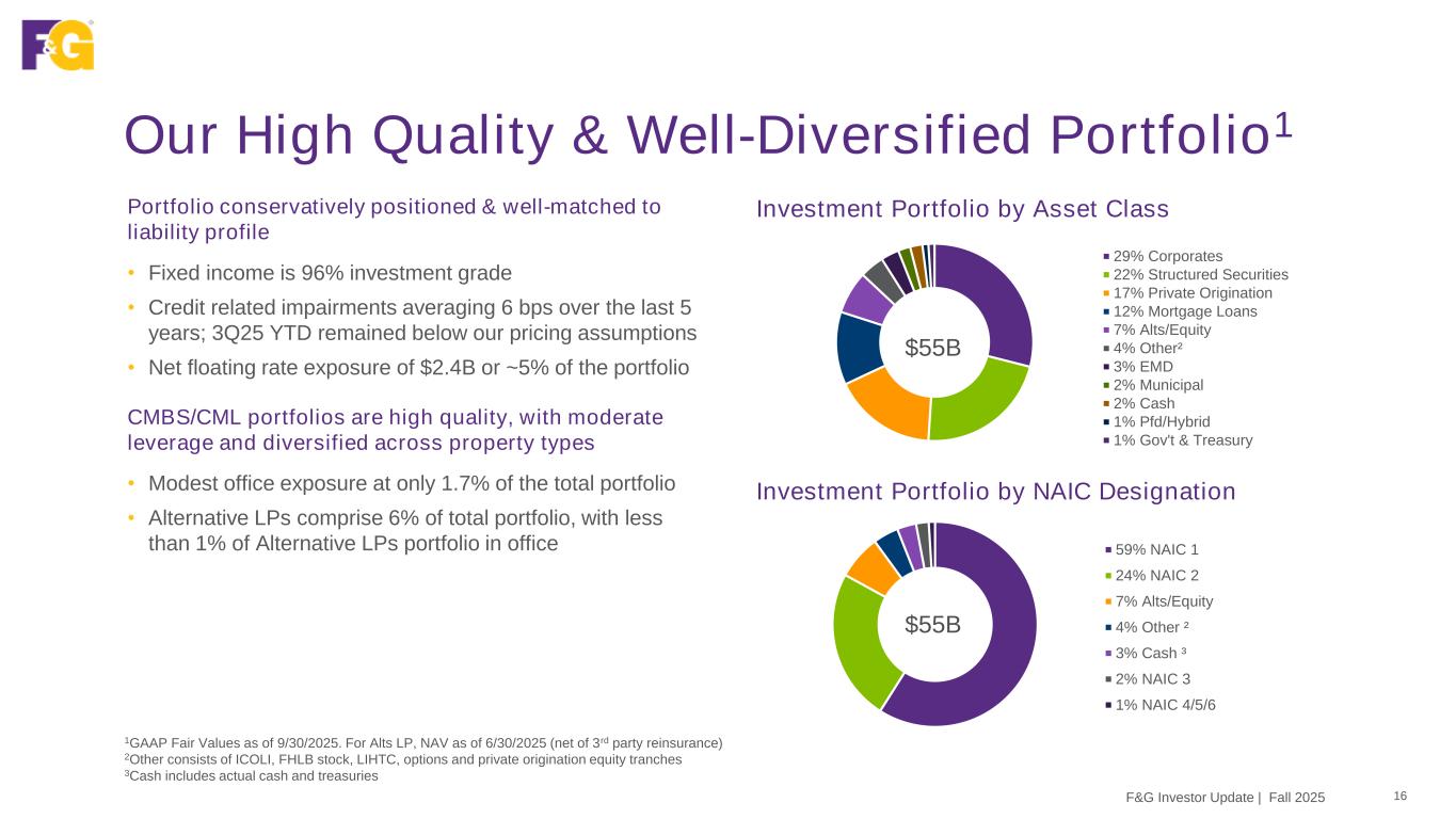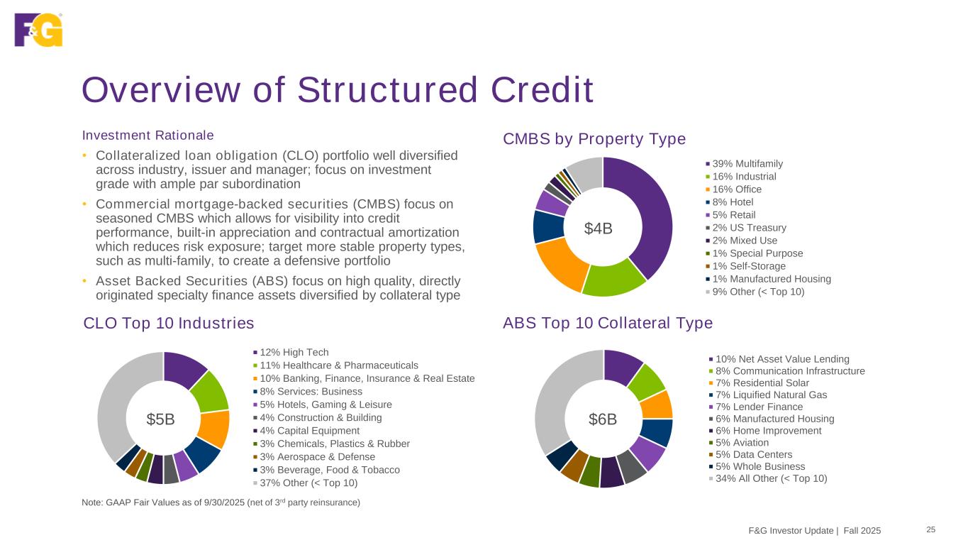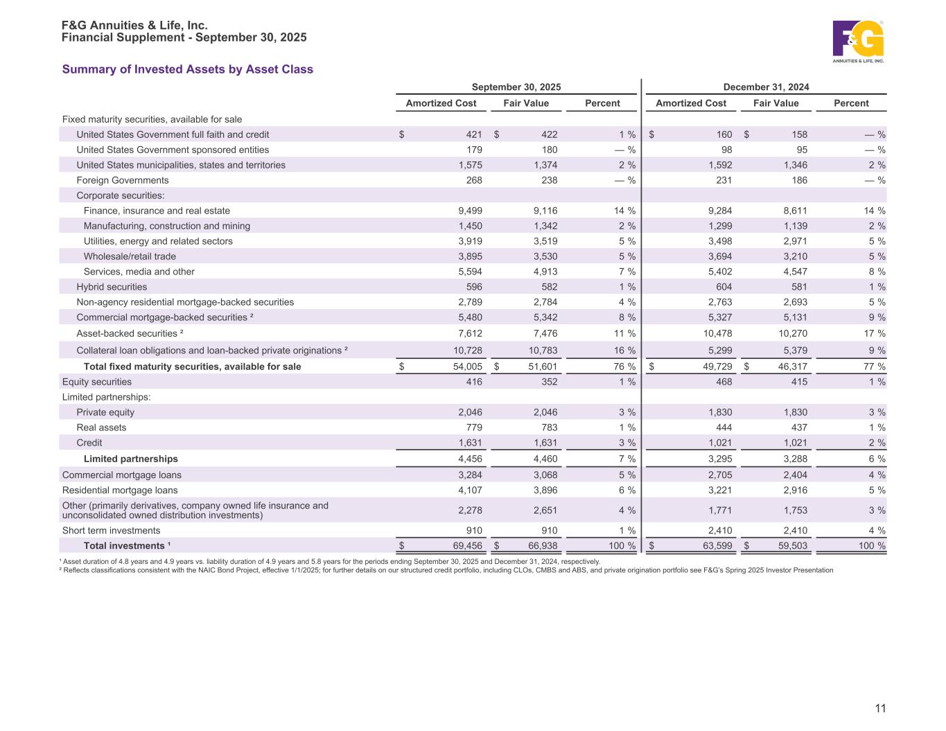 Summary of Invested Assets by Asset Class September 30, 2025 December 31, 2024 Amortized Cost Fair Value Percent Amortized Cost Fair Value Percent Fixed maturity securities, available for sale United States Government full faith and credit $ 421 $ 422 1 % $ 160 $ 158 — % United States Government sponsored entities 179 180 — % 98 95 — % United States municipalities, states and territories 1,575 1,374 2 % 1,592 1,346 2 % Foreign Governments 268 238 — % 231 186 — % Corporate securities: Finance, insurance and real estate 9,499 9,116 14 % 9,284 8,611 14 % Manufacturing, construction and mining 1,450 1,342 2 % 1,299 1,139 2 % Utilities, energy and related sectors 3,919 3,519 5 % 3,498 2,971 5 % Wholesale/retail trade 3,895 3,530 5 % 3,694 3,210 5 % Services, media and other 5,594 4,913 7 % 5,402 4,547 8 % Hybrid securities 596 582 1 % 604 581 1 % Non-agency residential mortgage-backed securities 2,789 2,784 4 % 2,763 2,693 5 % Commercial mortgage-backed securities ² 5,480 5,342 8 % 5,327 5,131 9 % Asset-backed securities ² 7,612 7,476 11 % 10,478 10,270 17 % Collateral loan obligations and loan-backed private originations ² 10,728 10,783 16 % 5,299 5,379 9 % Total fixed maturity securities, available for sale $ 54,005 $ 51,601 76 % $ 49,729 $ 46,317 77 % Equity securities 416 352 1 % 468 415 1 % Limited partnerships: Private equity 2,046 2,046 3 % 1,830 1,830 3 % Real assets 779 783 1 % 444 437 1 % Credit 1,631 1,631 3 % 1,021 1,021 2 % Limited partnerships 4,456 4,460 7 % 3,295 3,288 6 % Commercial mortgage loans 3,284 3,068 5 % 2,705 2,404 4 % Residential mortgage loans 4,107 3,896 6 % 3,221 2,916 5 % Other (primarily derivatives, company owned life insurance and unconsolidated owned distribution investments) 2,278 2,651 4 % 1,771 1,753 3 % Short term investments 910 910 1 % 2,410 2,410 4 % Total investments ¹ $ 69,456 $ 66,938 100 % $ 63,599 $ 59,503 100 % ¹ Asset duration of 4.8 years and 4.9 years vs. liability duration of 4.9 years and 5.8 years for the periods ending September 30, 2025 and December 31, 2024, respectively. ² Reflects classifications consistent with the NAIC Bond Project, effective 1/1/2025; for further details on our structured credit portfolio, including CLOs, CMBS and ABS, and private origination portfolio see F&G’s Spring 2025 Investor Presentation F&G Annuities & Life, Inc. Financial Supplement - September 30, 2025 11