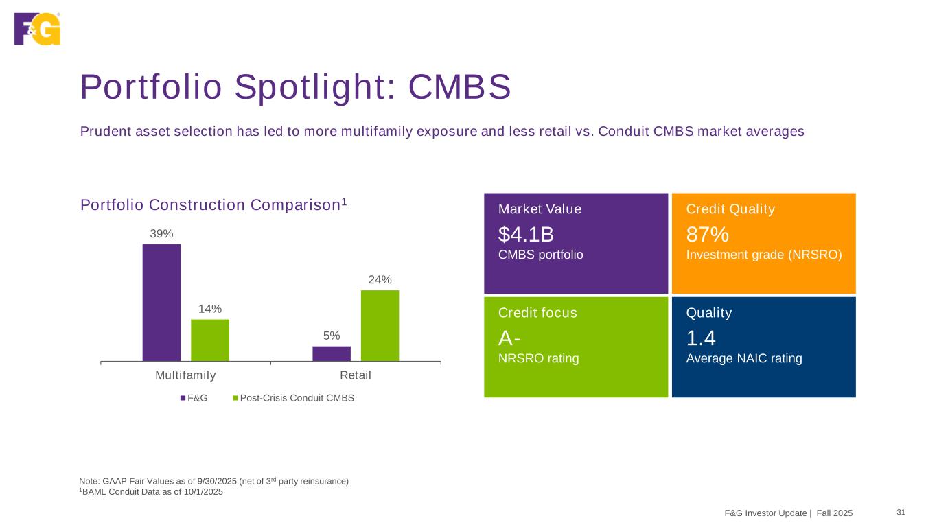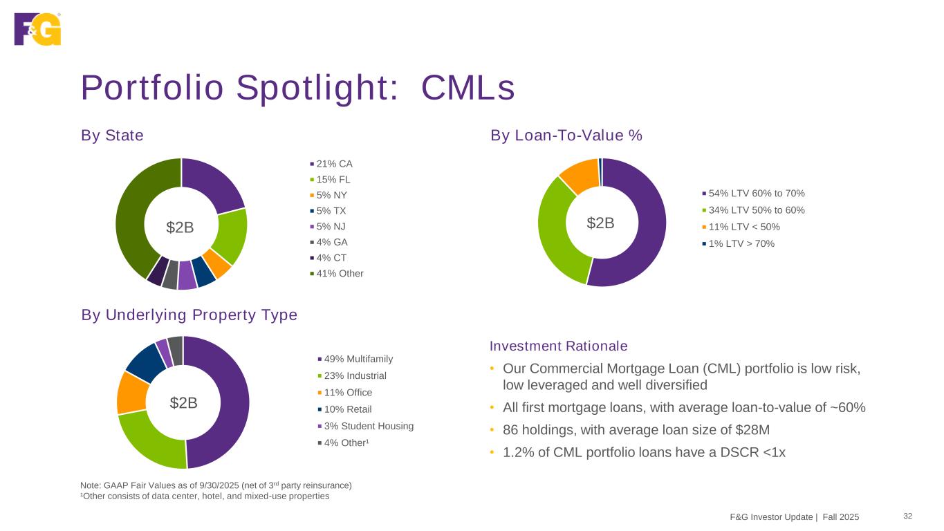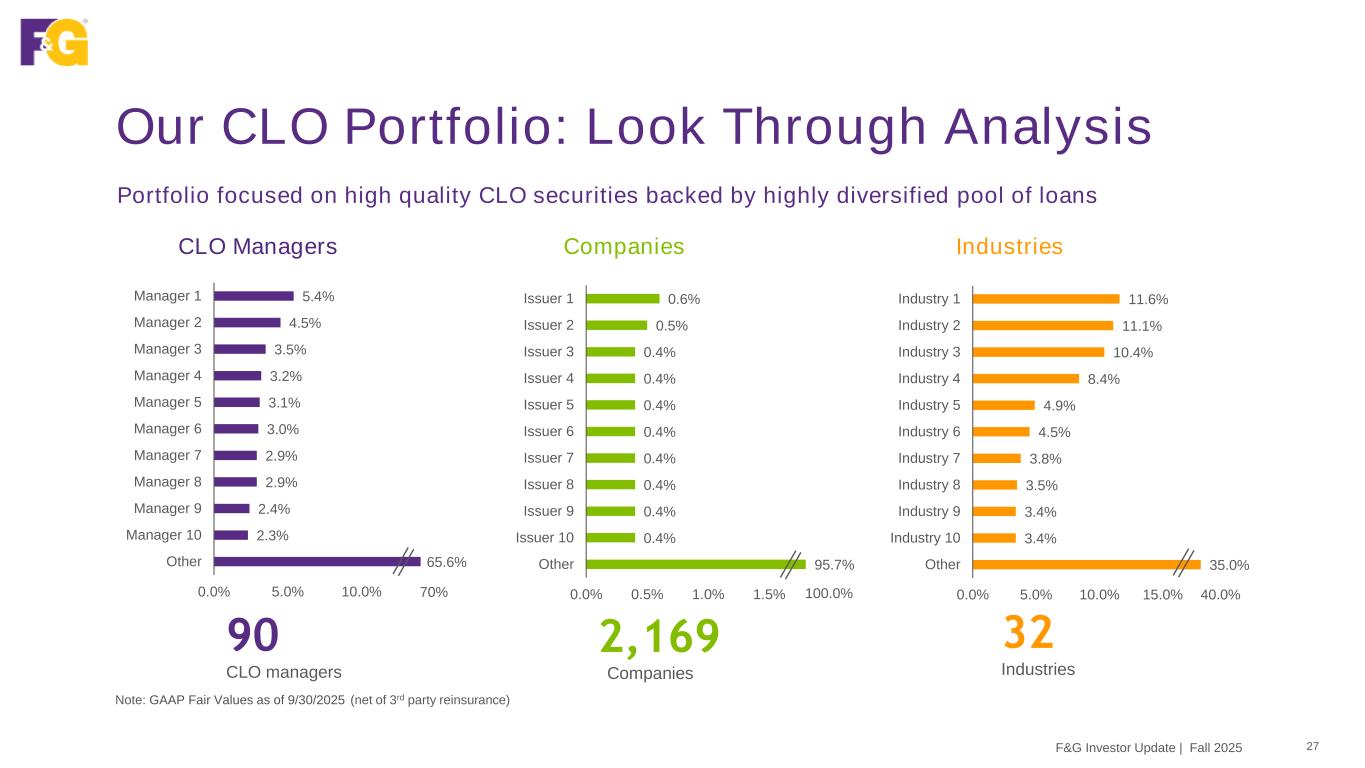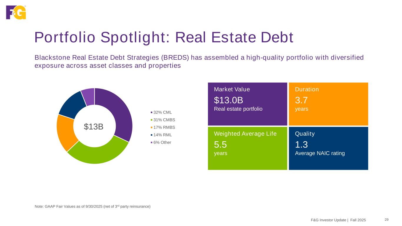 Summary of Invested Assets by Asset Class September 30, 2025 December 31, 2024 Amortized Cost Fair Value Percent Amortized Cost Fair Value Percent Fixed maturity securities, available for sale United States Government full faith and credit $ 421 $ 422 1 % $ 160 $ 158 — % United States Government sponsored entities 179 180 — % 98 95 — % United States municipalities, states and territories 1,575 1,374 2 % 1,592 1,346 2 % Foreign Governments 268 238 — % 231 186 — % Corporate securities: Finance, insurance and real estate 9,499 9,116 14 % 9,284 8,611 14 % Manufacturing, construction and mining 1,450 1,342 2 % 1,299 1,139 2 % Utilities, energy and related sectors 3,919 3,519 5 % 3,498 2,971 5 % Wholesale/retail trade 3,895 3,530 5 % 3,694 3,210 5 % Services, media and other 5,594 4,913 7 % 5,402 4,547 8 % Hybrid securities 596 582 1 % 604 581 1 % Non-agency residential mortgage-backed securities 2,789 2,784 4 % 2,763 2,693 5 % Commercial mortgage-backed securities ² 5,480 5,342 8 % 5,327 5,131 9 % Asset-backed securities ² 7,612 7,476 11 % 10,478 10,270 17 % Collateral loan obligations and loan-backed private originations ² 10,728 10,783 16 % 5,299 5,379 9 % Total fixed maturity securities, available for sale $ 54,005 $ 51,601 76 % $ 49,729 $ 46,317 77 % Equity securities 416 352 1 % 468 415 1 % Limited partnerships: Private equity 2,046 2,046 3 % 1,830 1,830 3 % Real assets 779 783 1 % 444 437 1 % Credit 1,631 1,631 3 % 1,021 1,021 2 % Limited partnerships 4,456 4,460 7 % 3,295 3,288 6 % Commercial mortgage loans 3,284 3,068 5 % 2,705 2,404 4 % Residential mortgage loans 4,107 3,896 6 % 3,221 2,916 5 % Other (primarily derivatives, company owned life insurance and unconsolidated owned distribution investments) 2,278 2,651 4 % 1,771 1,753 3 % Short term investments 910 910 1 % 2,410 2,410 4 % Total investments ¹ $ 69,456 $ 66,938 100 % $ 63,599 $ 59,503 100 % ¹ Asset duration of 4.8 years and 4.9 years vs. liability duration of 4.9 years and 5.8 years for the periods ending September 30, 2025 and December 31, 2024, respectively. ² Reflects classifications consistent with the NAIC Bond Project, effective 1/1/2025; for further details on our structured credit portfolio, including CLOs, CMBS and ABS, and private origination portfolio see F&G’s Spring 2025 Investor Presentation F&G Annuities & Life, Inc. Financial Supplement - September 30, 2025 11