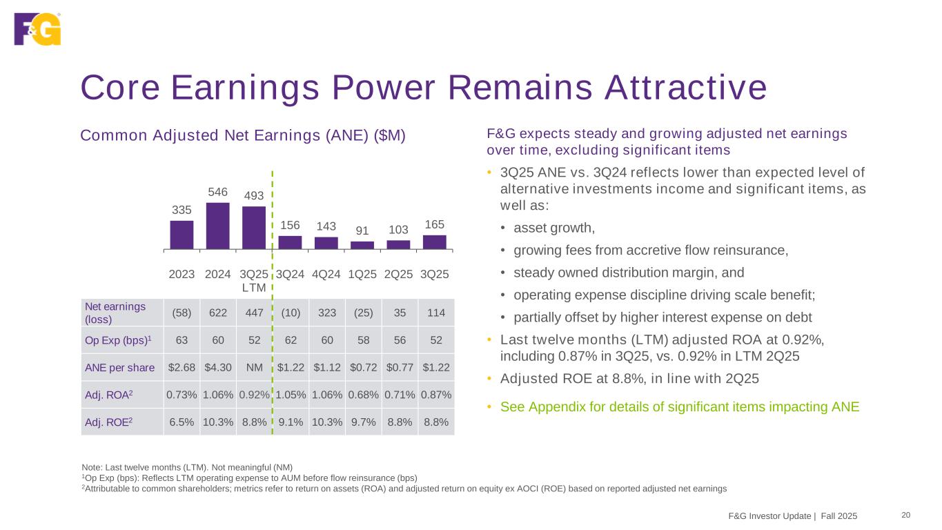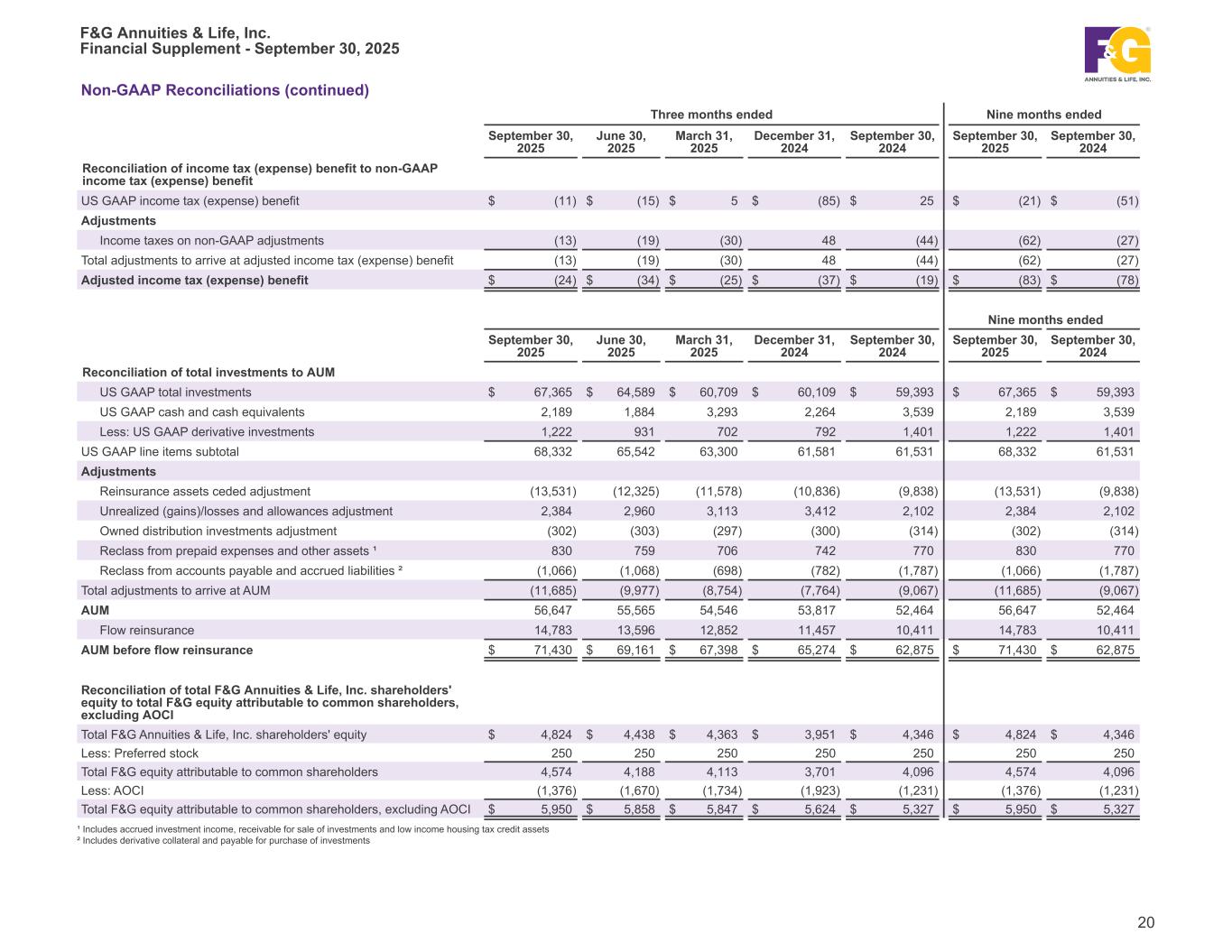 Non-GAAP Reconciliations (continued) Three months ended Nine months ended September 30, 2025 June 30, 2025 March 31, 2025 December 31, 2024 September 30, 2024 September 30, 2025 September 30, 2024 Reconciliation of owned distribution revenues to owned distribution margin US GAAP owned distribution revenues $ 24 $ 23 $ 16 $ 20 $ 20 $ 63 $ 61 US GAAP non-controlling interest (2) (2) — — (1) (4) (3) US GAAP line items subtotal 22 21 16 20 19 59 58 Adjustments Non-controlling interest (2) (2) (2) (2) (3) (6) (8) Reclass of owned distribution dividend income from interest and investment income 3 5 2 5 6 10 12 Reclass of owned distribution expenses from operating expenses (10) (10) (9) (11) (10) (29) (28) Total adjustments to arrive at owned distribution margin (9) (7) (9) (8) (7) (25) (24) Owned distribution margin $ 13 $ 14 $ 7 $ 12 $ 12 $ 34 $ 34 Reconciliation of operating expenses US GAAP personnel costs $ (79) $ (77) $ (67) $ (81) $ (80) $ (223) $ (215) US GAAP other operating expenses (38) (42) (41) (54) (45) (121) (149) US GAAP line items subtotal (117) (119) (108) (135) (125) (344) (364) Adjustments Recognized (gains) losses, net 6 2 (5) 1 1 3 6 Purchase price amortization 5 3 1 5 7 9 21 Transaction costs, other and non-recurring items 6 8 2 19 — 16 — Reclass of acquisition expenses to cost of funds — 5 5 4 4 10 15 Reclass of expenses to owned distribution margin 10 10 9 11 10 29 28 Total adjustments to arrive at operating expenses 27 28 12 40 22 67 70 Operating expenses $ (90) $ (91) $ (96) $ (95) $ (103) $ (277) $ (294) Reconciliation of interest expense US GAAP interest expense $ (42) $ (41) $ (40) $ (38) $ (36) $ (123) $ (94) US GAAP line items subtotal (42) (41) (40) (38) (36) (123) (94) Adjustments Transaction costs, other and non-recurring items — — (1) — — (1) (3) Total adjustments to arrive at interest expense — — (1) — — (1) (3) Interest expense $ (42) $ (41) $ (41) $ (38) $ (36) $ (124) $ (97) F&G Annuities & Life, Inc. Financial Supplement - September 30, 2025 19