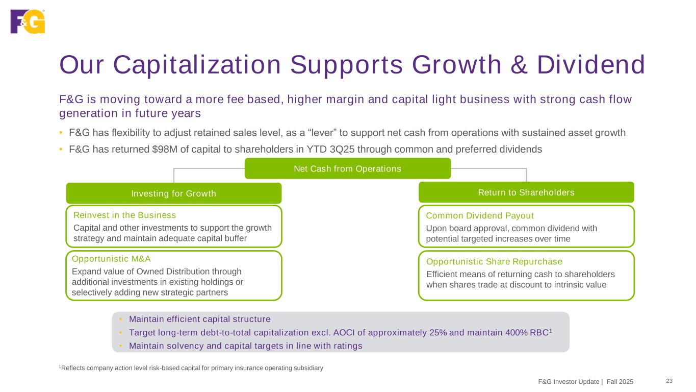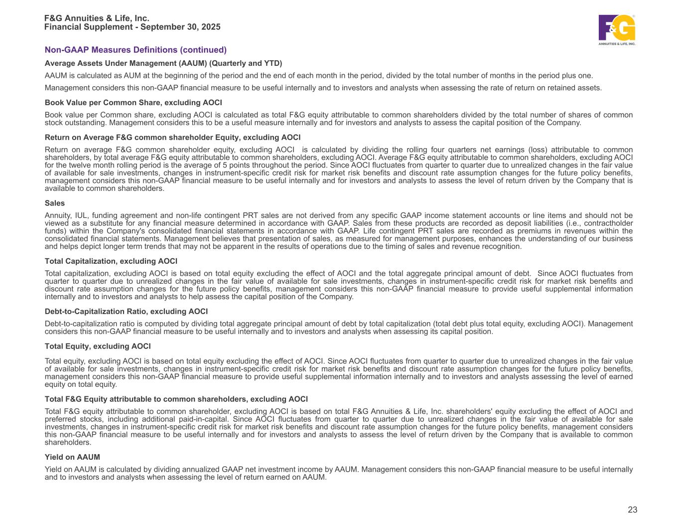 Non-GAAP Measures Definitions (continued) Adjusted Weighted Average Diluted Shares Outstanding Adjusted weighted average diluted shares outstanding is the same as weighted average diluted shares outstanding except for periods in which our preferred stocks are calculated to be dilutive to either net earnings attributable to common shareholders or adjusted net earnings attributable to common shareholders, but not both, or there is a net earnings loss attributable to common shareholders on a GAAP basis, but positive adjusted net earnings attributable to common shareholders using the non-GAAP measure. The above exceptions are made to include relevant diluted shares when dilution occurs and exclude relevant diluted shares when dilution does not occur for adjusted net earnings attributable to common shareholders. Management considers this non-GAAP financial measure to be useful internally and for investors and analysts to assess the level of return driven by the Company that is available to common shareholders. Adjusted Net Earnings attributable to common shareholders per Diluted Share Adjusted net earnings attributable to common shareholders per diluted share is calculated as adjusted net earnings plus preferred stock dividend (if the preferred stock has created dilution). This sum is then divided by the adjusted weighted-average diluted shares outstanding. Management considers this non-GAAP financial measure to be useful internally and for investors and analysts to assess the level of return driven by the Company that is available to common shareholders. Adjusted Return on Assets attributable to Common Shareholders Adjusted return on assets attributable to common shareholders is calculated by dividing year-to-date annualized adjusted net earnings attributable to common shareholders by year-to-date AAUM. Return on assets is comprised of net investment income, less cost of funds, flow reinsurance fee income, owned distribution margin and less expenses (including operating expenses, interest expense and income taxes) consistent with our adjusted net earnings definition and related adjustments. Cost of funds includes liability costs related to cost of crediting as well as other liability costs. Management considers this non-GAAP financial measure to be useful internally and to investors and analysts when assessing financial performance and profitability earned on AAUM. Adjusted Return on Average Common Shareholder Equity, excluding AOCI Adjusted return on average common shareholder equity is calculated by dividing the rolling four quarters adjusted net earnings attributable to common shareholders, by total average F&G equity attributable to common shareholders, excluding AOCI. Average equity attributable to common shareholders, excluding AOCI for the twelve month rolling period is the average of 5 points throughout the period. Since AOCI fluctuates from quarter to quarter due to unrealized changes in the fair value of available for sale investments, changes in instrument-specific credit risk for market risk benefits and discount rate assumption changes for the future policy benefits, management considers this non-GAAP financial measure to be a useful internally and for investors and analysts to assess the level return driven by the Company's adjusted earnings. Assets Under Management (AUM) AUM is comprised of the following components and is reported net of reinsurance assets ceded in accordance with GAAP: (i) total invested assets at amortized cost, excluding investments in unconsolidated affiliates, owned distribution and derivatives; (ii) investments in unconsolidated affiliates at carrying value; (iii) related party loans and investments; (iv) accrued investment income; (v) the net payable/receivable for the purchase/sale of investments; and (vi) cash and cash equivalents excluding derivative collateral at the end of the period. Management considers this non-GAAP financial measure to be useful internally and to investors and analysts when assessing the size of our investment portfolio that is retained. AUM before Flow Reinsurance AUM before Flow Reinsurance is comprised of AUM plus flow reinsured assets, including certain block reinsured assets that have the characteristics of flow reinsured assets. Management considers this non-GAAP financial measure to be useful internally and to investors and analysts when assessing the size of our investment portfolio including reinsured assets. F&G Annuities & Life, Inc. Financial Supplement - September 30, 2025 22