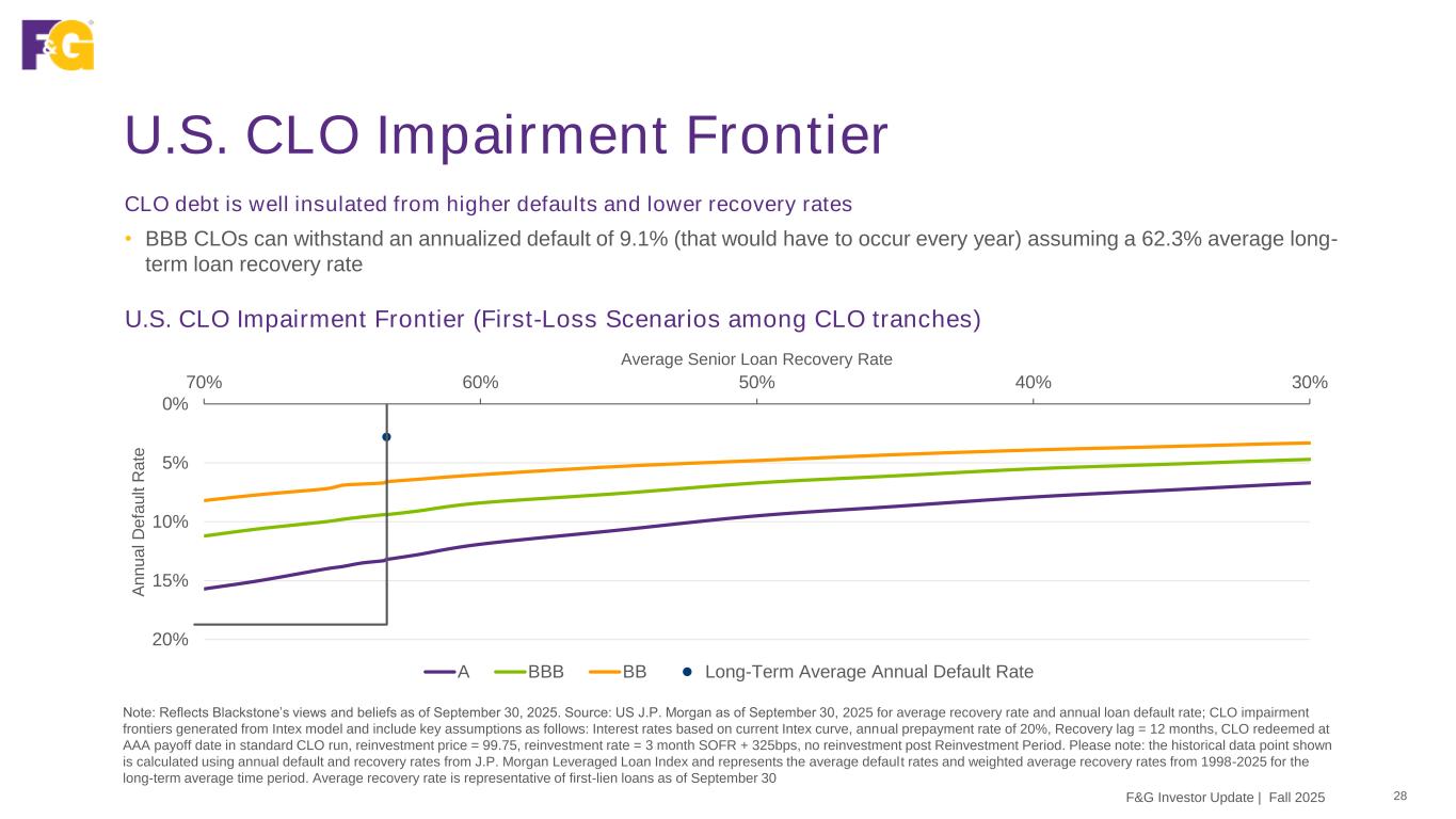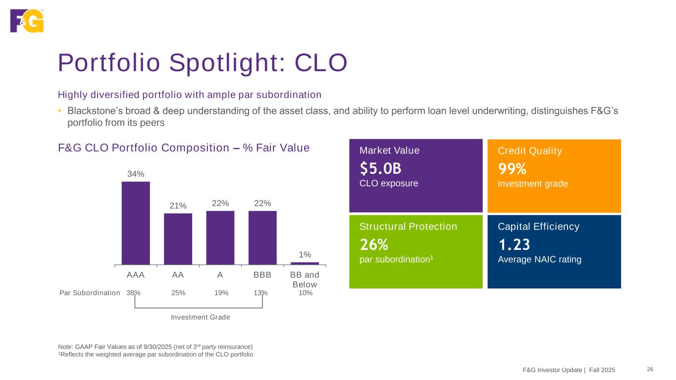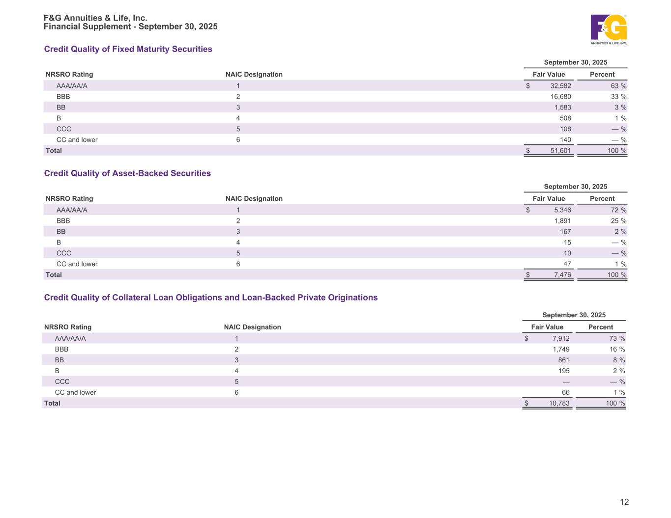 Credit Quality of Fixed Maturity Securities September 30, 2025 NRSRO Rating NAIC Designation Fair Value Percent AAA/AA/A 1 $ 32,582 63 % BBB 2 16,680 33 % BB 3 1,583 3 % B 4 508 1 % CCC 5 108 — % CC and lower 6 140 — % Total $ 51,601 100 % Credit Quality of Asset-Backed Securities September 30, 2025 NRSRO Rating NAIC Designation Fair Value Percent AAA/AA/A 1 $ 5,346 72 % BBB 2 1,891 25 % BB 3 167 2 % B 4 15 — % CCC 5 10 — % CC and lower 6 47 1 % Total $ 7,476 100 % Credit Quality of Collateral Loan Obligations and Loan-Backed Private Originations September 30, 2025 NRSRO Rating NAIC Designation Fair Value Percent AAA/AA/A 1 $ 7,912 73 % BBB 2 1,749 16 % BB 3 861 8 % B 4 195 2 % CCC 5 — — % CC and lower 6 66 1 % Total $ 10,783 100 % F&G Annuities & Life, Inc. Financial Supplement - September 30, 2025 12